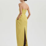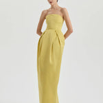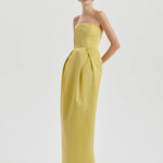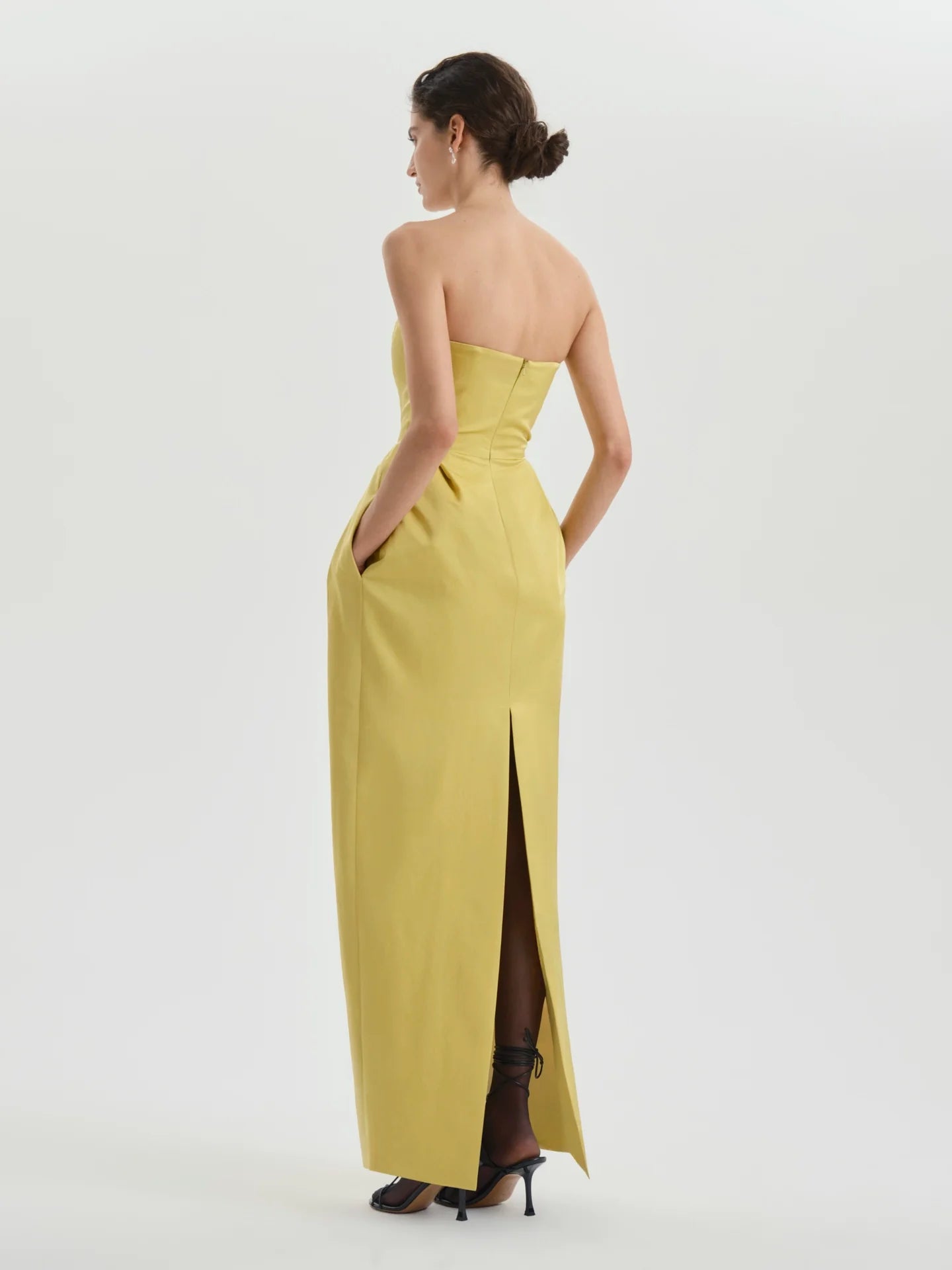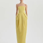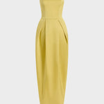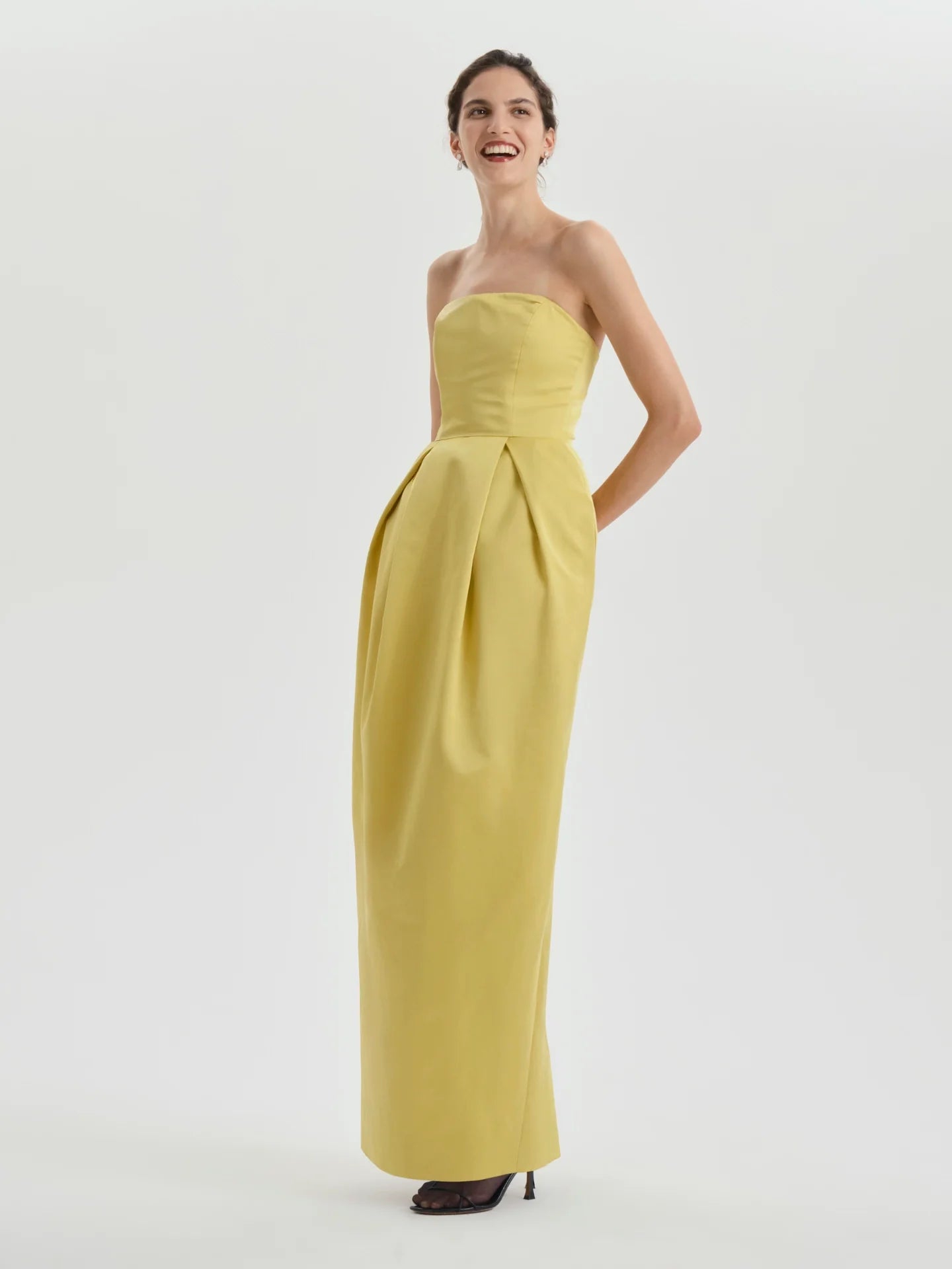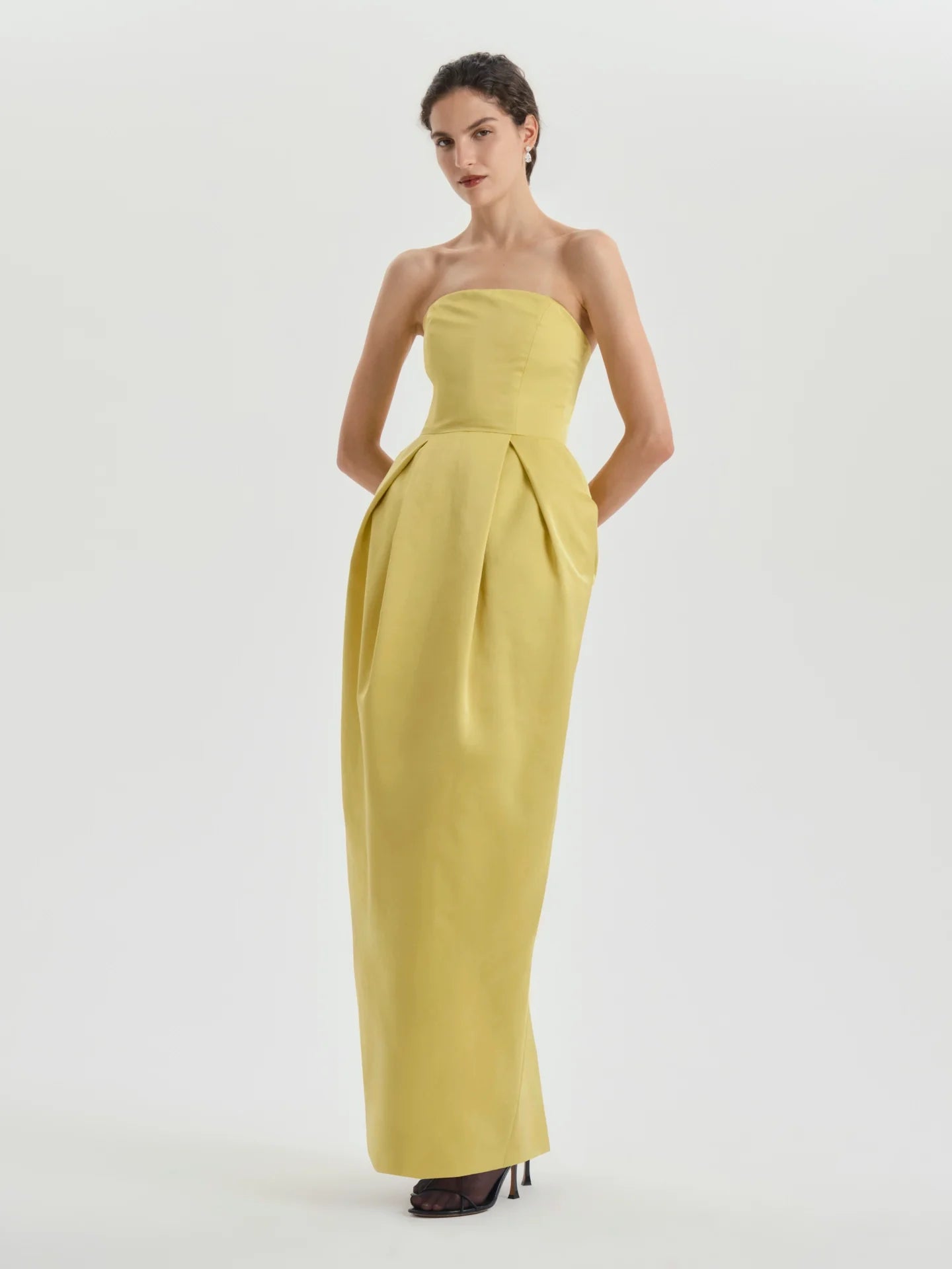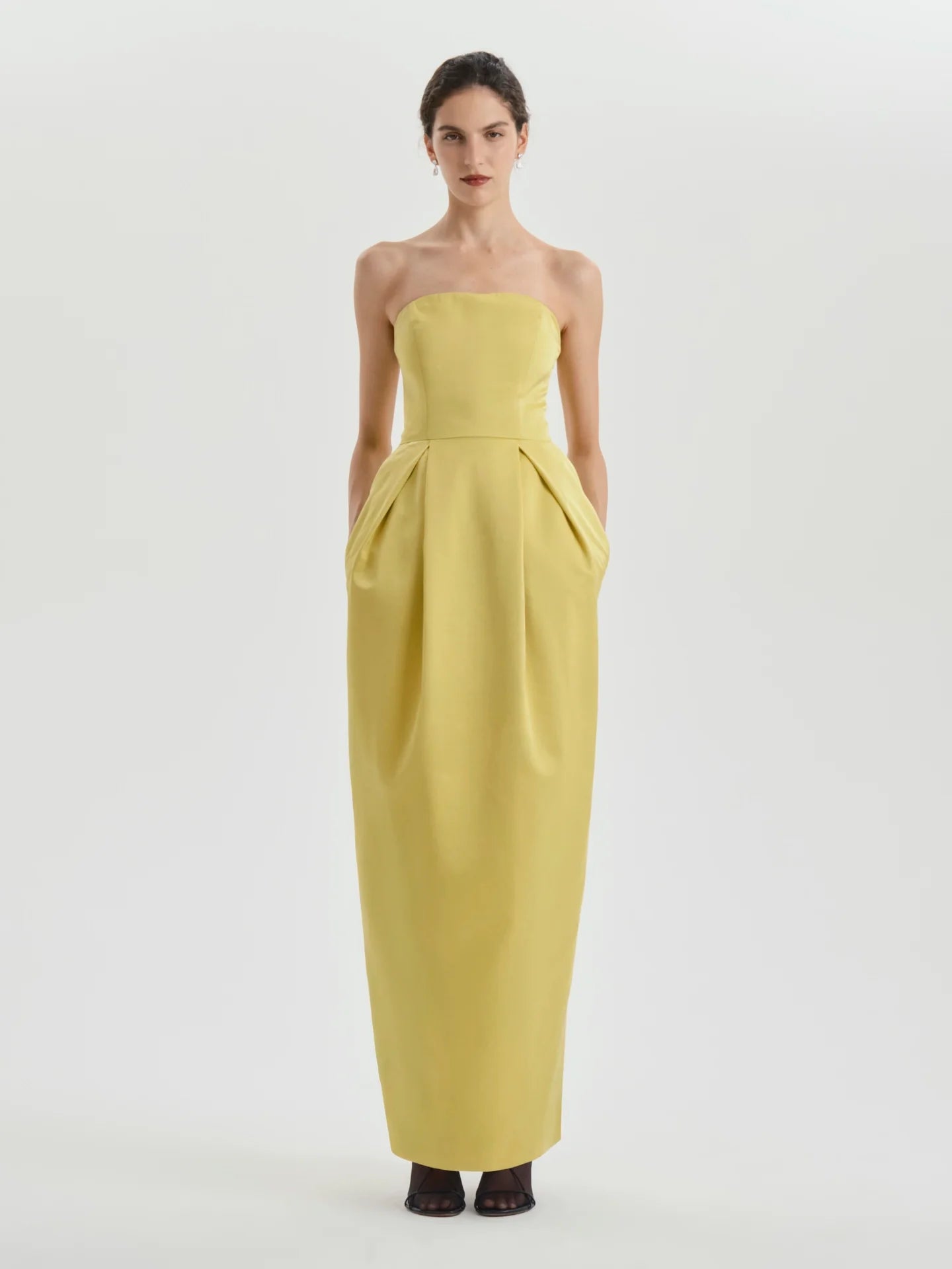 A floor length dress with a strapless, straight neckline, fitted bodice, and sculpted hips to create a refined hourglass silhouette. Made in a smooth and dry Italian wool & silk shantung with a lustrous, subtly textured finish.