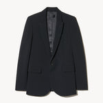Single breasted slim blazer. Logo horn button closure. Chest welt pocket. Flap pockets. Full length sleeve. Fully constructed. Chest piece. Darts at front. Center back vent. Fully lined.