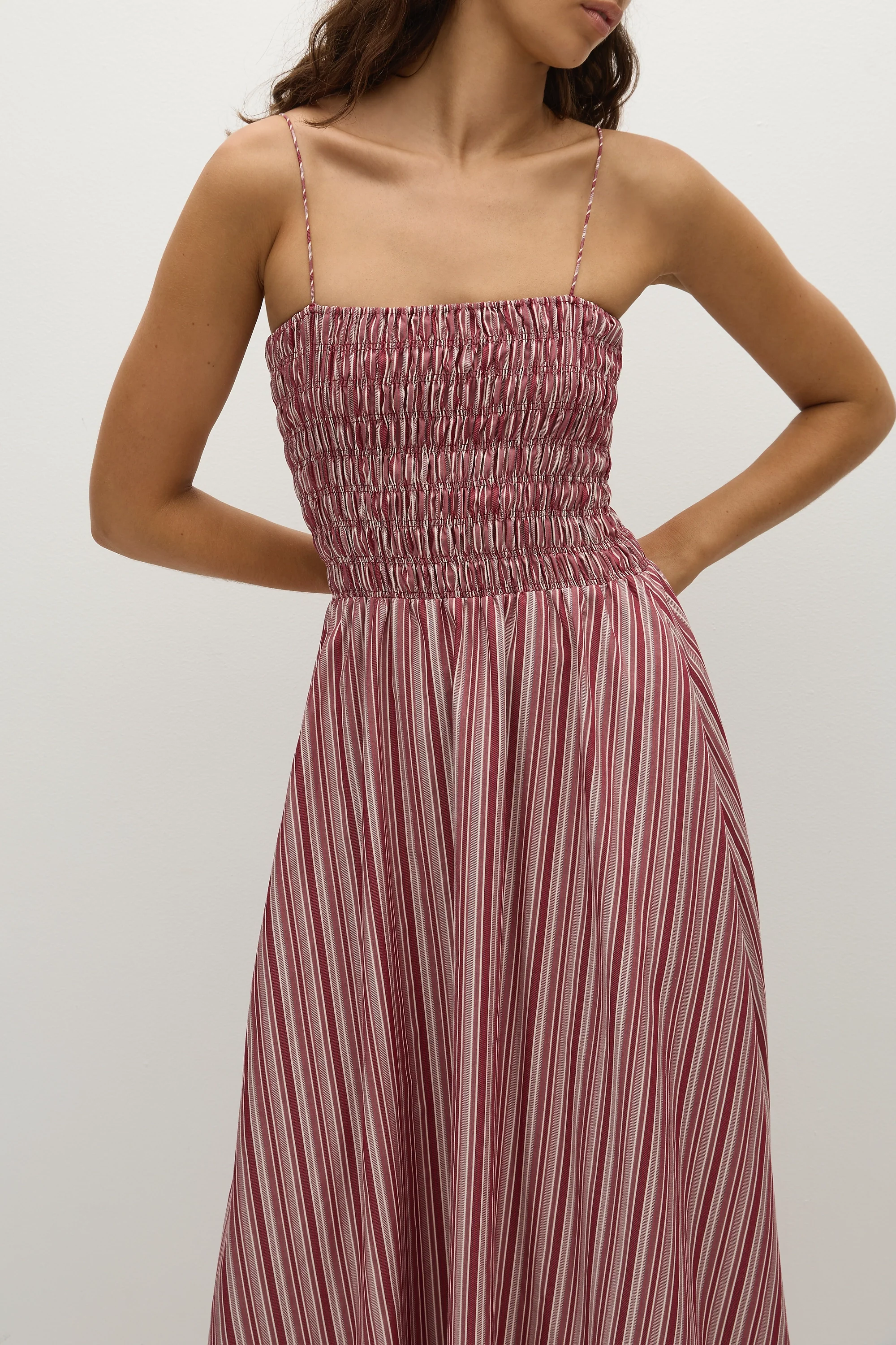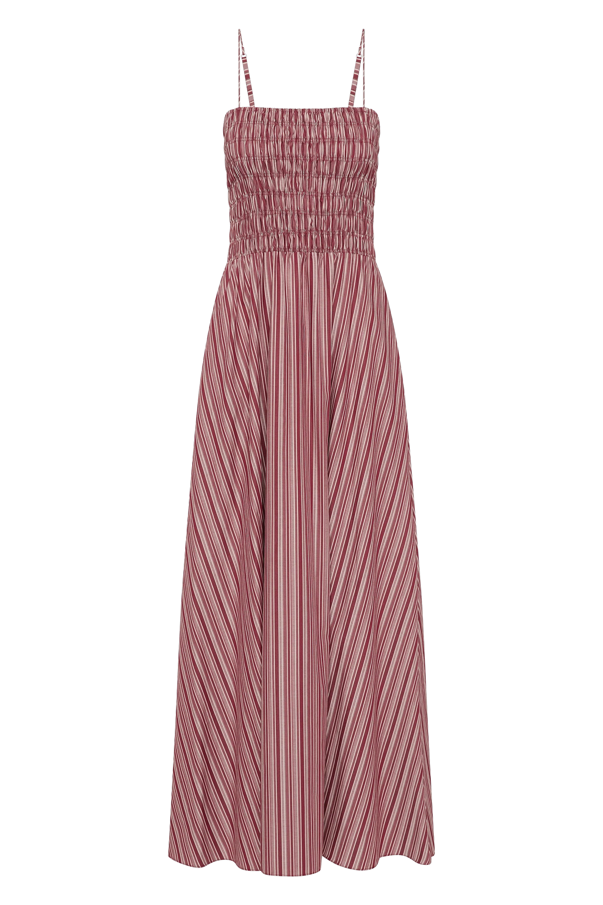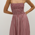 A vacation-inspired maxi dress with a straight neckline and thin delicate straps, adjustable in length. The bodice is fitted but shirred, offering additional stretch, before falling into a gathered waist with an A-line skirt that crops around the ankles. Designed from 100% BCI Certified organic cotton in a warm burgundy stripe, style with a simple sandal for effortless throw-on wear.
