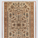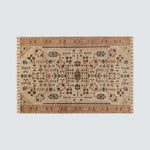 This exquisite area rug blends warm clays, beiges, and browns with pops of rich emerald for a uniquely unexpected color palette. Its hand-knotted pattern creates depth and texture, while intricate botanical motifs add visual sophistication.