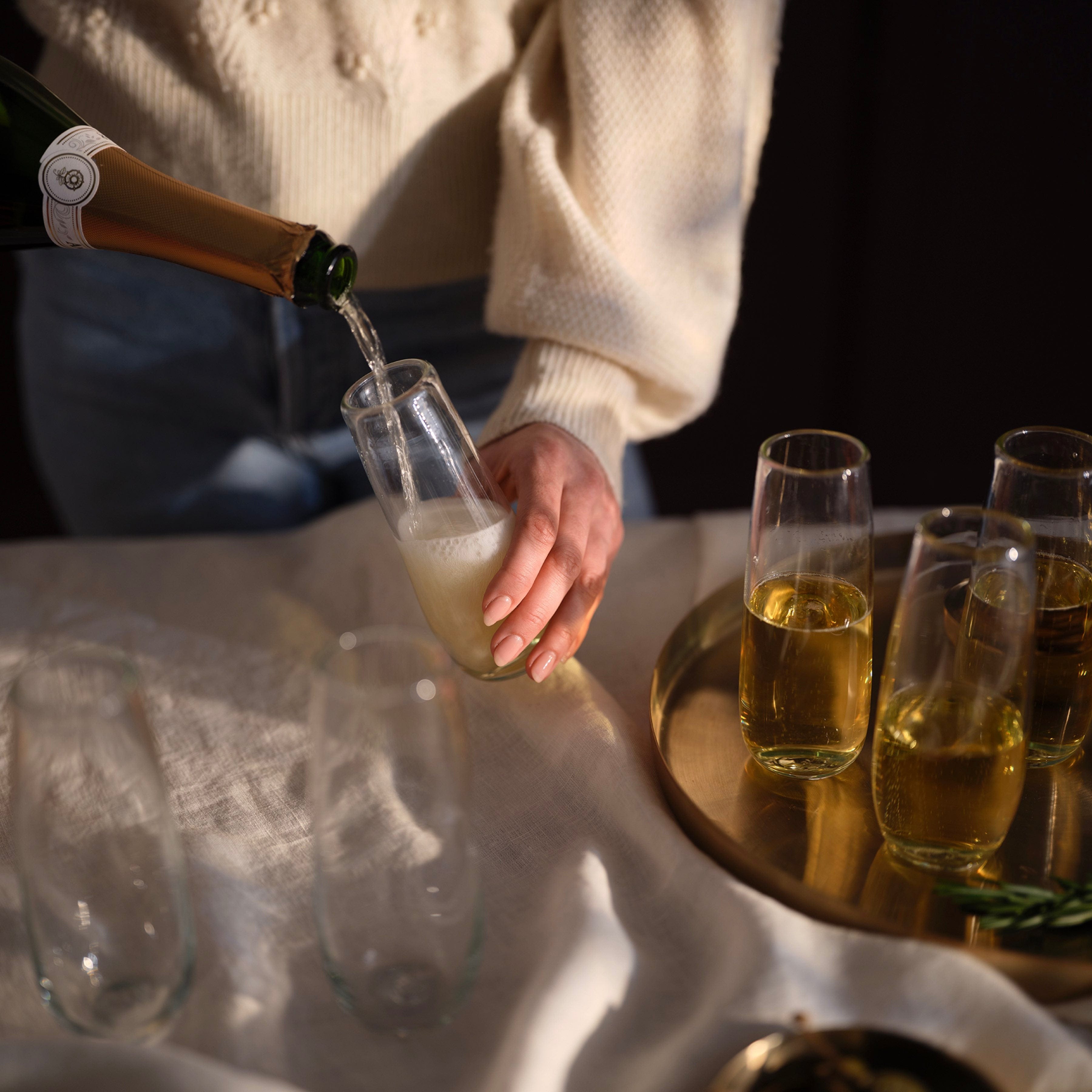 Happy hour just got a lot more interesting. Mixing handmade charm with effortless sophistication, these stemless flute glasses are an instant classic. Crafted with recycled glass from nearby villages in Oaxaca, these flutes are as durable as they are beautiful.