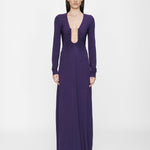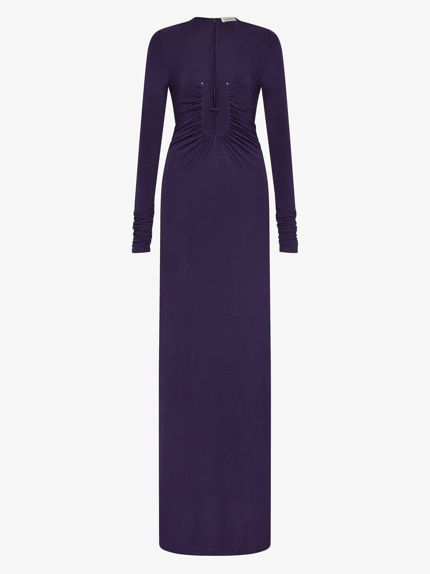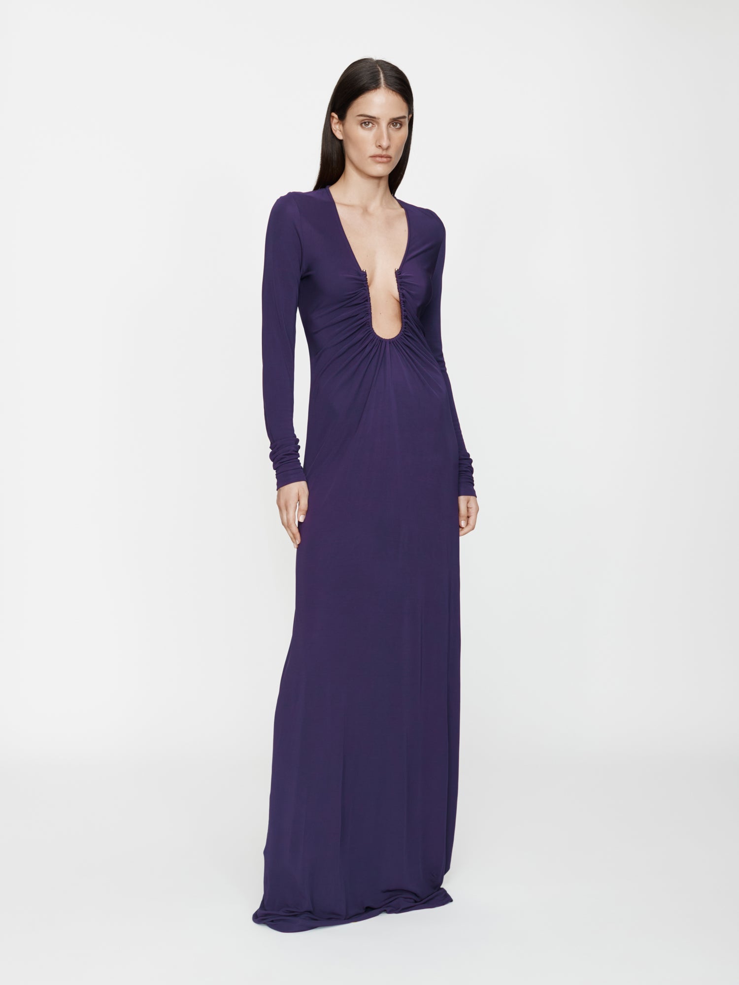 Cut in lightweight jersey, the silhouette falls to a floor-skimming hem. Featuring a plunging neckline framed by delicate gold hardware and gathered ruching centre.