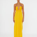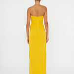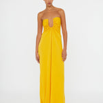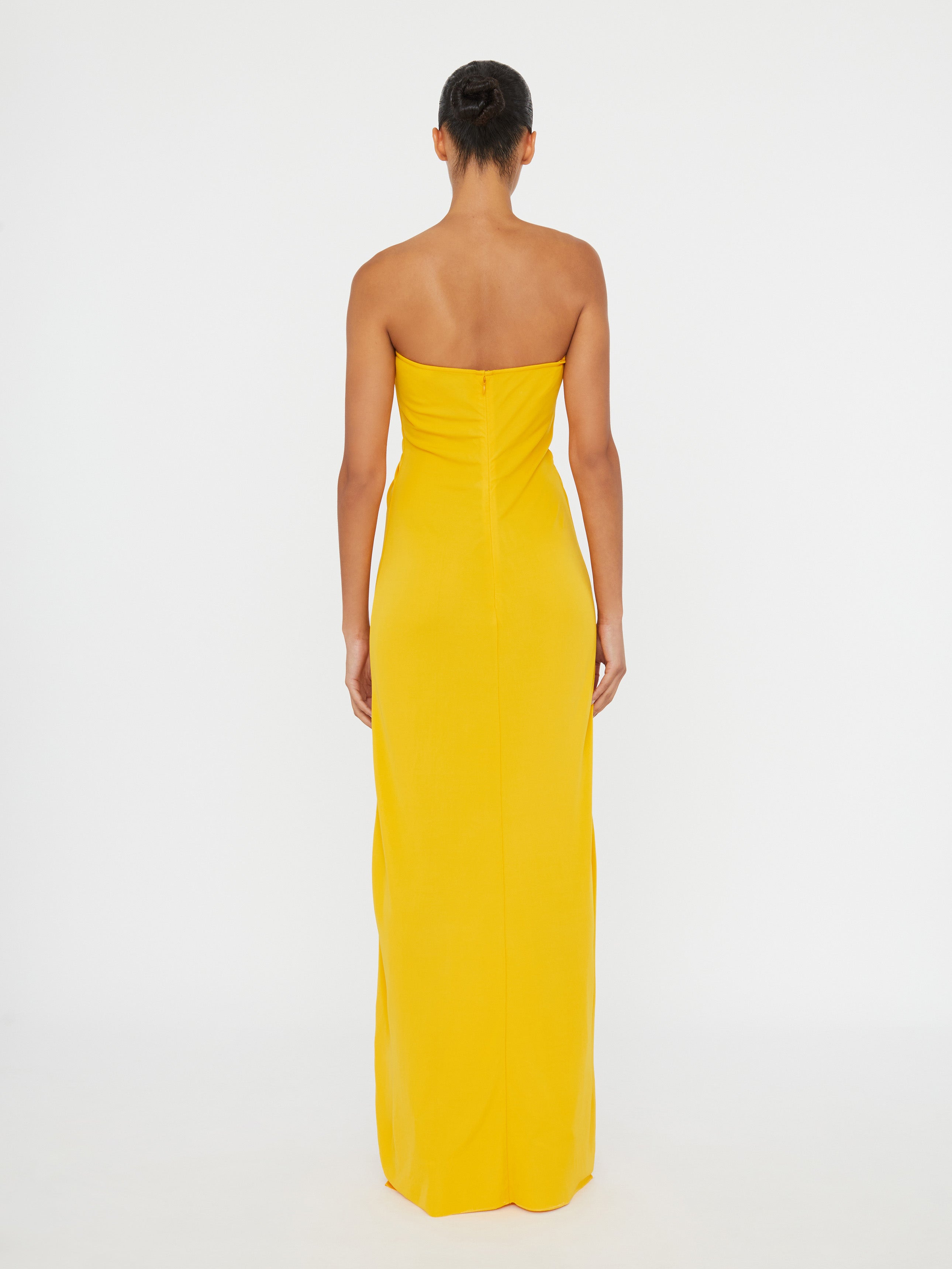 Sculptural hardware anchors a plunging neckline. This strapless maxi dress is crafted in a fine jersey that ruches and defines the waist.
