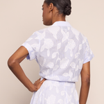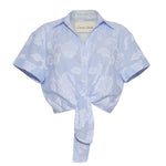 Cropped button down shirt with front button opening. Tie front bow detail. Short sleeve with cuff. Elastic at back hem for adjustability. Unlined. Striped floral fabric with textured details.
