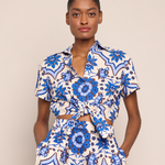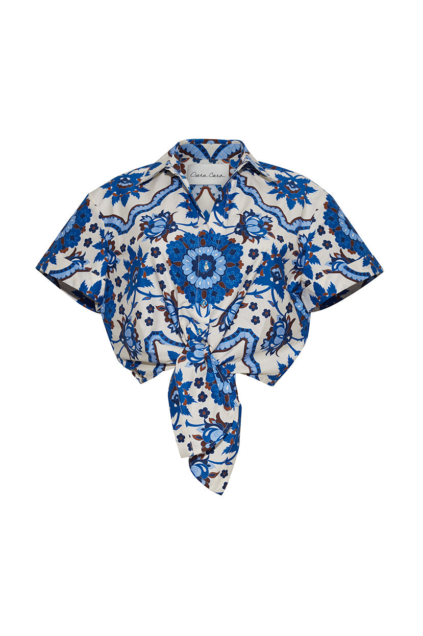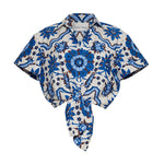 Cropped button down shirt with front button opening. Tie front bow detail. Short sleeve with cuff. Elastic at back hem for adjustability. Unlined. Placed print.