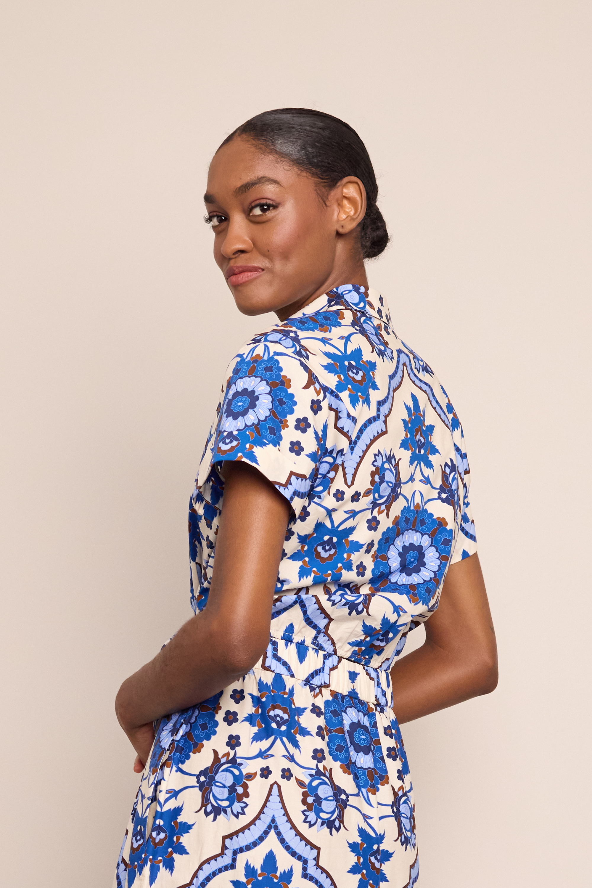 A reimagined classic short sleeve button up, the Asbury Top adds an extra dose of ease and glamour to an everyday basic. The cropped shirt features a button opening, cuffed sleeve and a front tie bow detail.