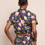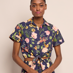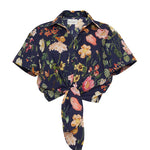 Cropped button down shirt with front button opening. Tie front bow detail. Short sleeve with cuff. Elastic at back hem for adjustability. Unlined. Allover print.