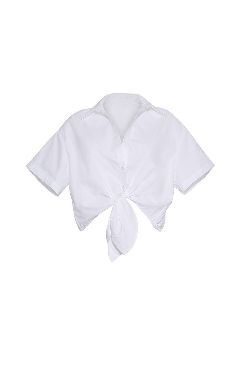 A reimagined classic short sleeve button up, the new Asbury Top adds an extra dose of ease and glamour to an everyday basic. The cropped shirt features a button opening, cuffed sleeve and a front tie bow detail. Pair with our Palmer Short or an easy skirt for your summer picnics or lunch in town.