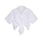 Cropped button down shirt with front button opening. Tie front bow detail. Short Sleeve with cuff. Elastic at back hem for adjustability. Unlined.