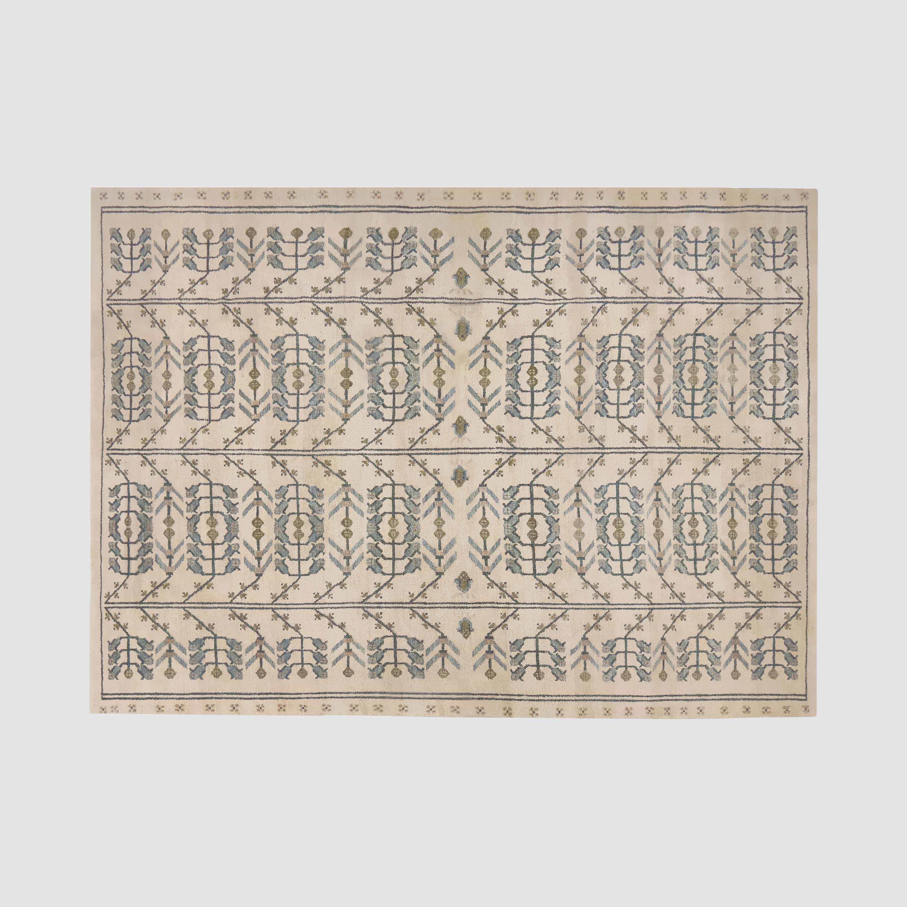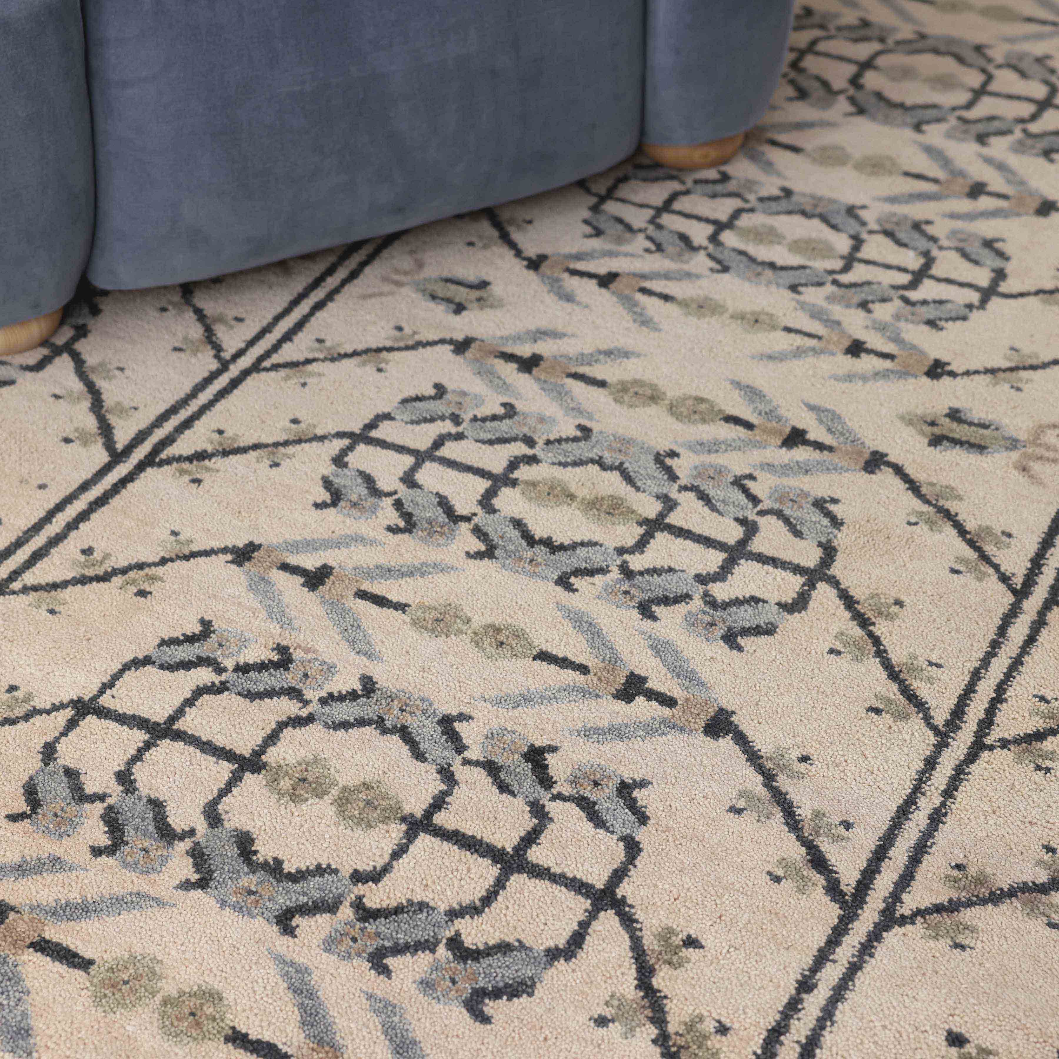 Crafted with heritage design and technique, this hand-knotted wool rug offers a sense of quiet, yet bold, artistry. Geometric stems and a muted palette unfold across the surface, in your choice of warm rose or dusty blue.