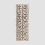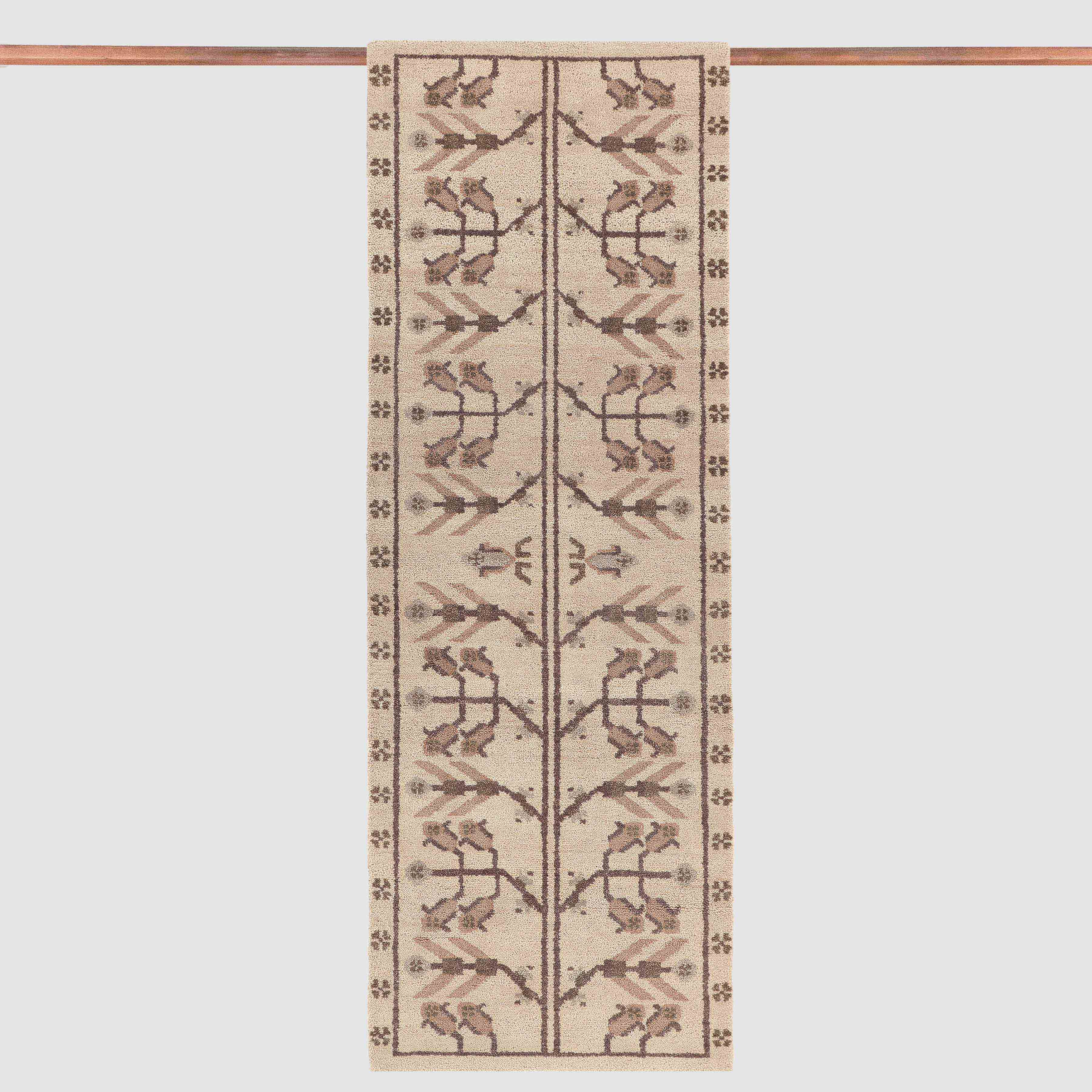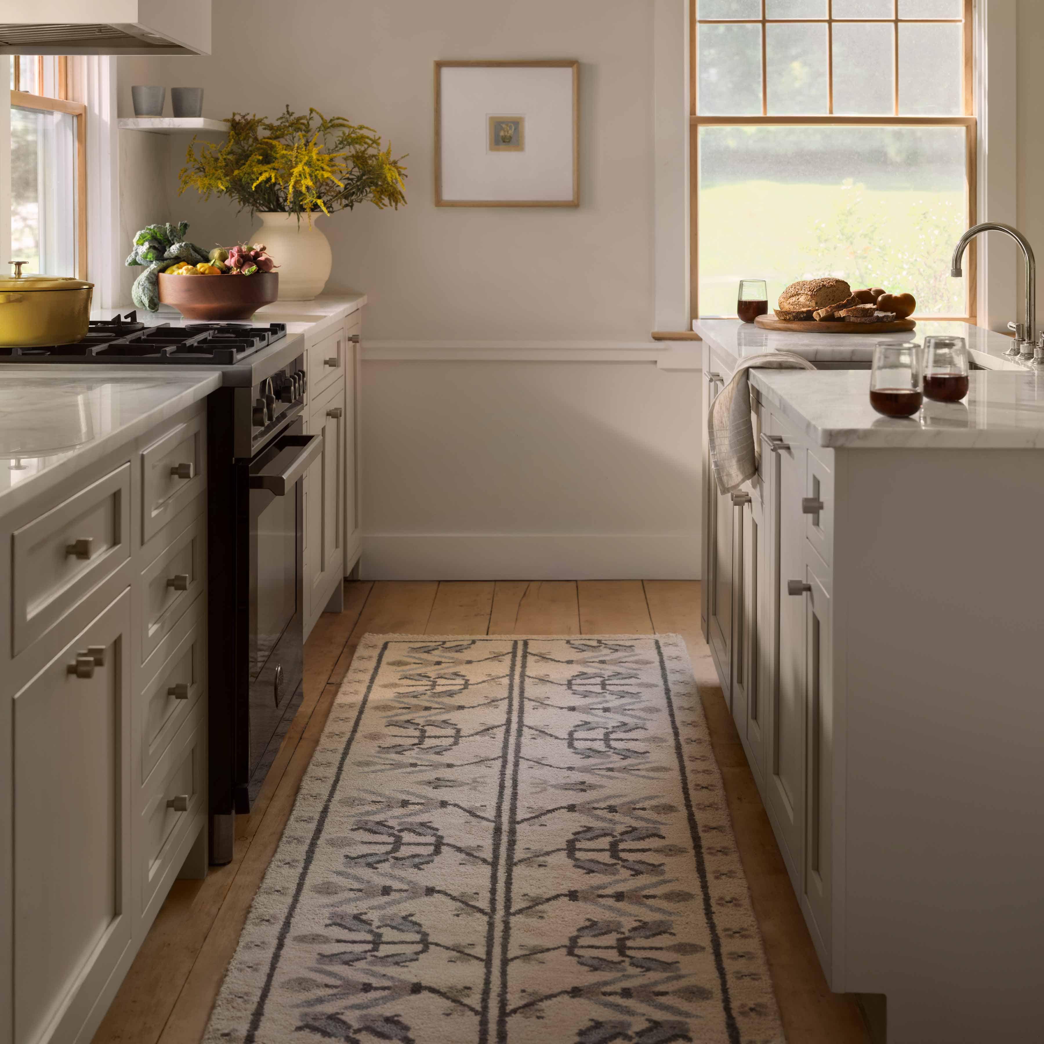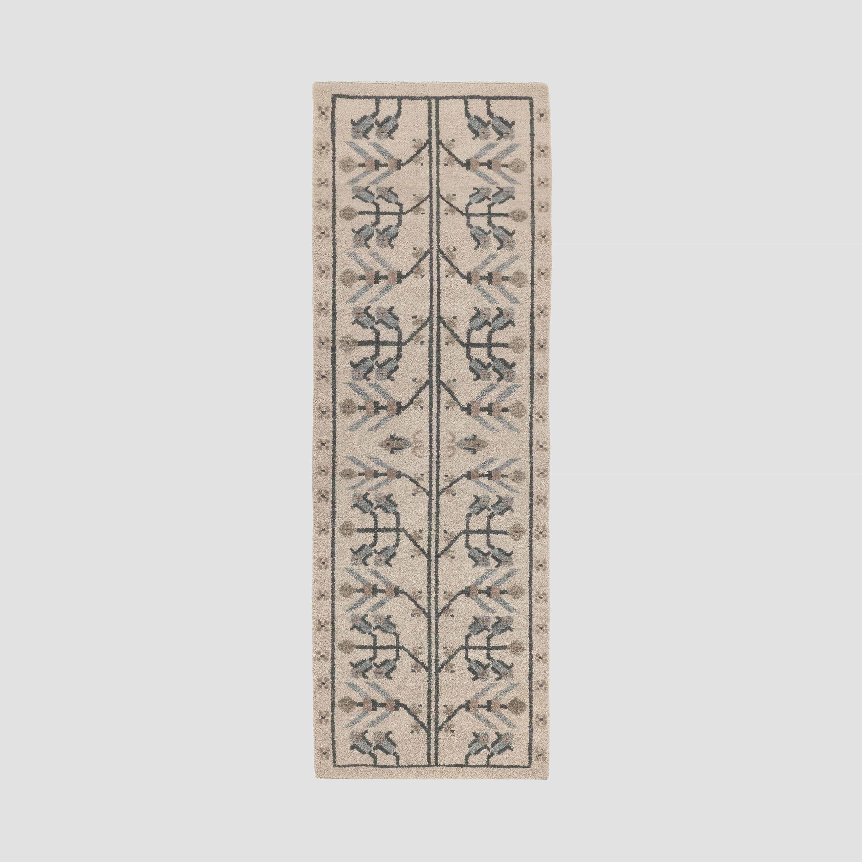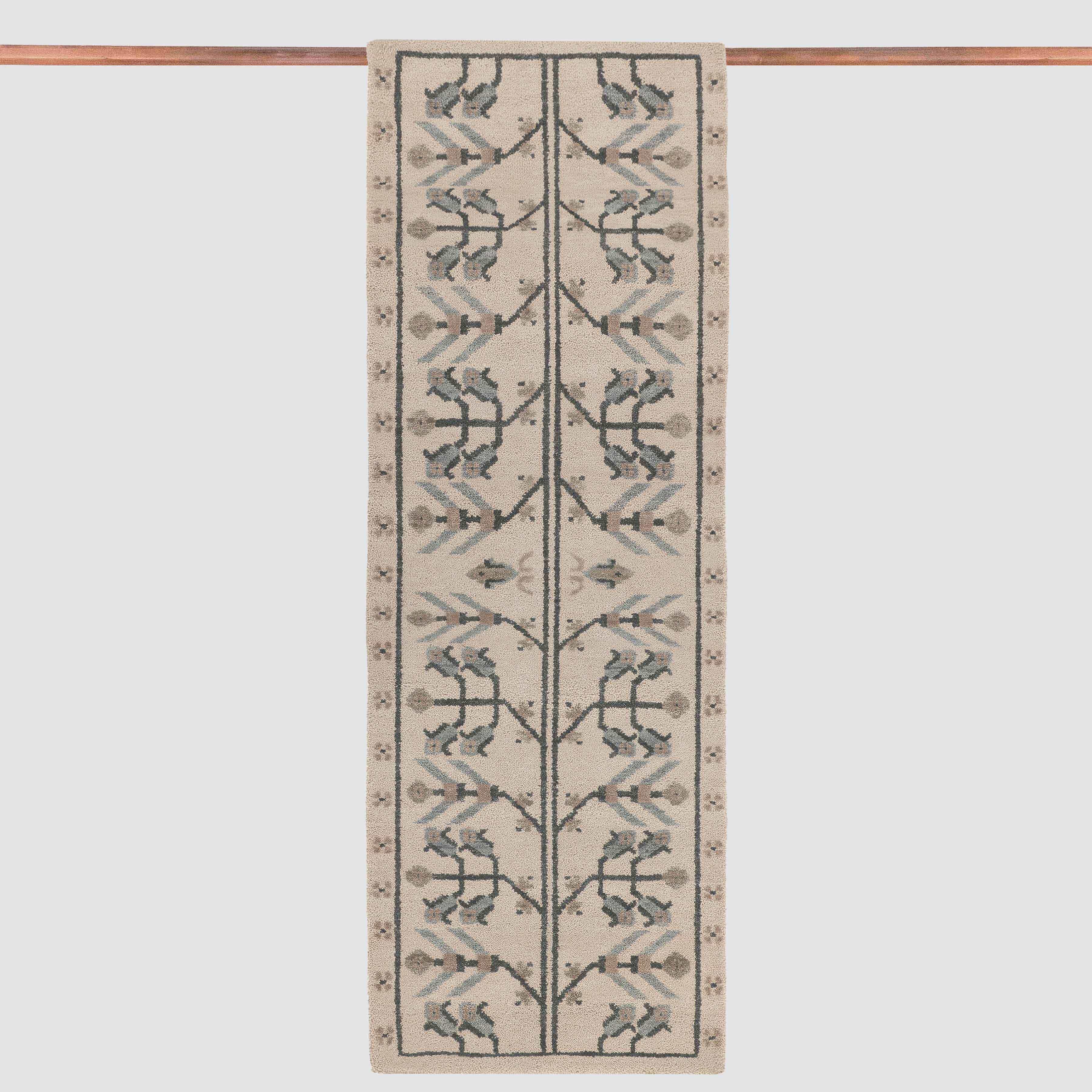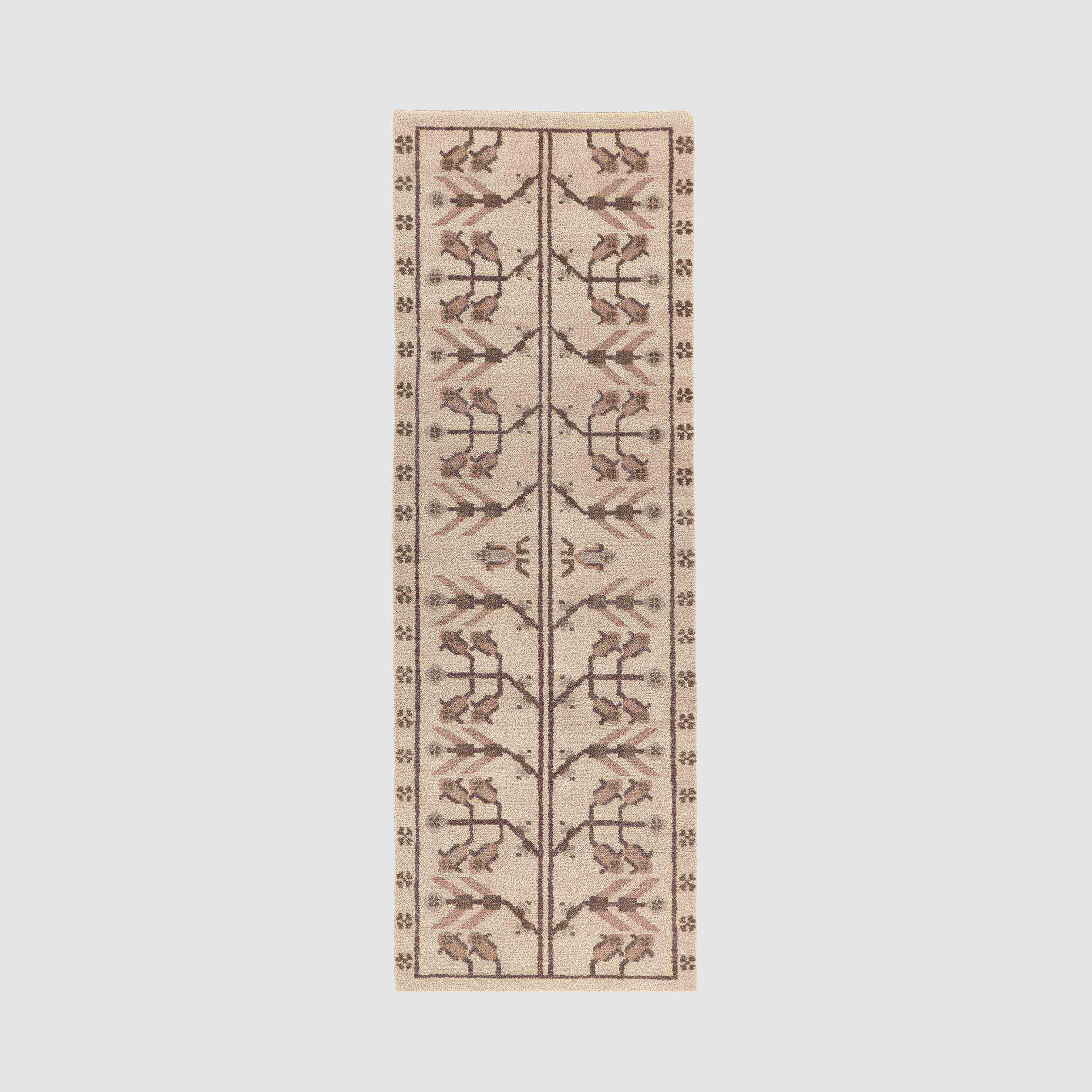 Crafted with heritage design and technique, this hand-knotted wool rug offers a sense of quiet, yet bold, artistry. Geometric stems and a muted palette unfold across the surface, in your choice of warm rose or dusty blue.