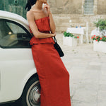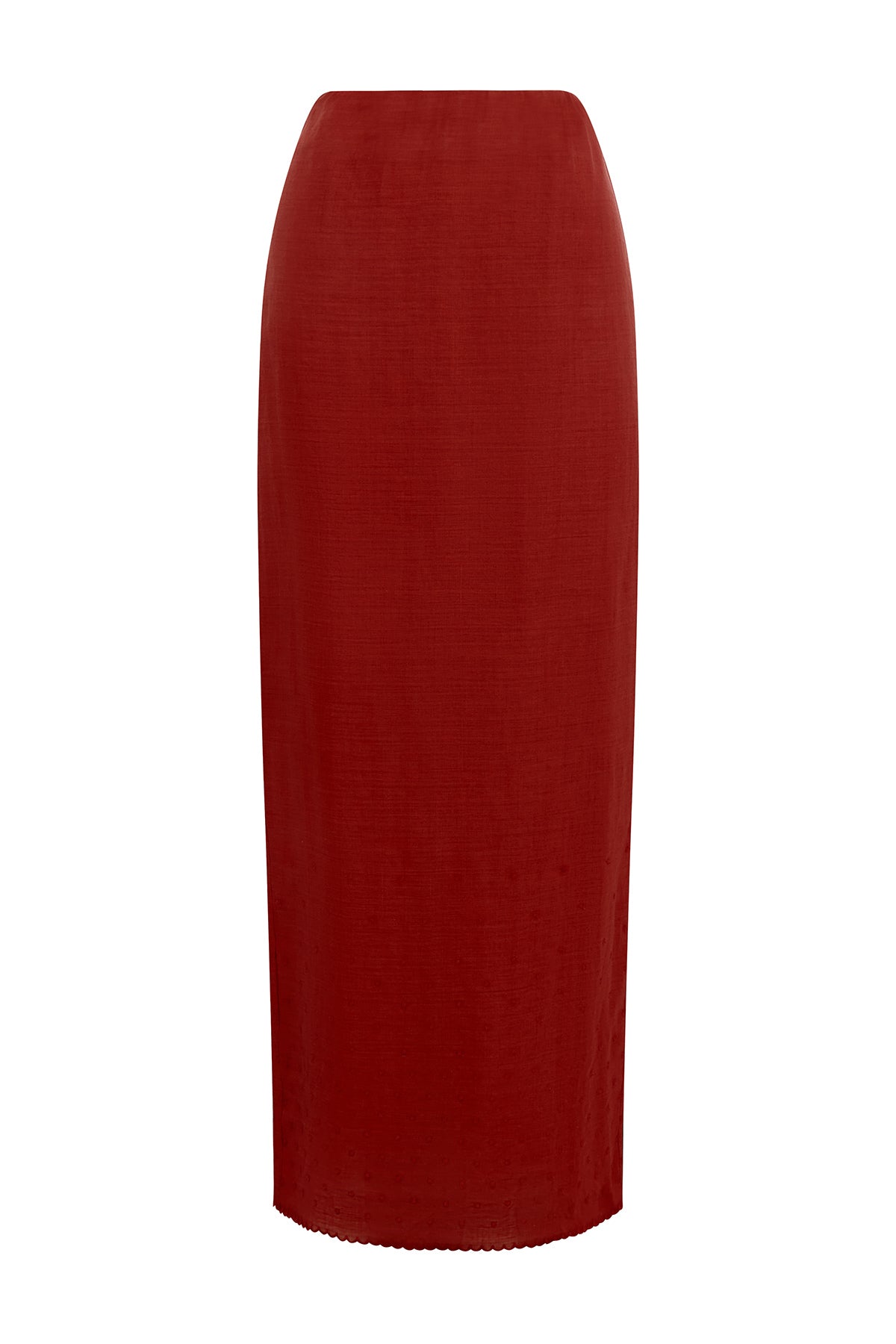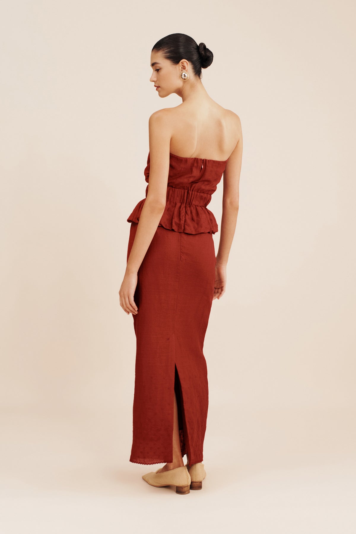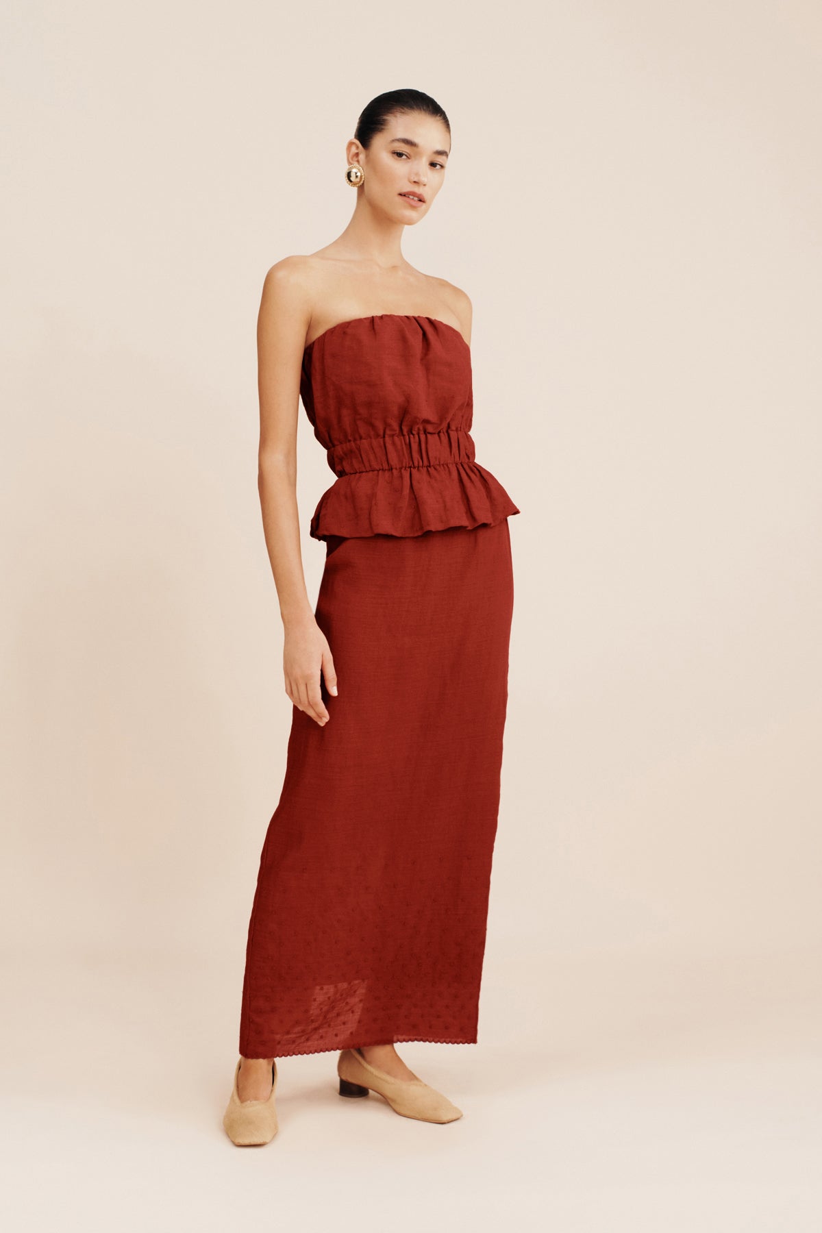 Adorned with intricate polka dot embroidery throughout, the Aurelia Skirt is crafted from soft, lightweight ramie in a classic pencil silhouette. Designed to sit high on the waist, it falls to an elegant maxi hem with a statement split at the back to allow for movement. Style yours as a set with the coordinating Aurelia Strapless Top.