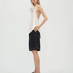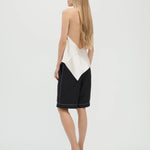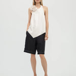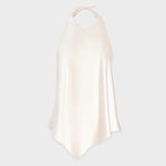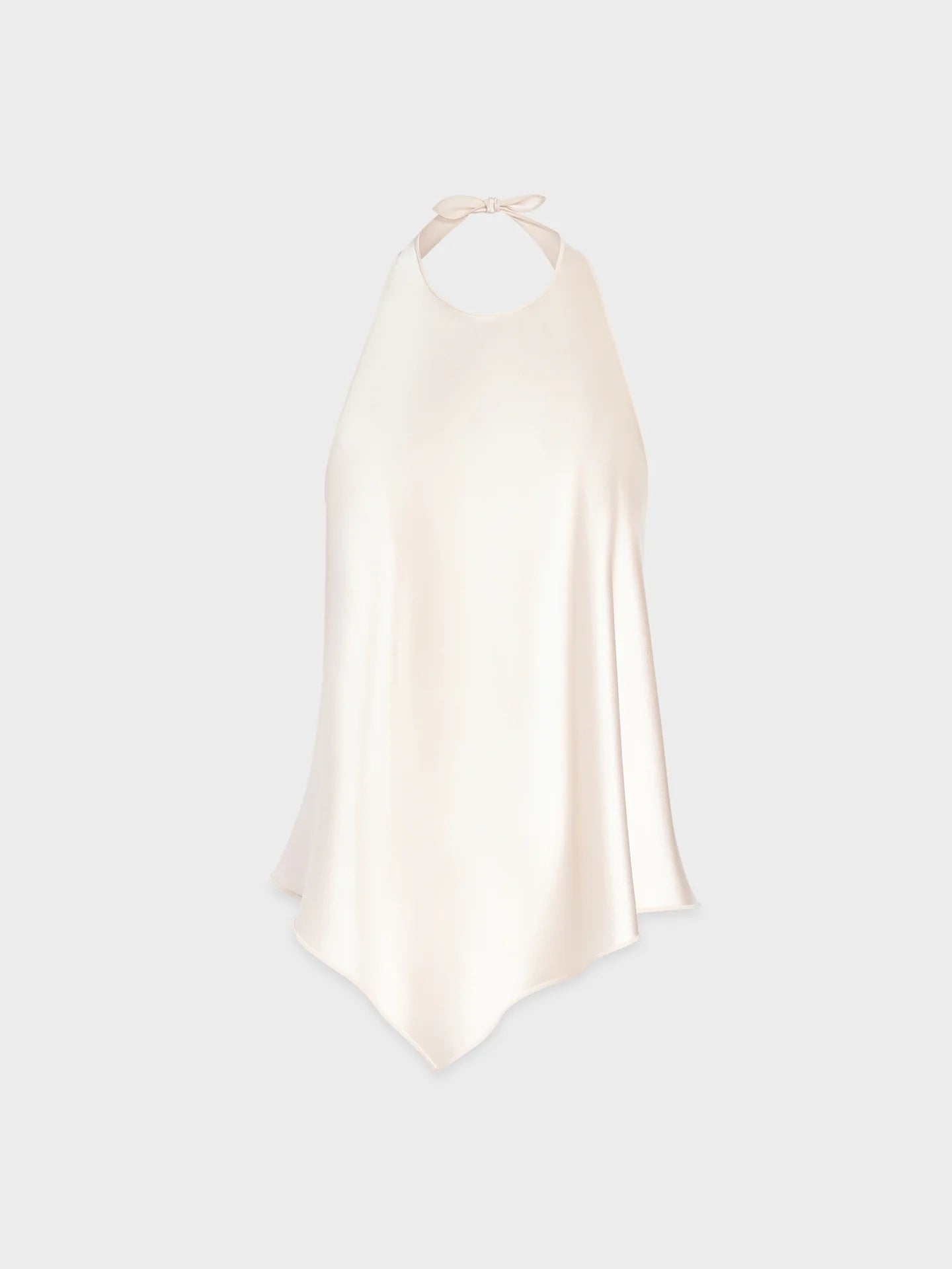 This is a halter top with a back-neck tie closure, asymmetric front, hand-draped open back, and inside-out seam detailing. Cut for a relaxed fit on the body, the heavyweight, glossy silk satin has a liquid softness that enhances the top's rich flowing lines.