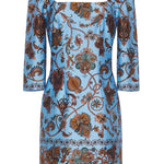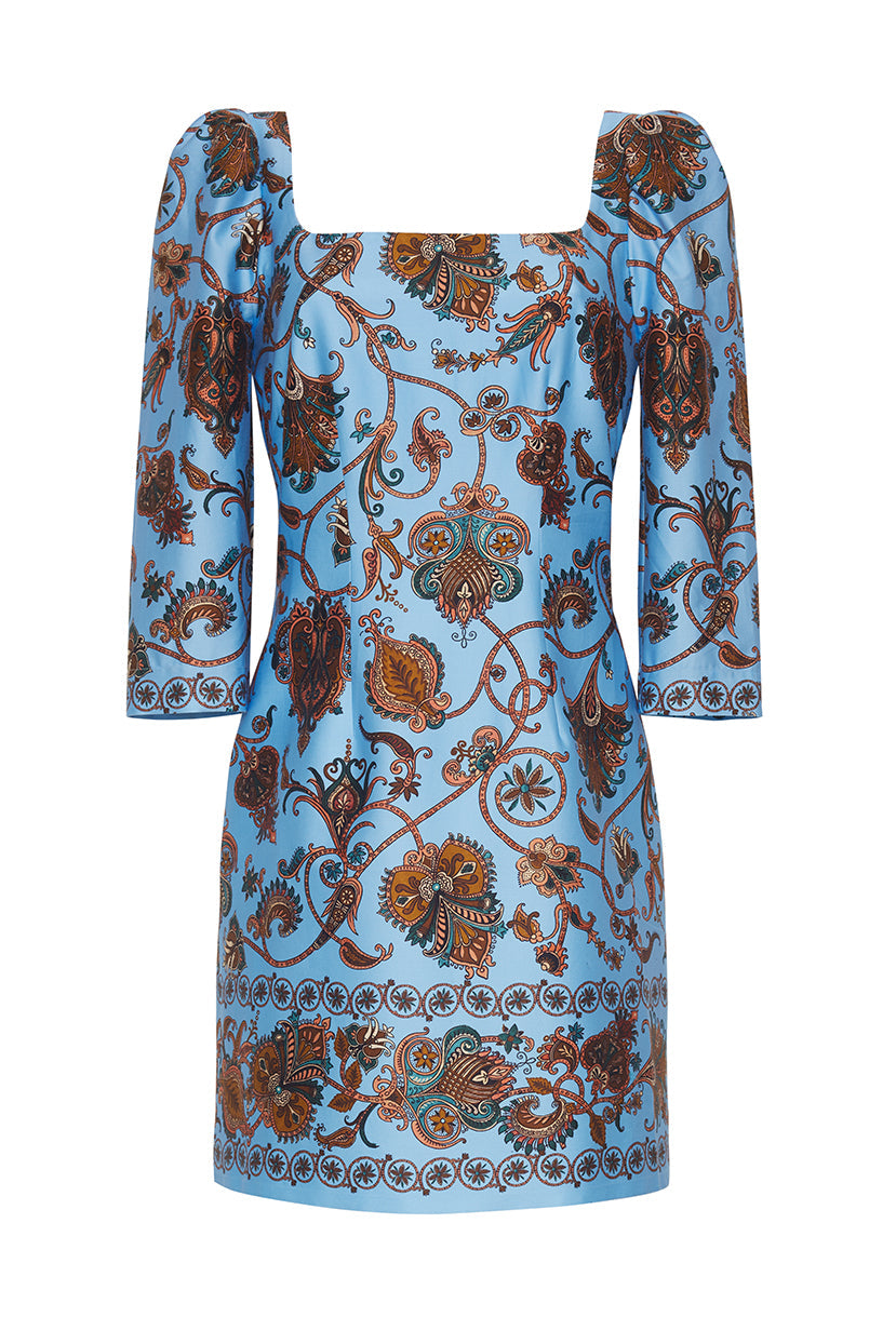 Slim fit. Square neckline. Three-quarter inside puff sleeves. Lined. Bra loop at internal shoulder seam. Waist darts and bust dart for shaping. Allover print.
