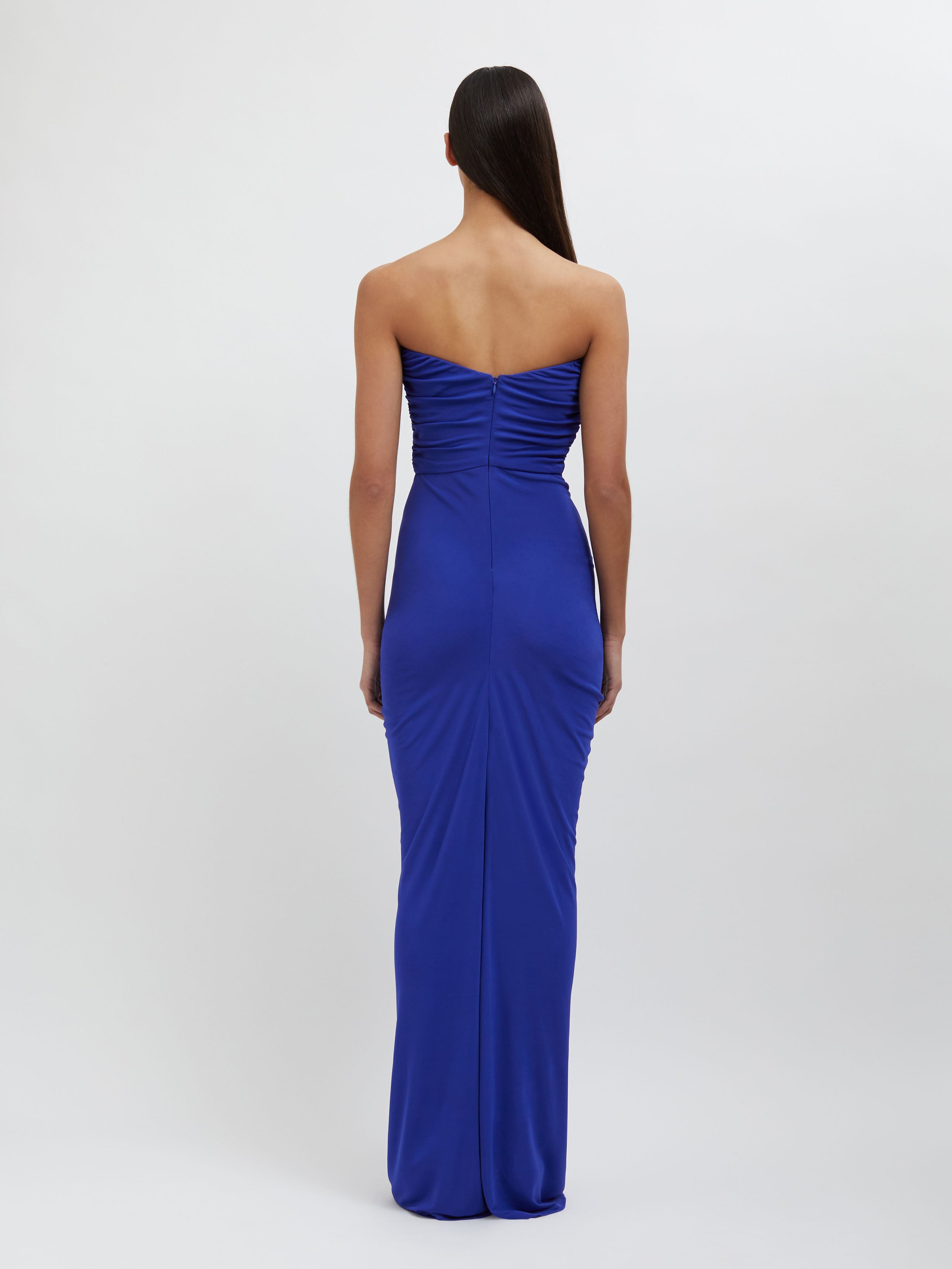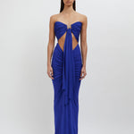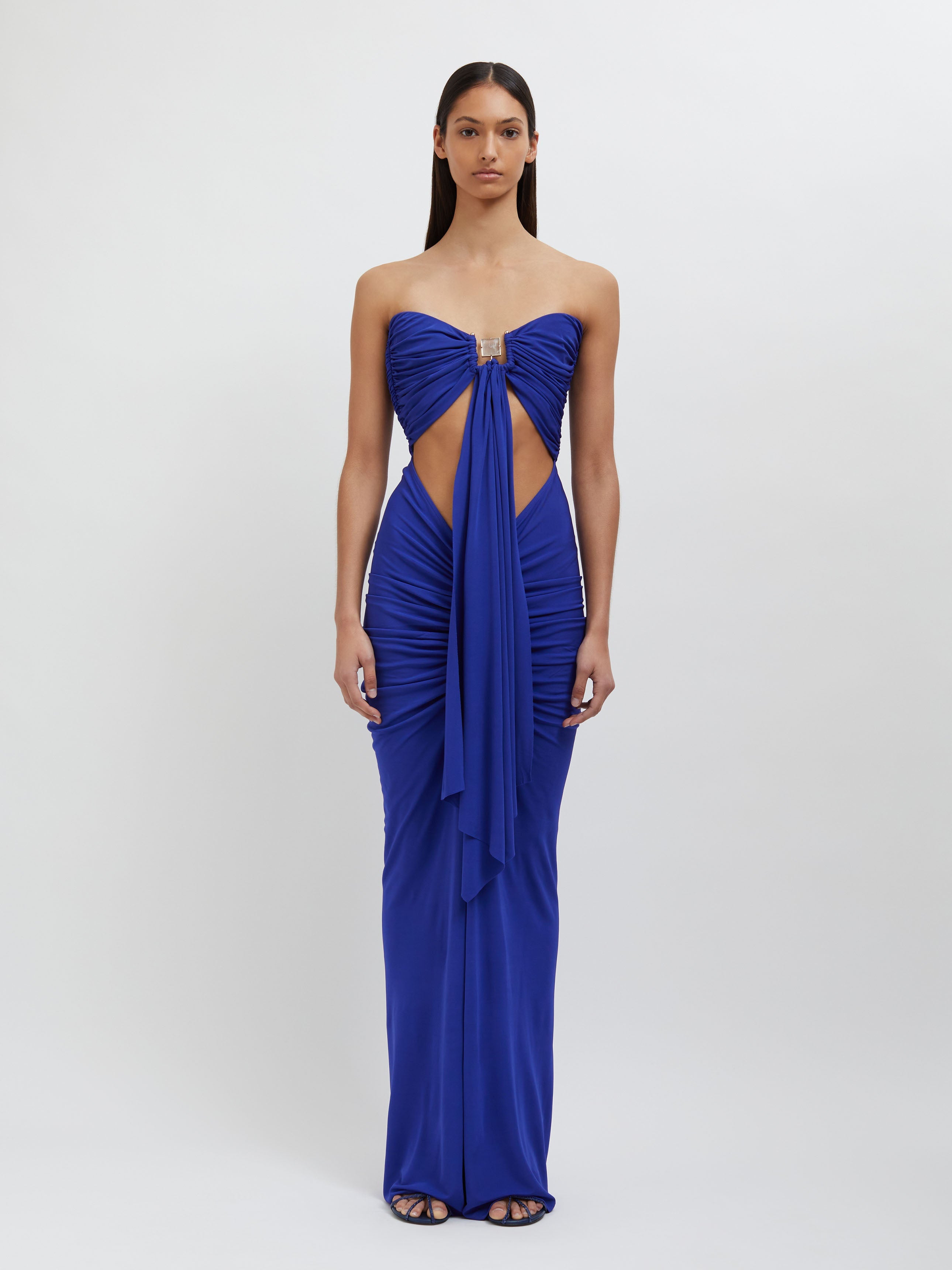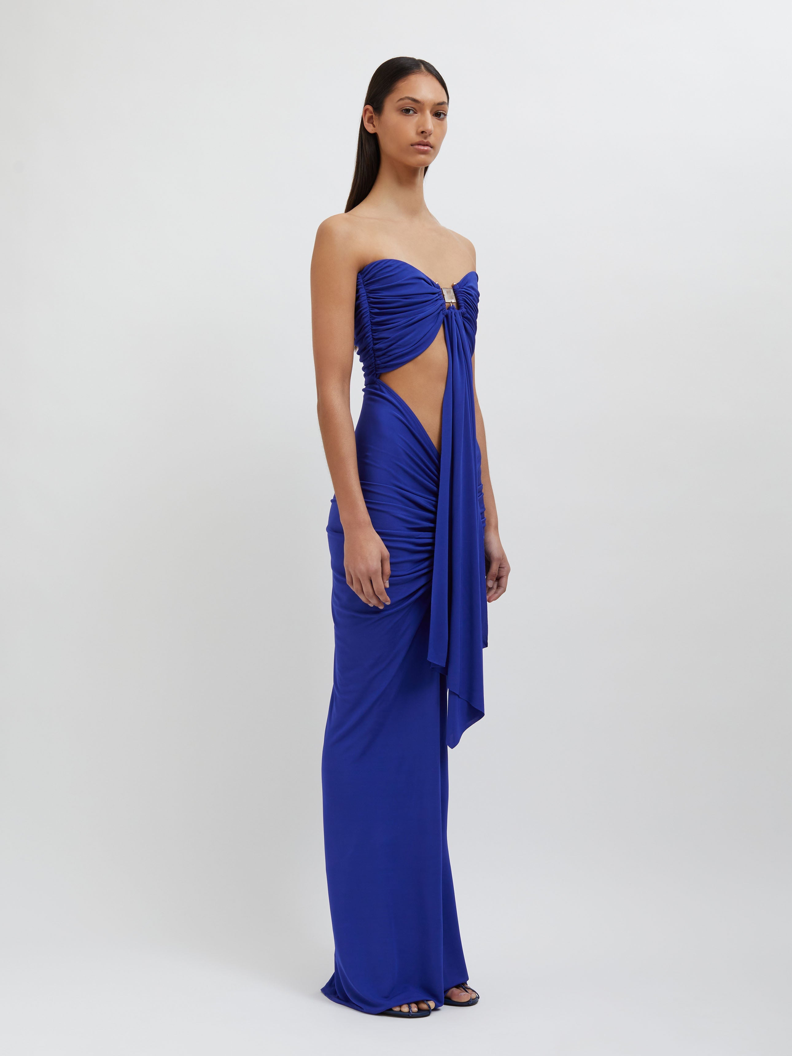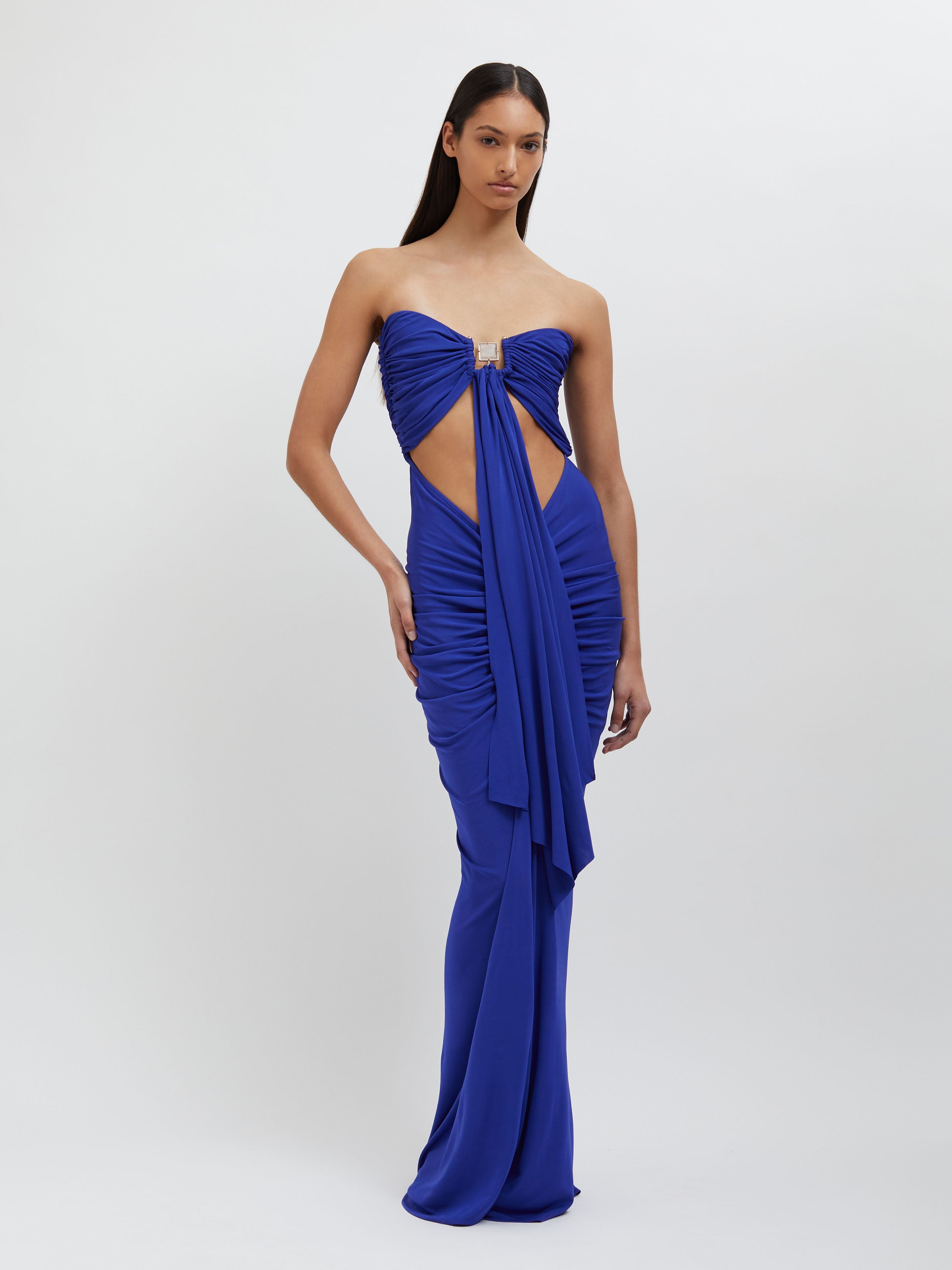 A strapless draped gown adorned with our signature bezel hardware and natural clear quartz, with properties that balances emotion, dispels negativity and enhances mental clarity.