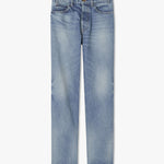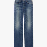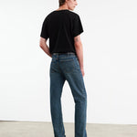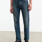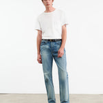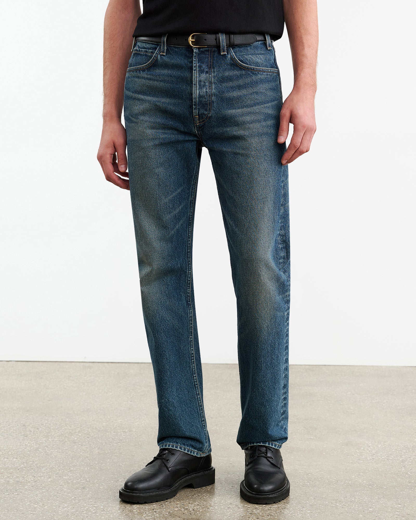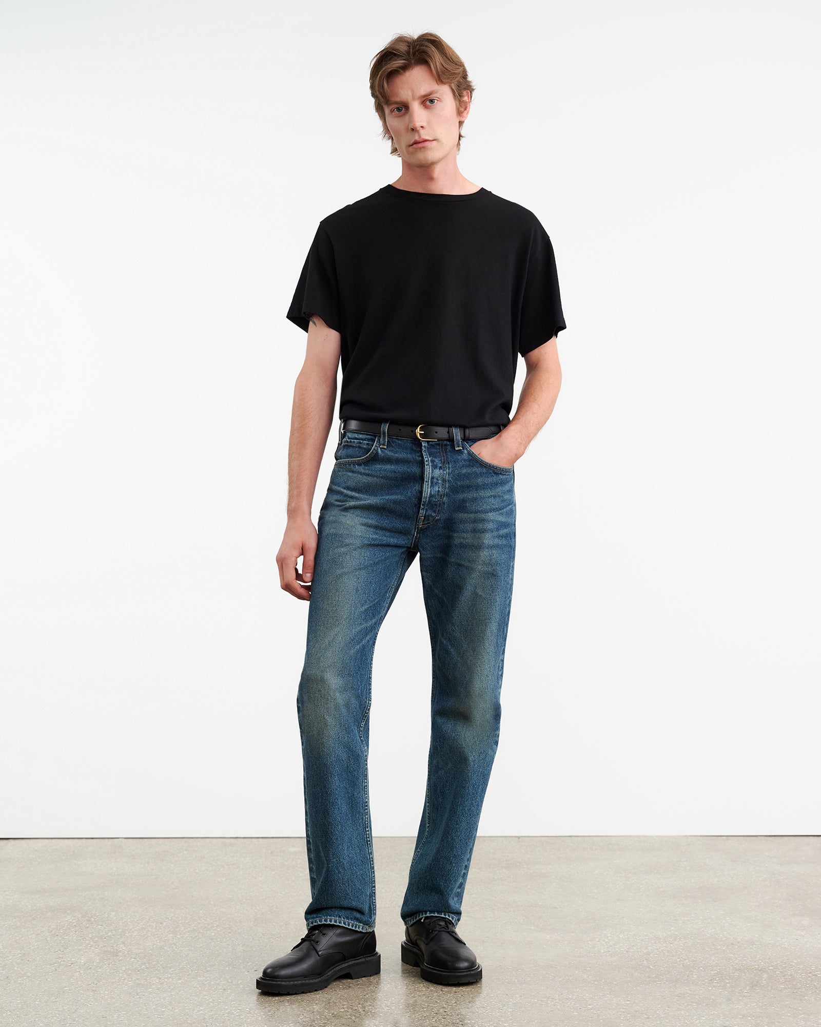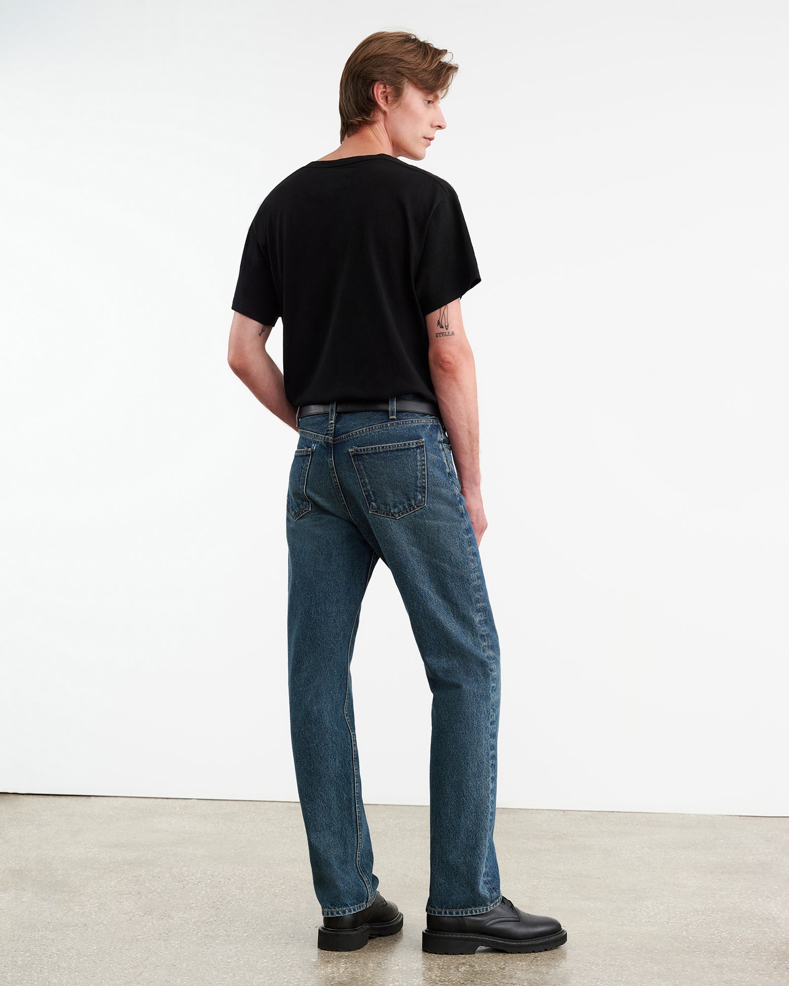 Mid-rise straight leg jean Japanese crosshatch denim. Five pocket details. Zip fly. Shank closure. Belt loops.