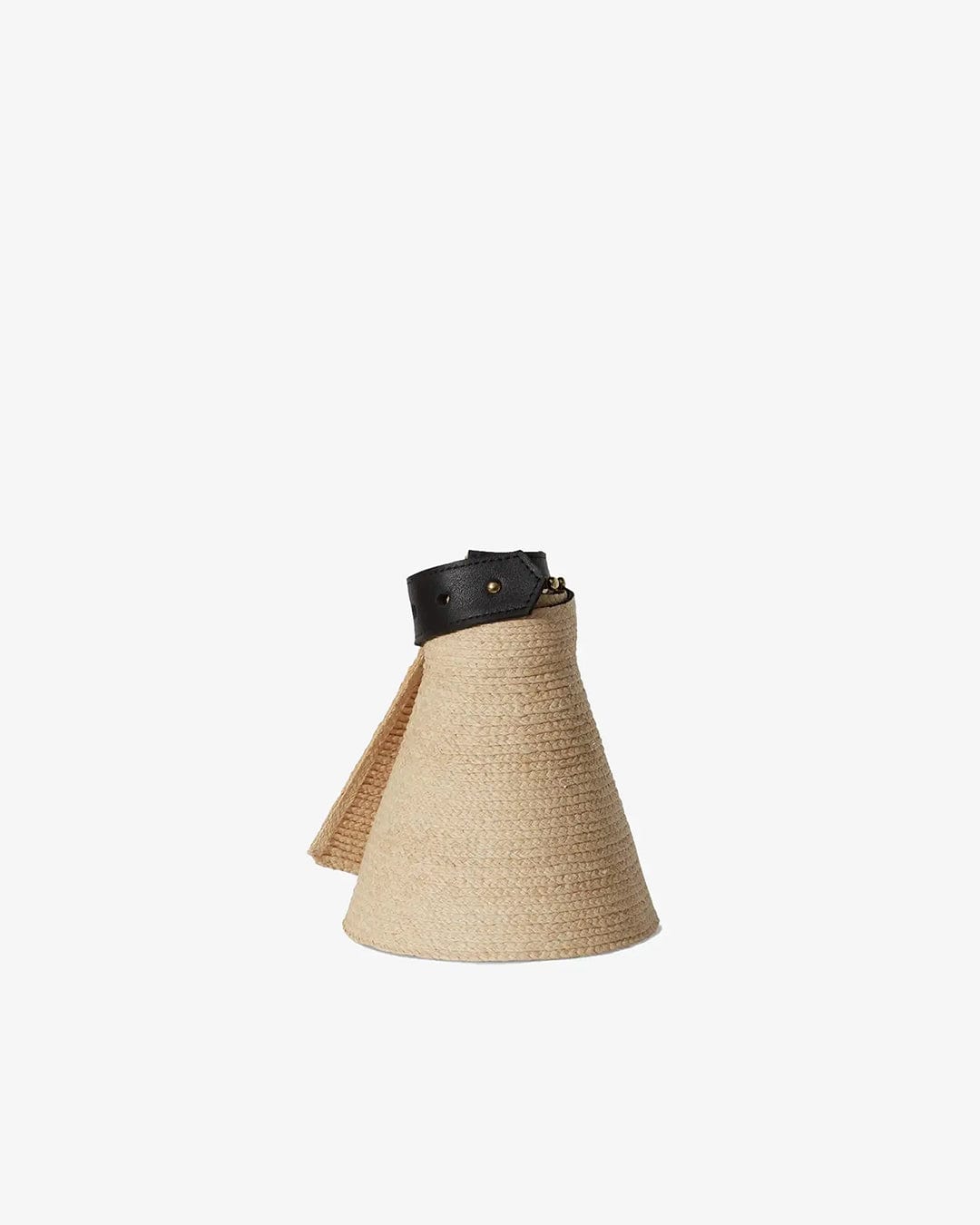 Birdie is an adjustable visor crafted from raffia straw, finished with a regenerative leather closure. This visor can be rolled up for ease of packing.