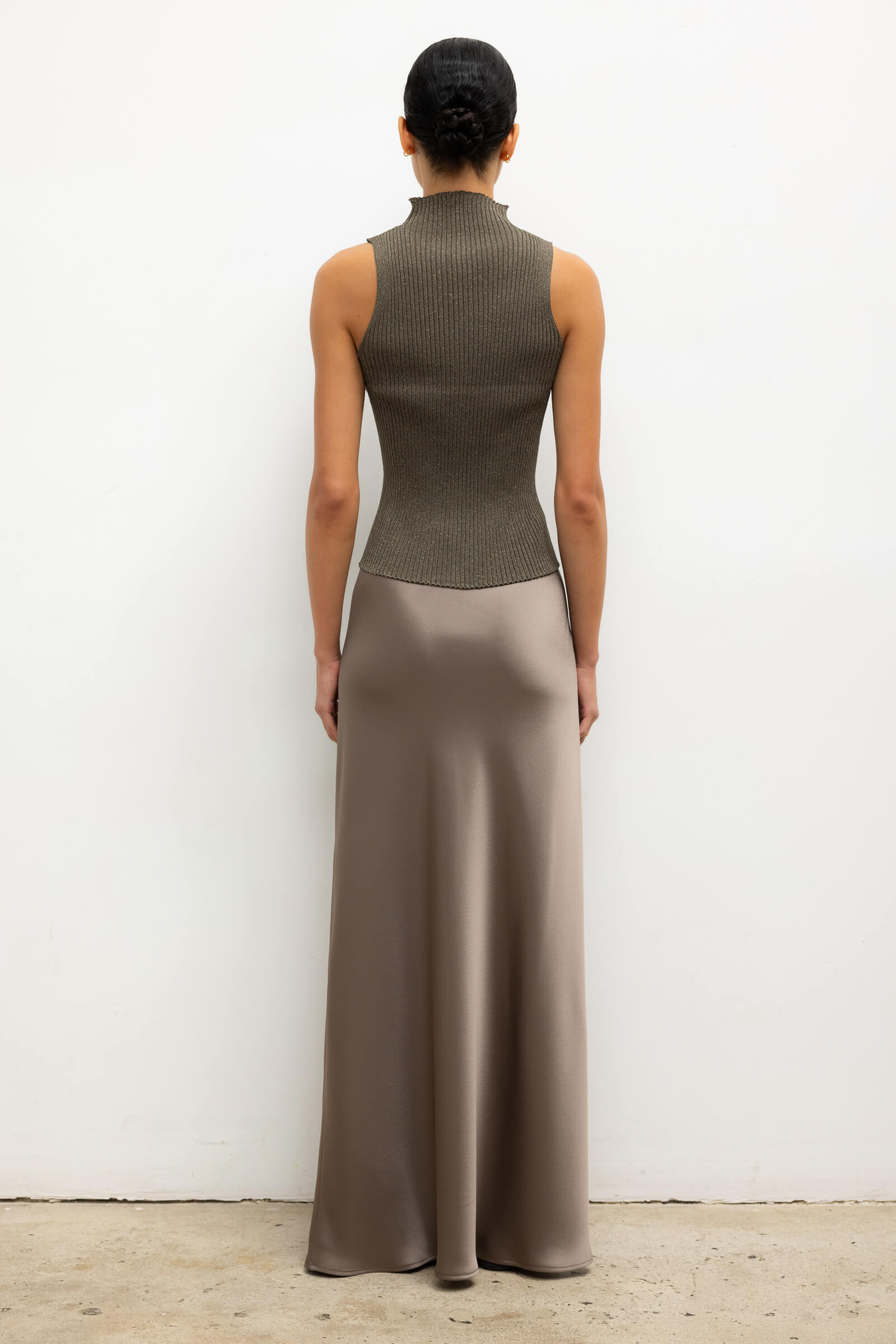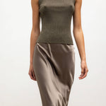 Knit in our extra fine Blake Lurex, The Blake Rib Crew Cardigan is a close fitting shell silhouette finished with a high neckline. Make it a matching set with The Blake Rib Crew Cardigan or mix it tonally with The Barb Set in Taupe.