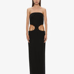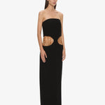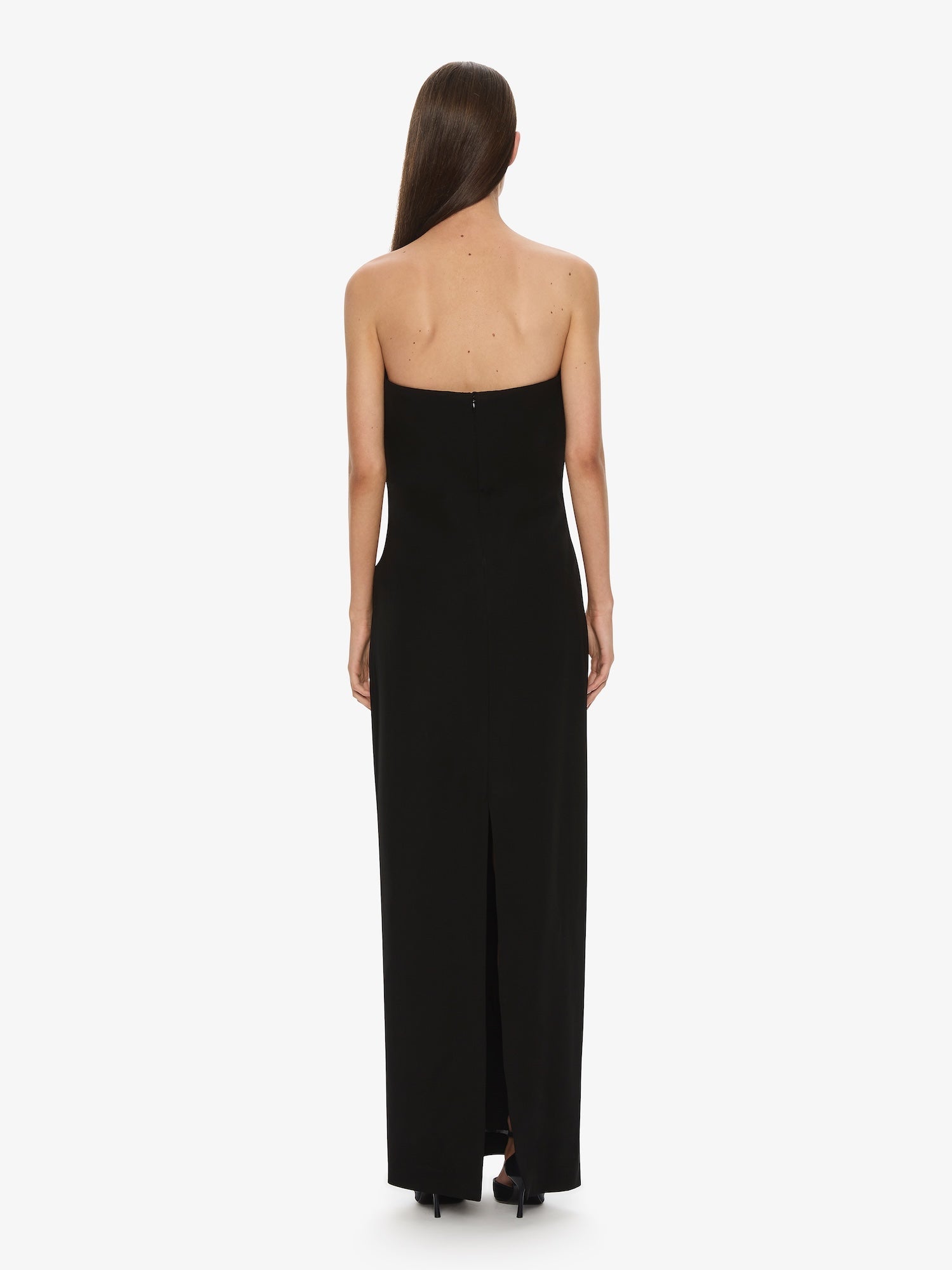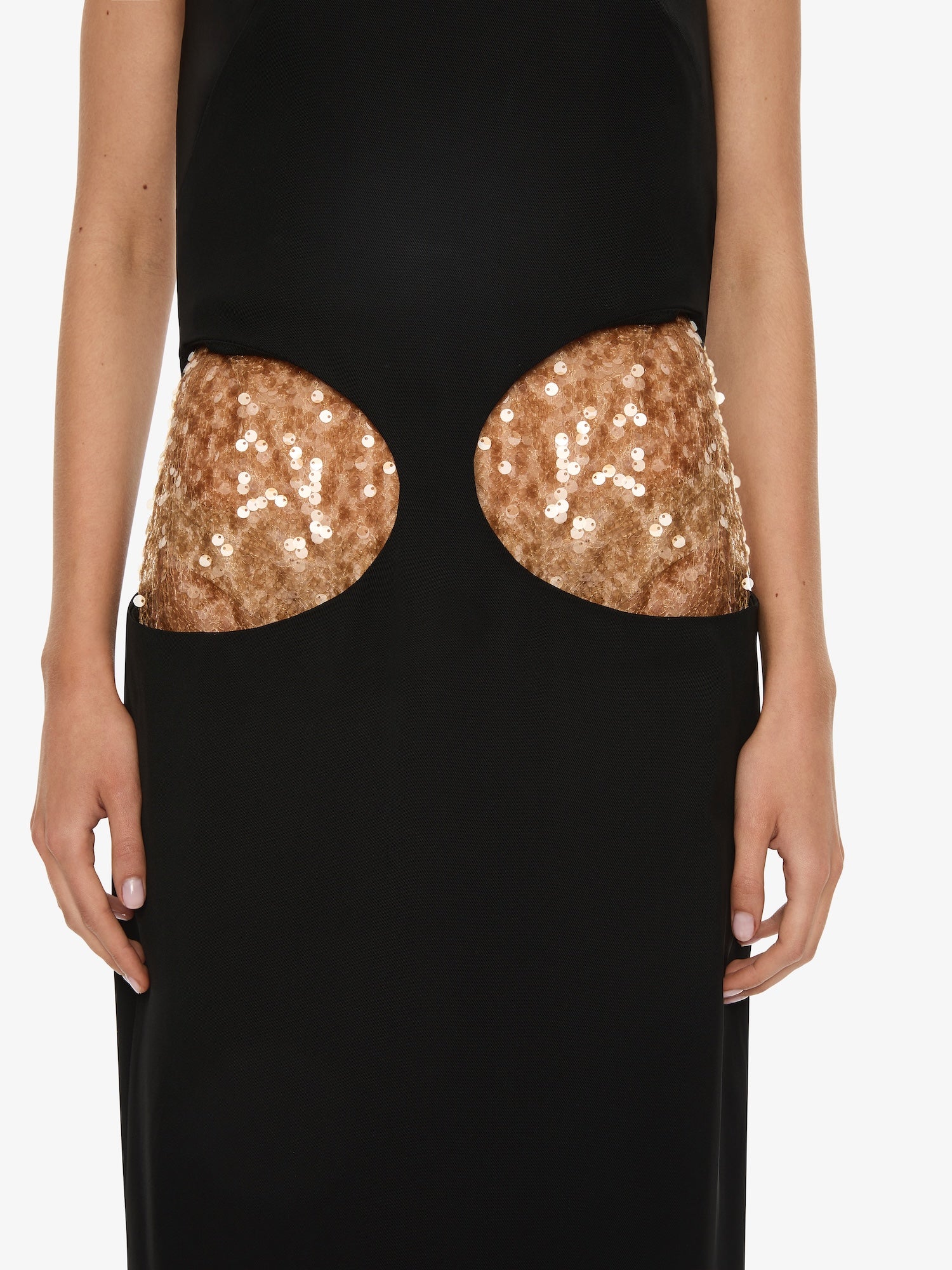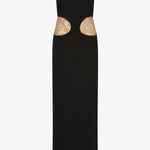 Defined by curved, sequin-embroidered inserts at the hip, cut to contour and catch the light. This column silhouette falls cleanly to the floor with a single back split for ease of movement.