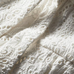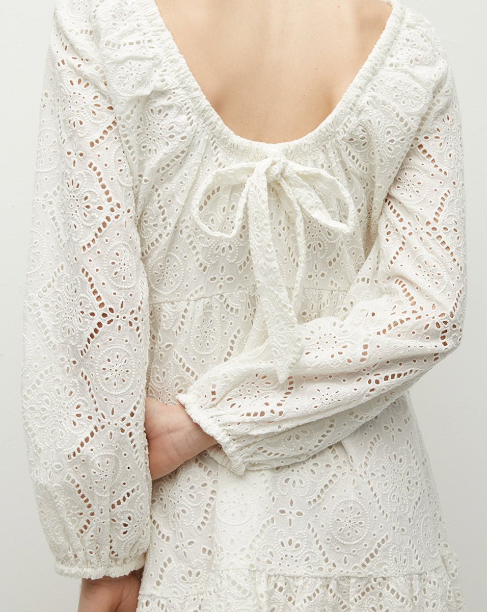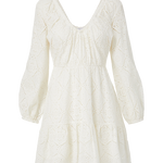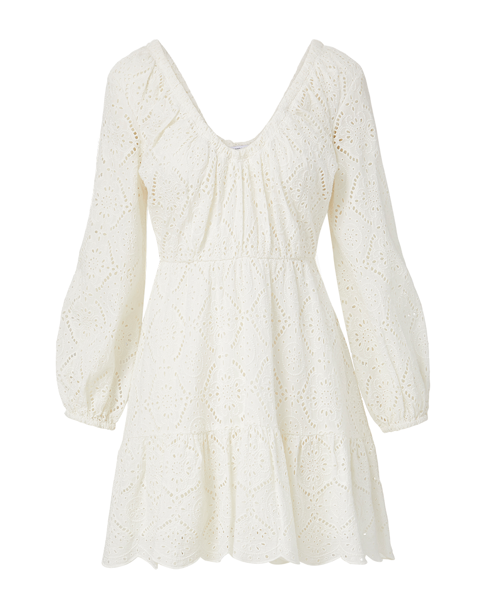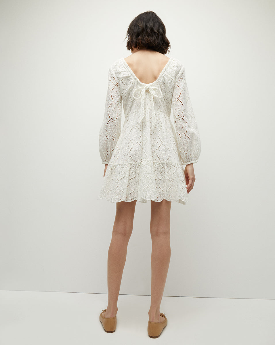 The sartorial equivalent of a summer breeze, the Calibra dress is made from 100% cotton eyelet lace with cotton lining. It features an empire waist and billowy, bracelet-length sleeves with elasticized wrists. An adjustable tie at the back lets you adjust the wide v-neckline, and a flounced, scalloped hem adds movement. Wear it anywhere and everywhere—from errands to dinner al fresco.