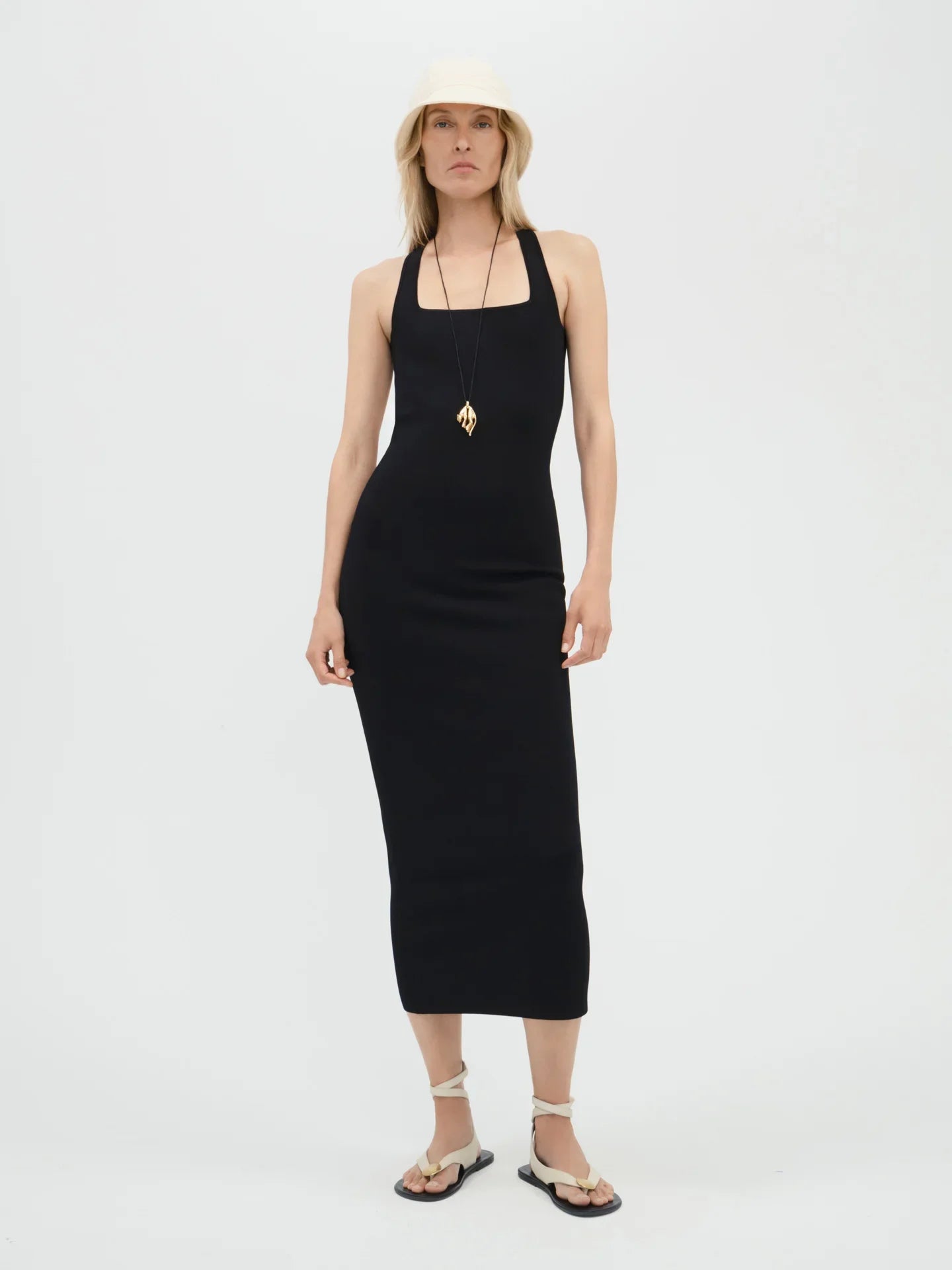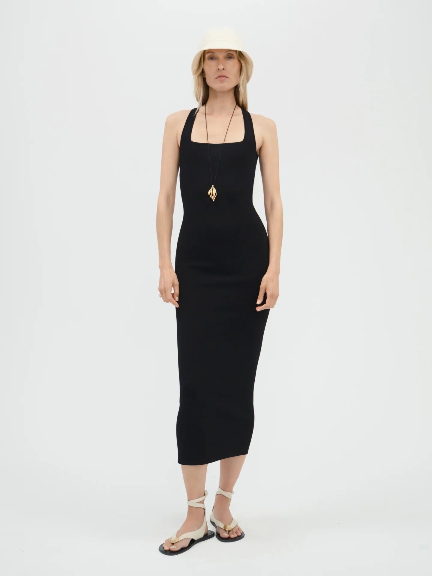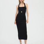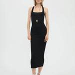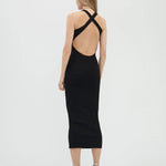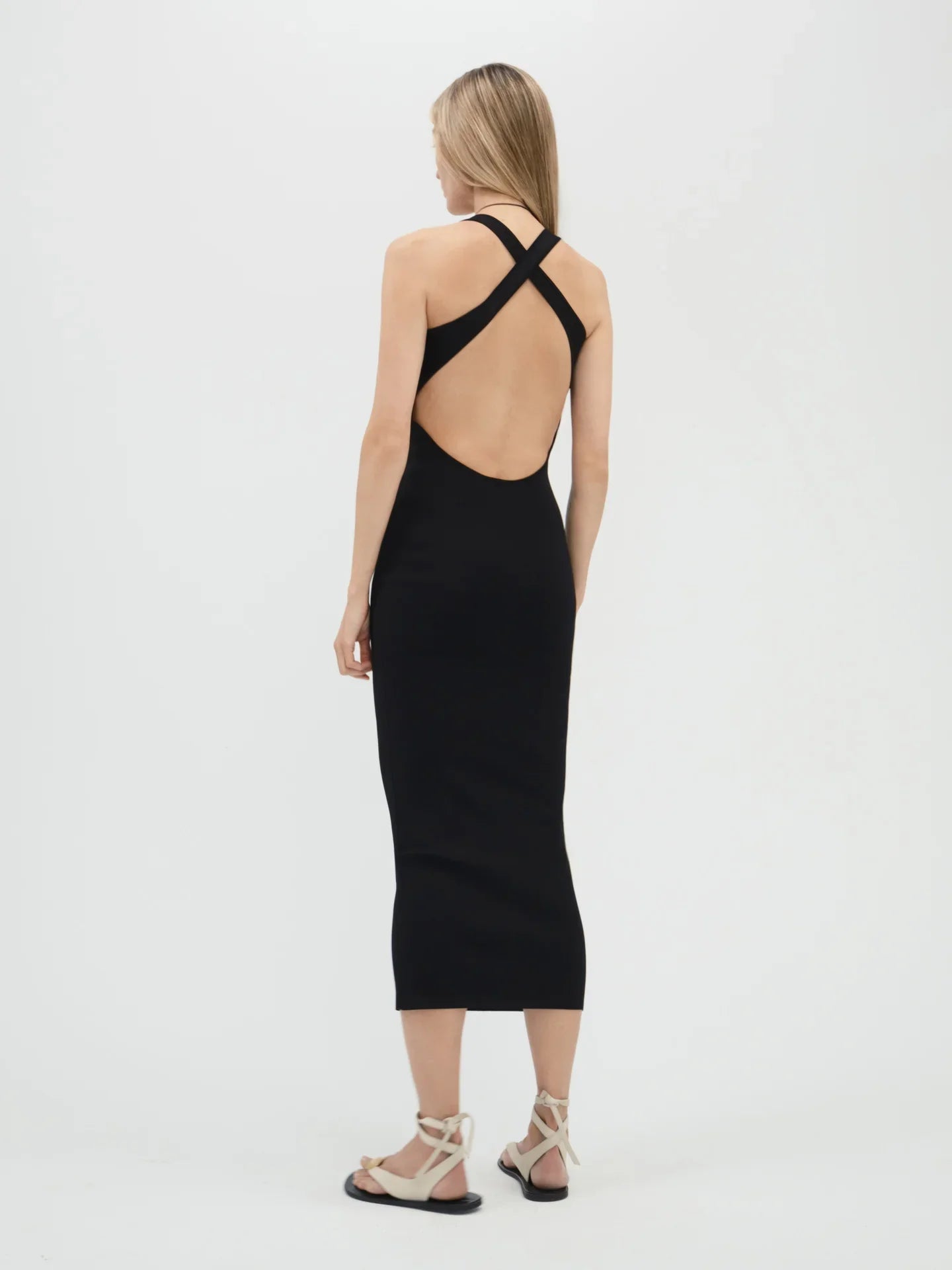 A figure-sculpting dress with a square neckline, low open cross-back, and ankle grazing hem. This dress is knit in a compact interlock-stitch with lustre viscose yarn offering a thoughtful balance of stretch and structure as well as a delicate sheen and smooth, cool touch.