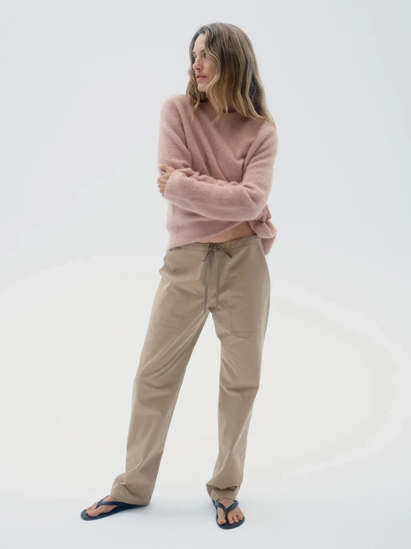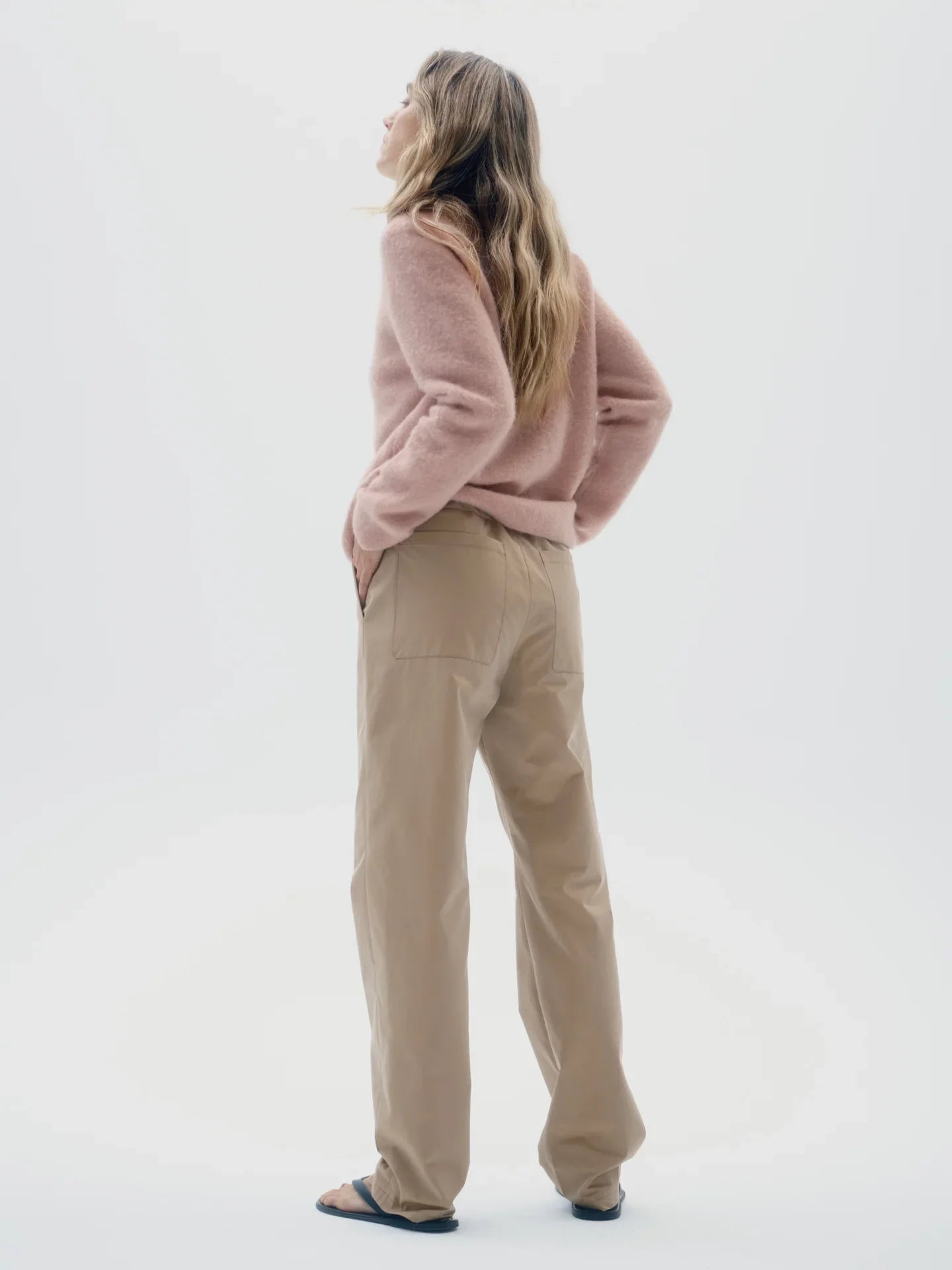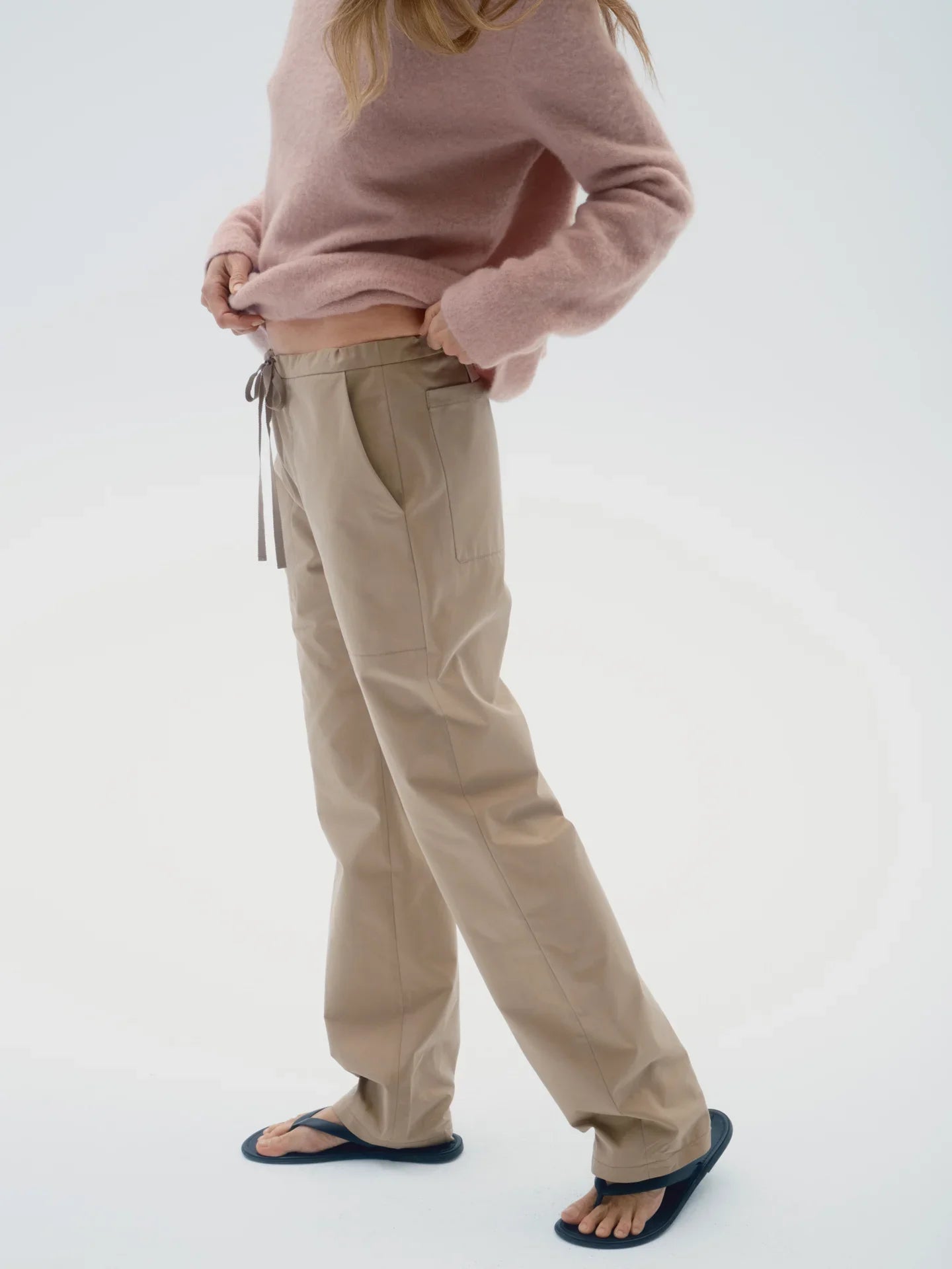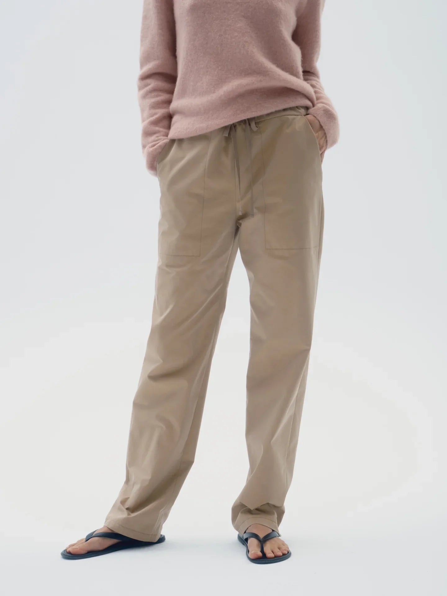 Relaxed straight-leg pants with utilitarian cargo pockets and exposed stitch details, finished with an adjustable drawstring waist. Crafted from crisp Italian cotton twill.