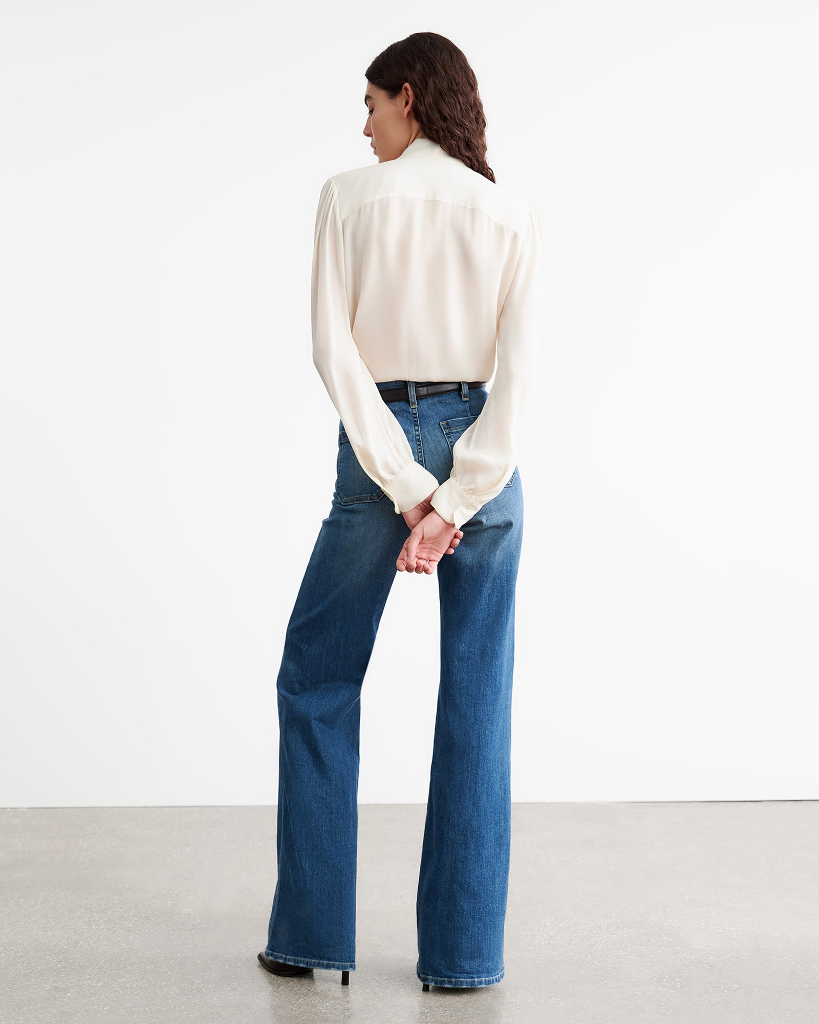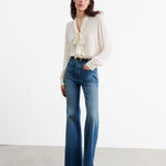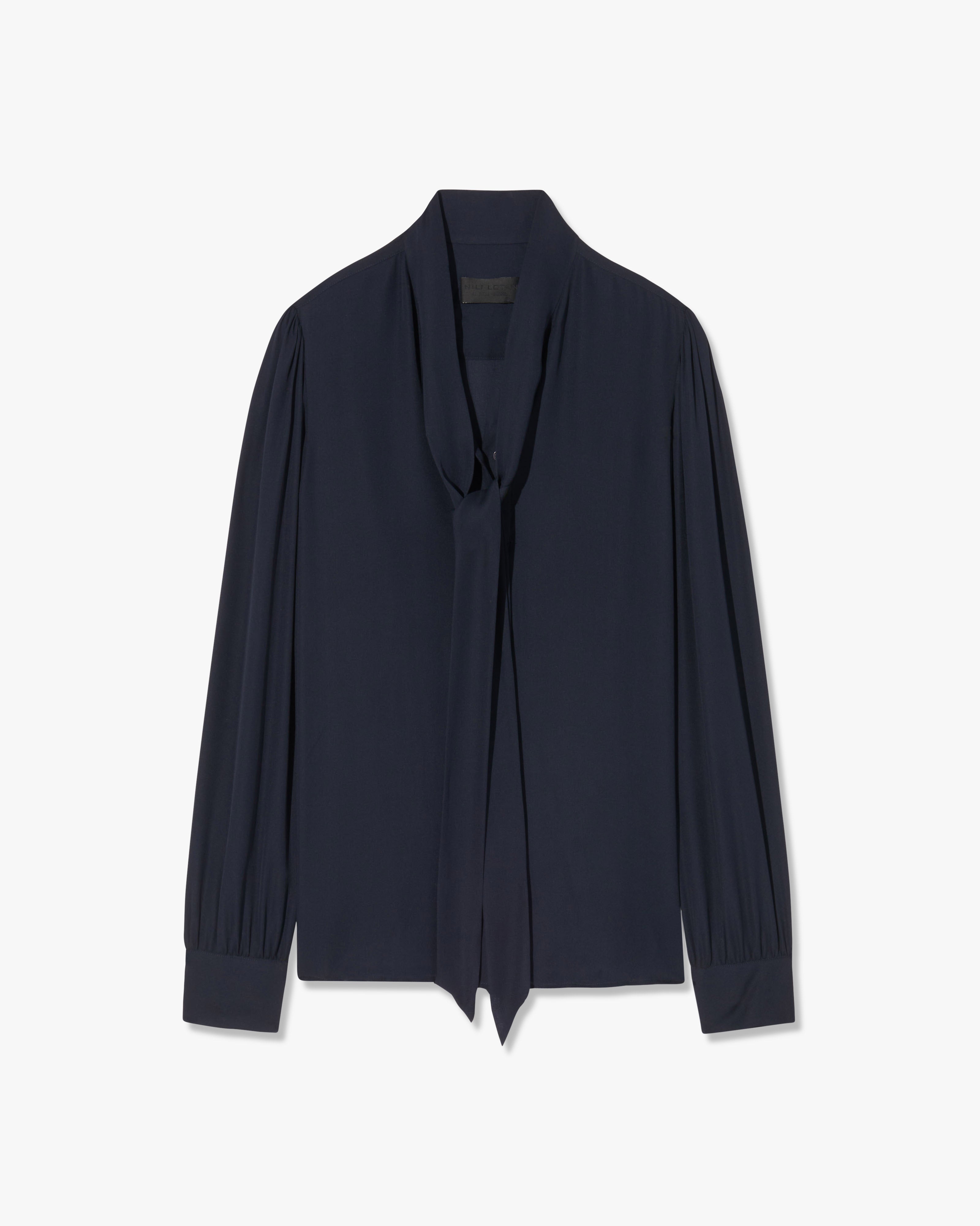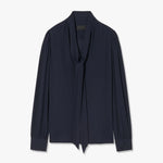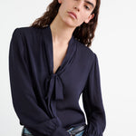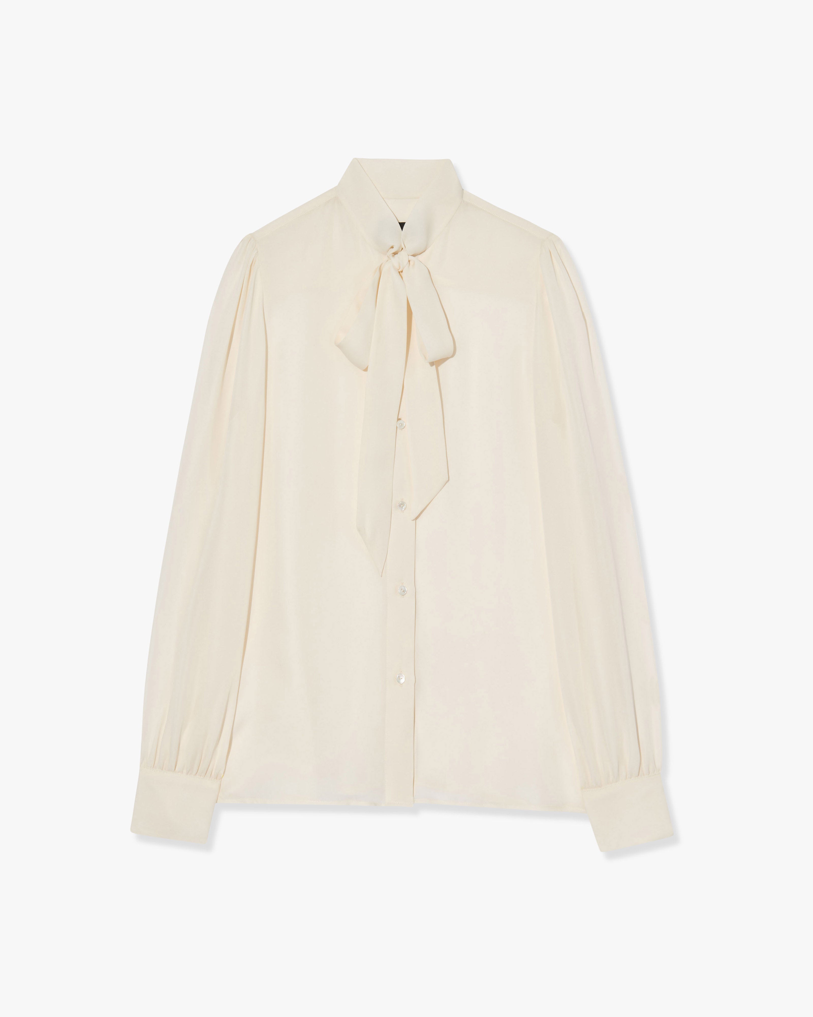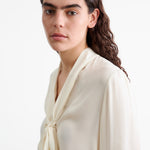 Relaxed bow tie blouse in silk. Center front placket. Troka buttons. Relaxed sleeve. Shirring at sleeve cap and cuff. Standard cuff with two buttons. Back yoke. Semi-sheer.