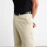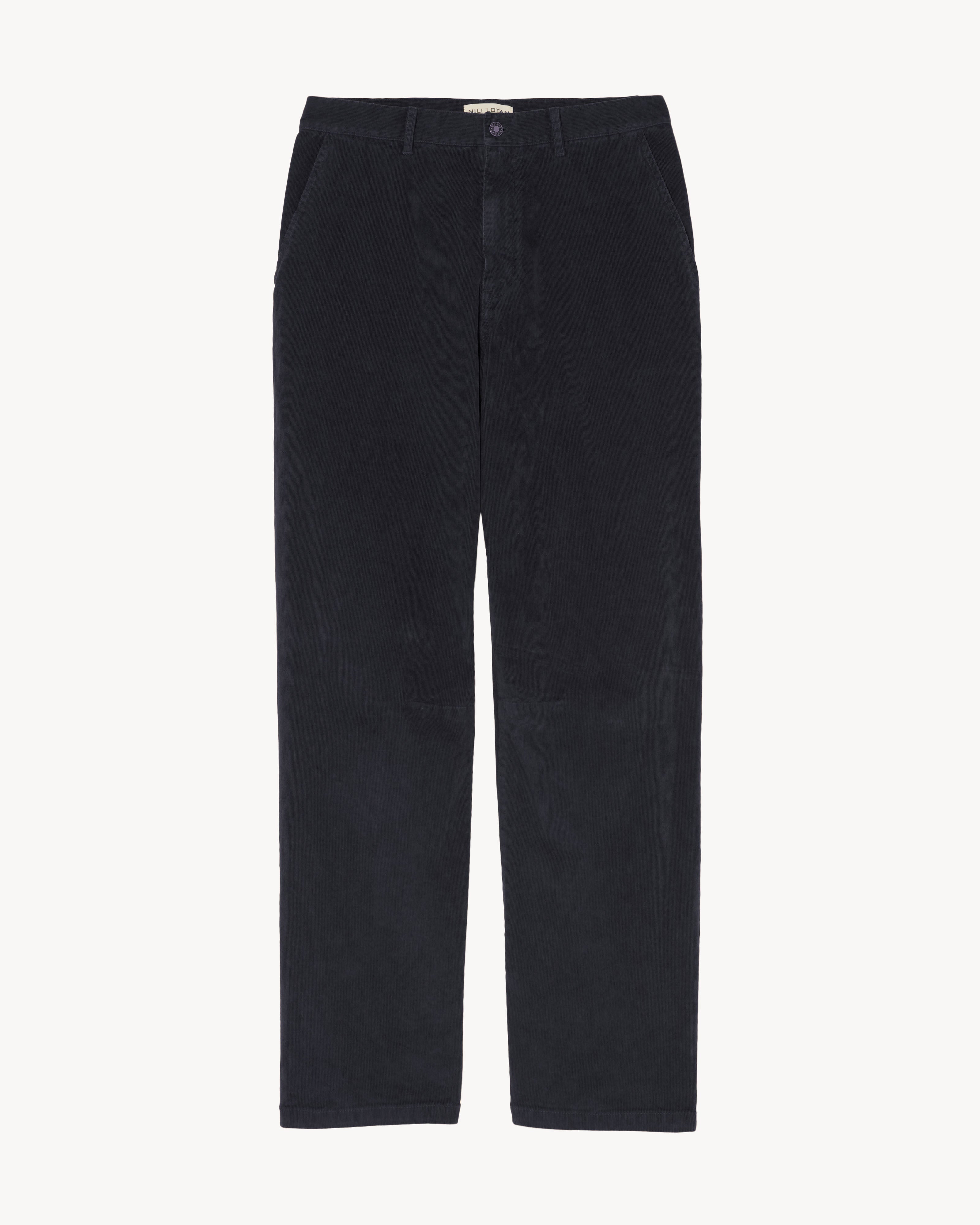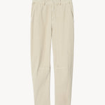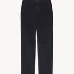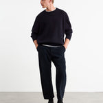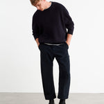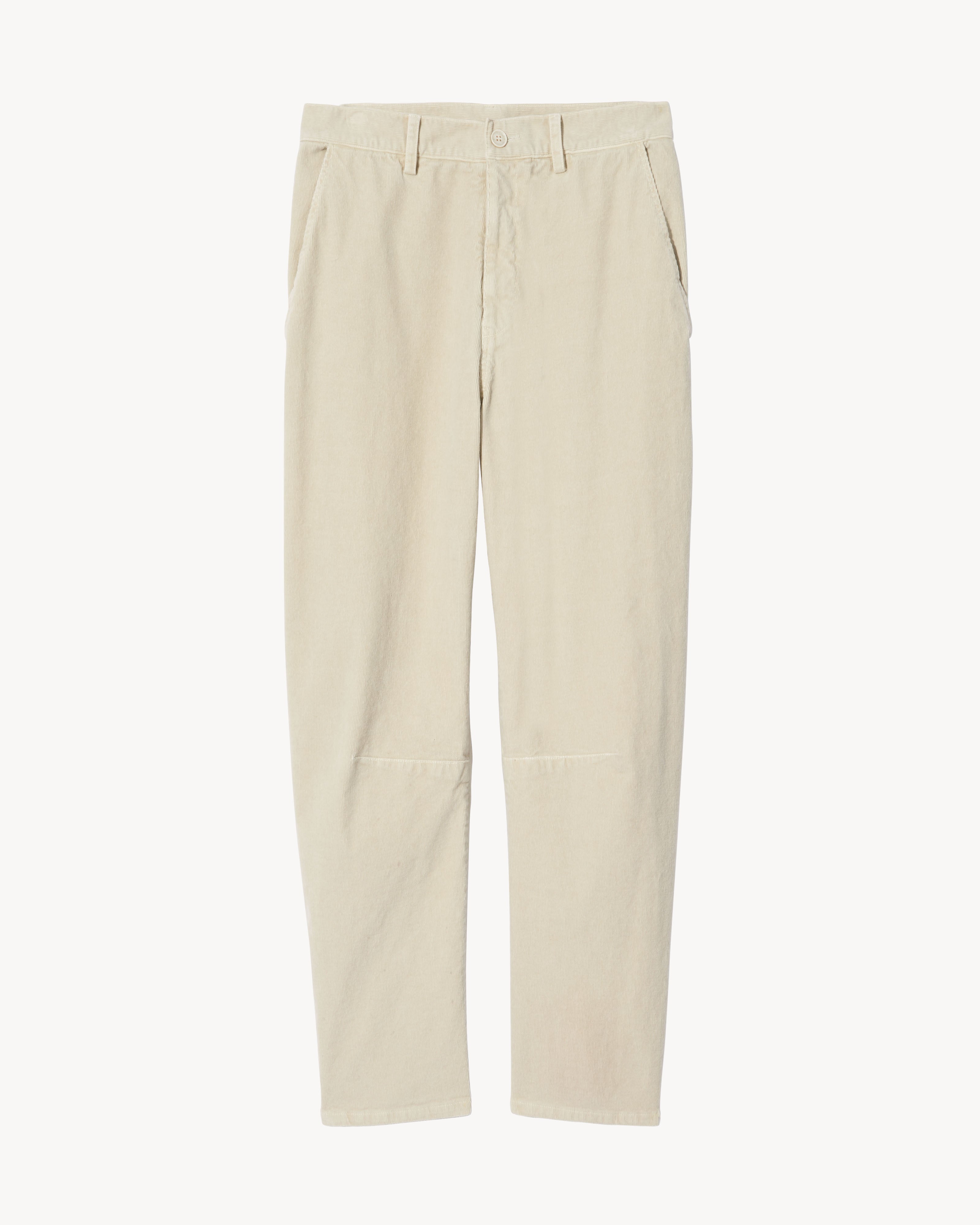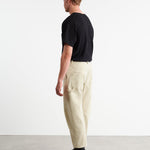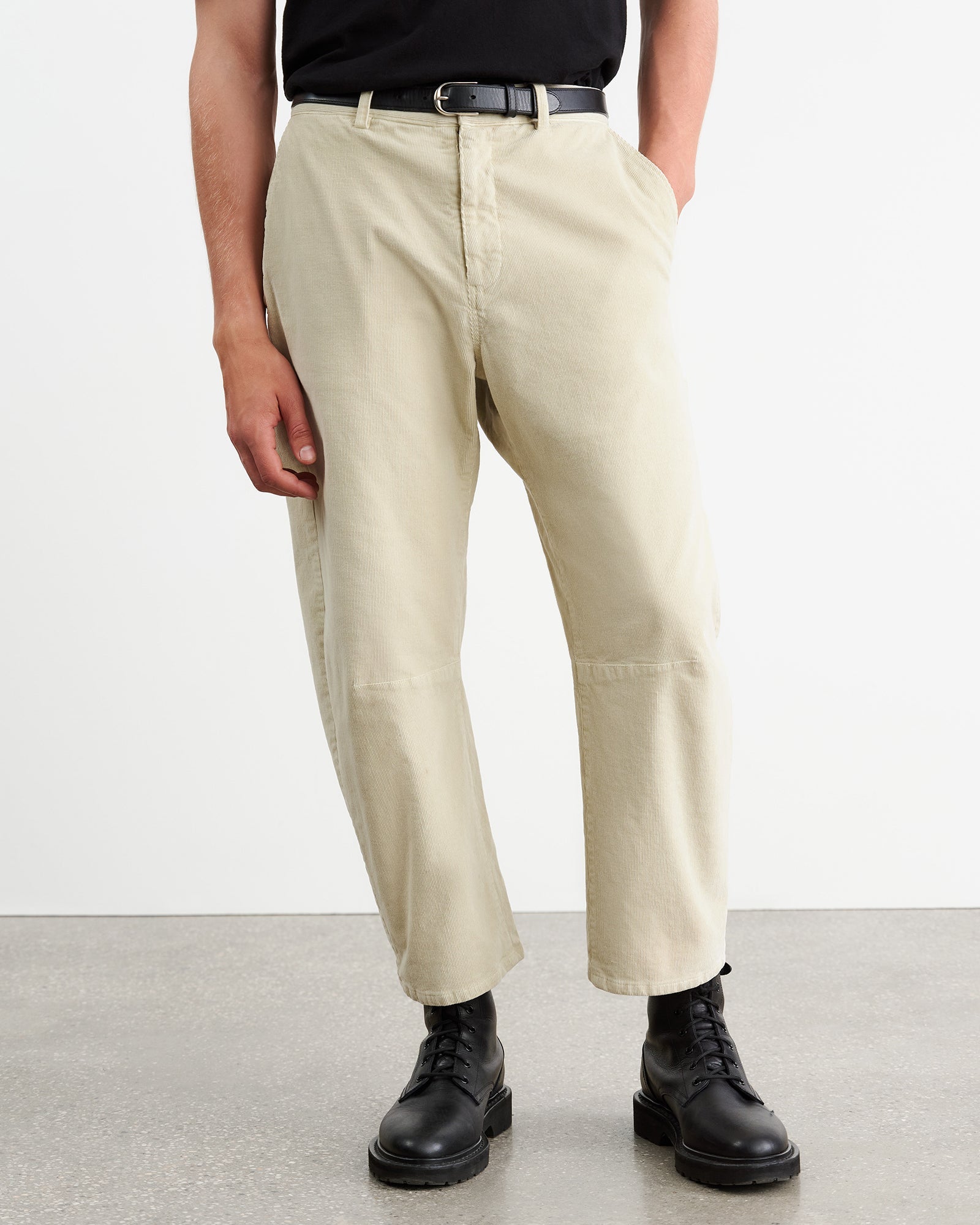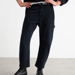 Relaxed fit pant. Uniquely curved silhouette. Seam detail at knees. Gusset at inseam. Side slash pockets. Hammer loop. Back welt pockets. Zip fly. Button closure. Belt loops.