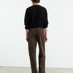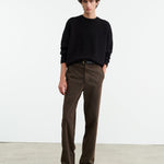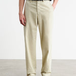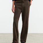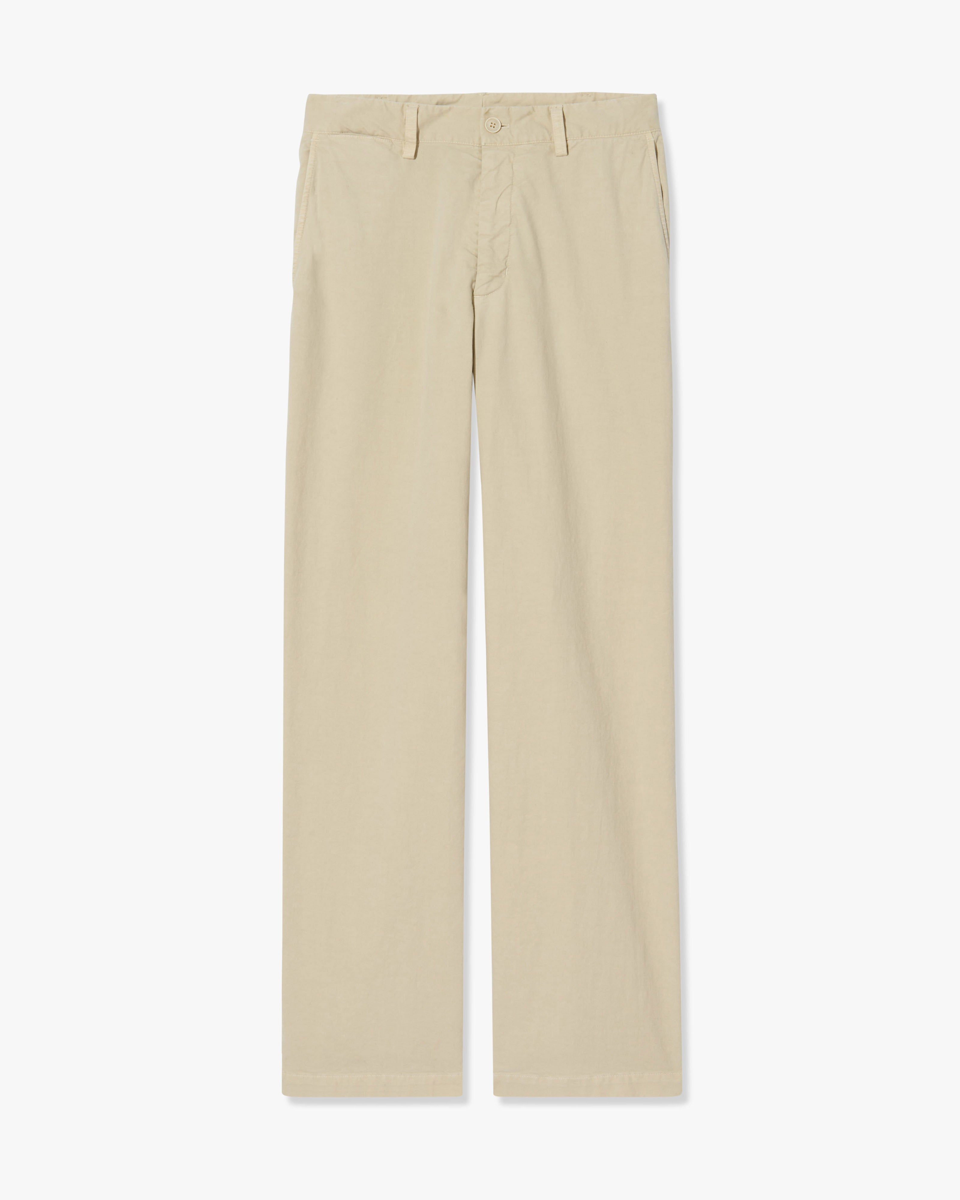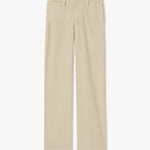 Mid-rise relaxed slightly wide leg pant in stretch cotton. Side slash pocket. Back welt pockets. Zip fly. Button closure. Belt loops.