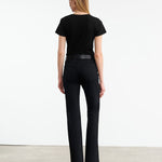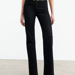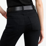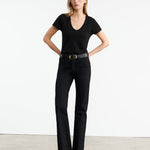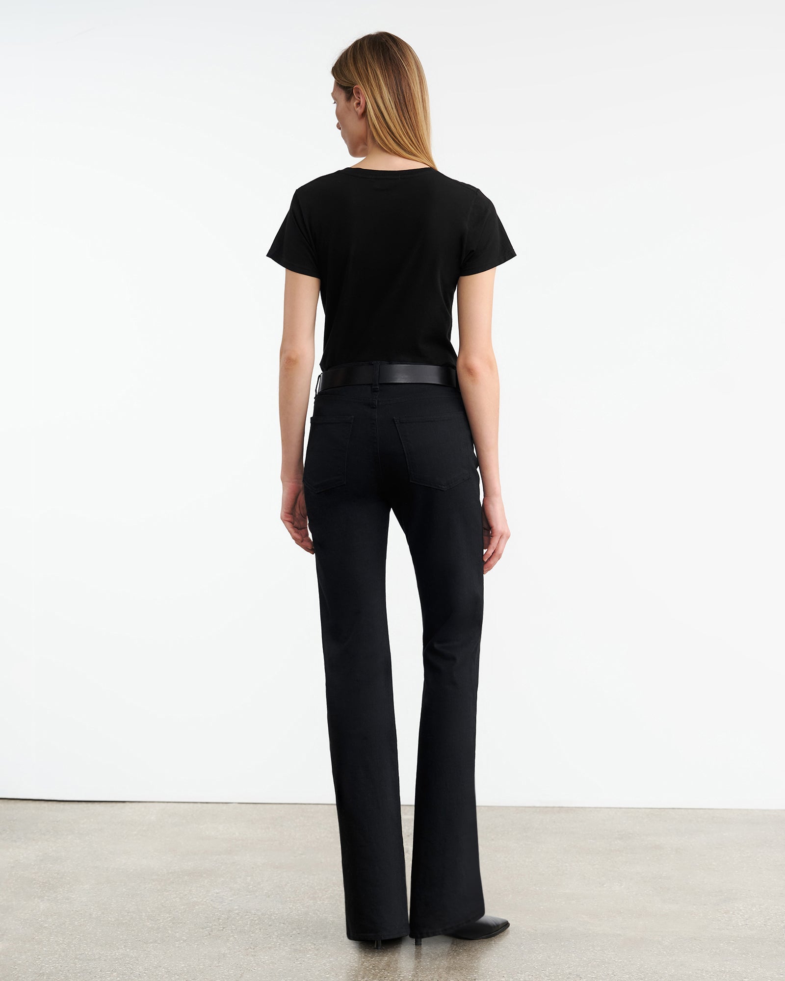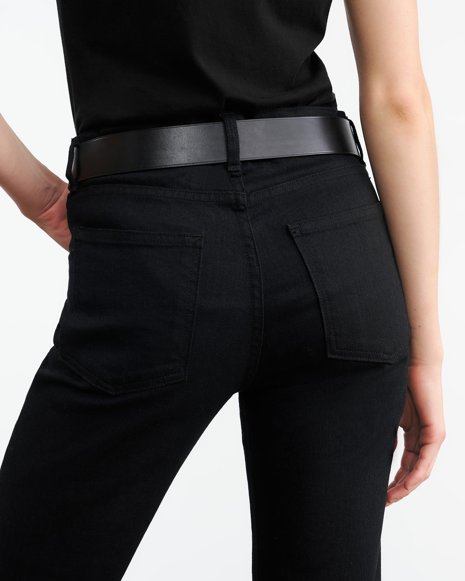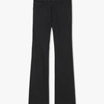 Mid-rise flare leg jean in Japanese stretch denim. Five pocket details. Zip fly. Shank closure. Belt loops.