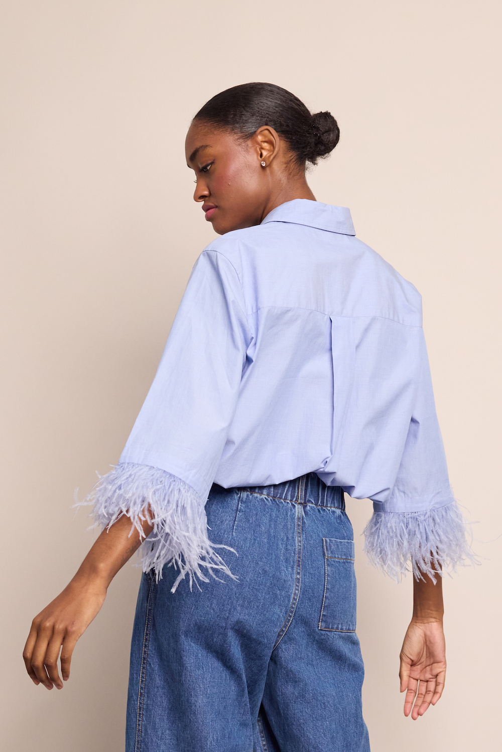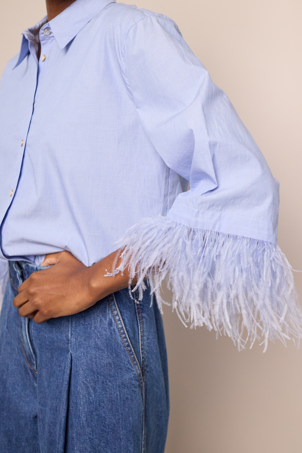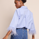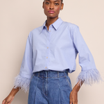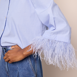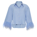 • Button down shirt with feather trim detail at sleeve hem