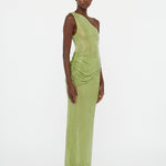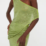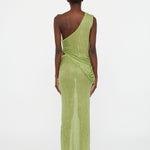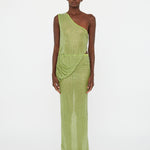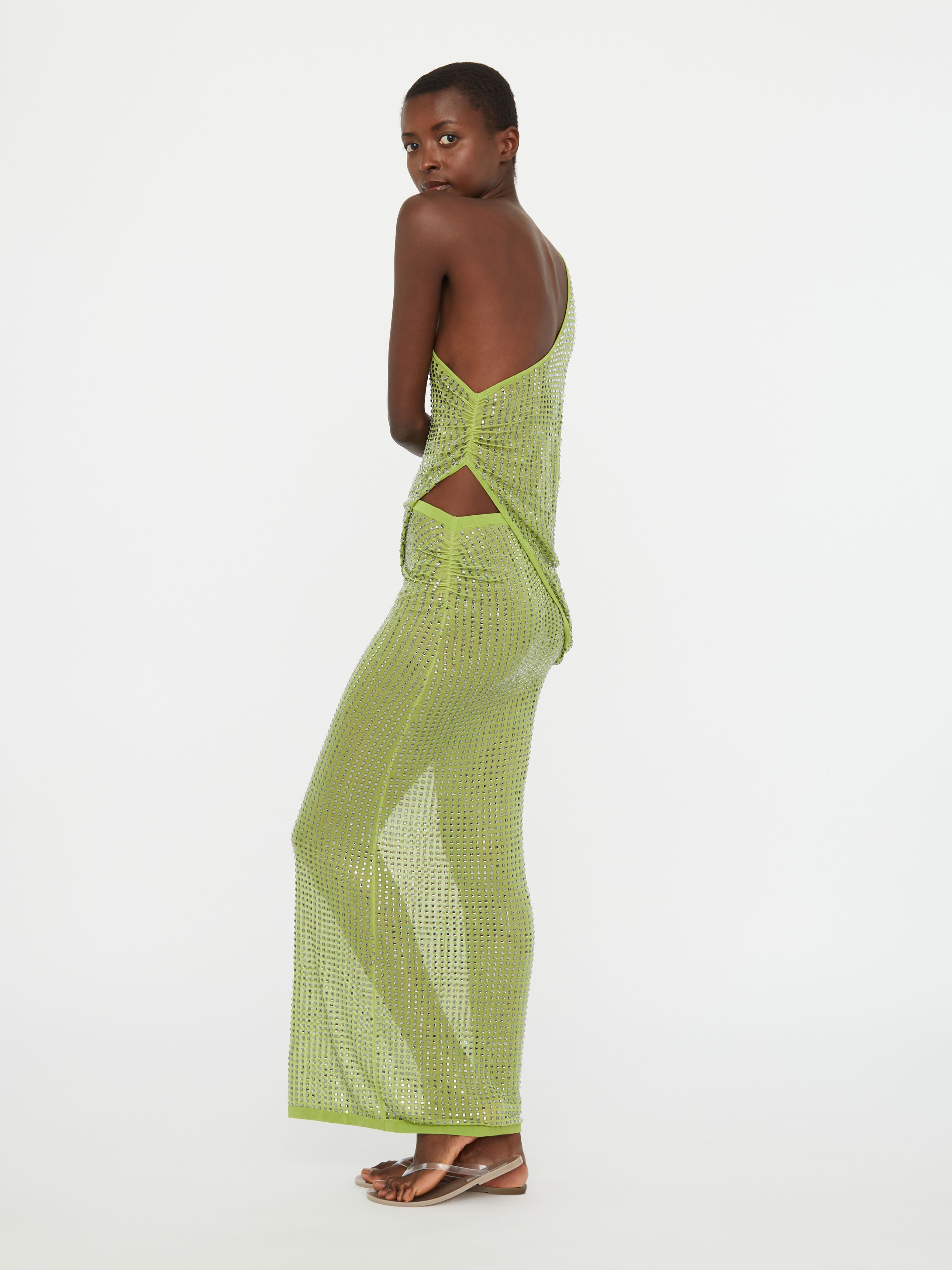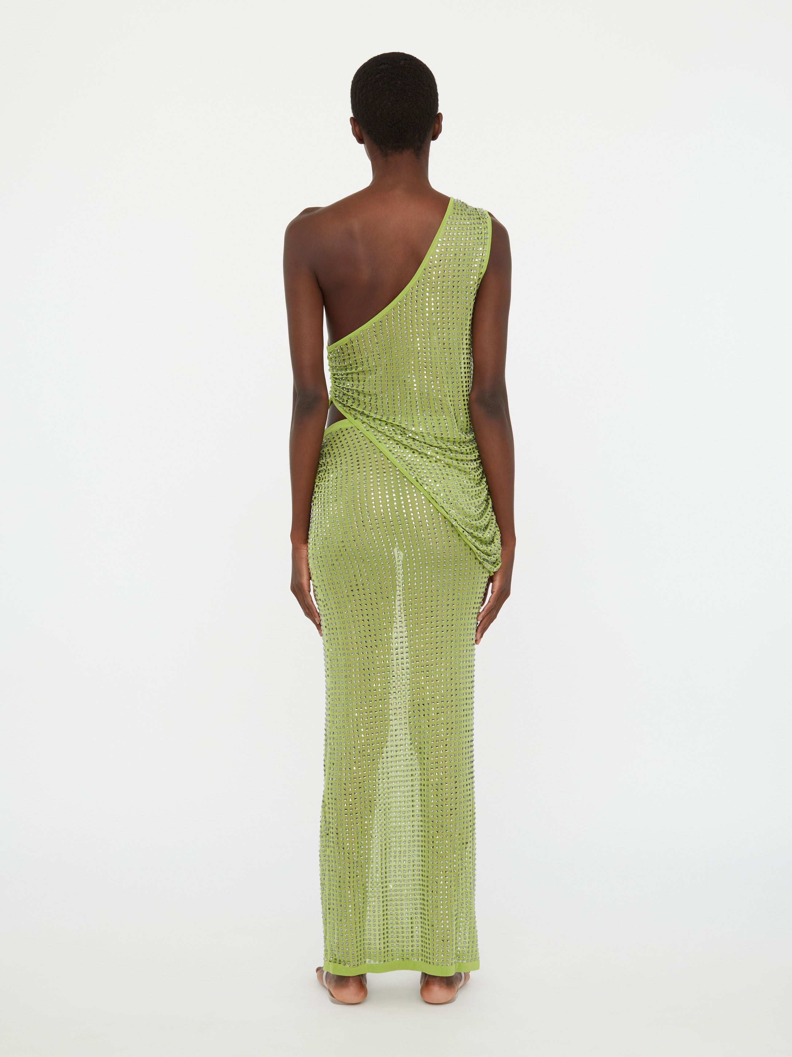 Glass crystal detailing becomes an architecture of gilded light — a tension between exposure and adornment. Crafted from sheer knit viscose, this fine gauge cutaway dress is finished with an asymmetrical drape and ruching across the bodice.