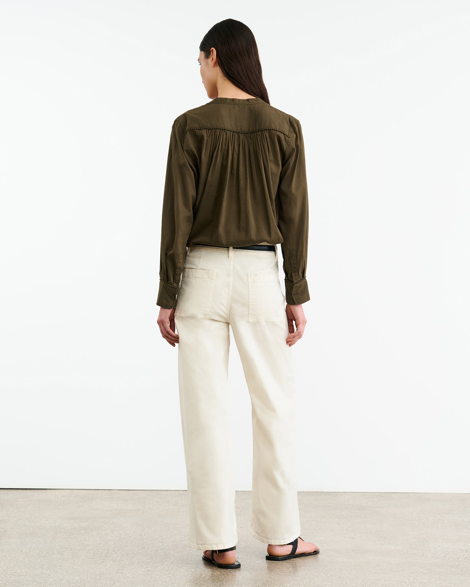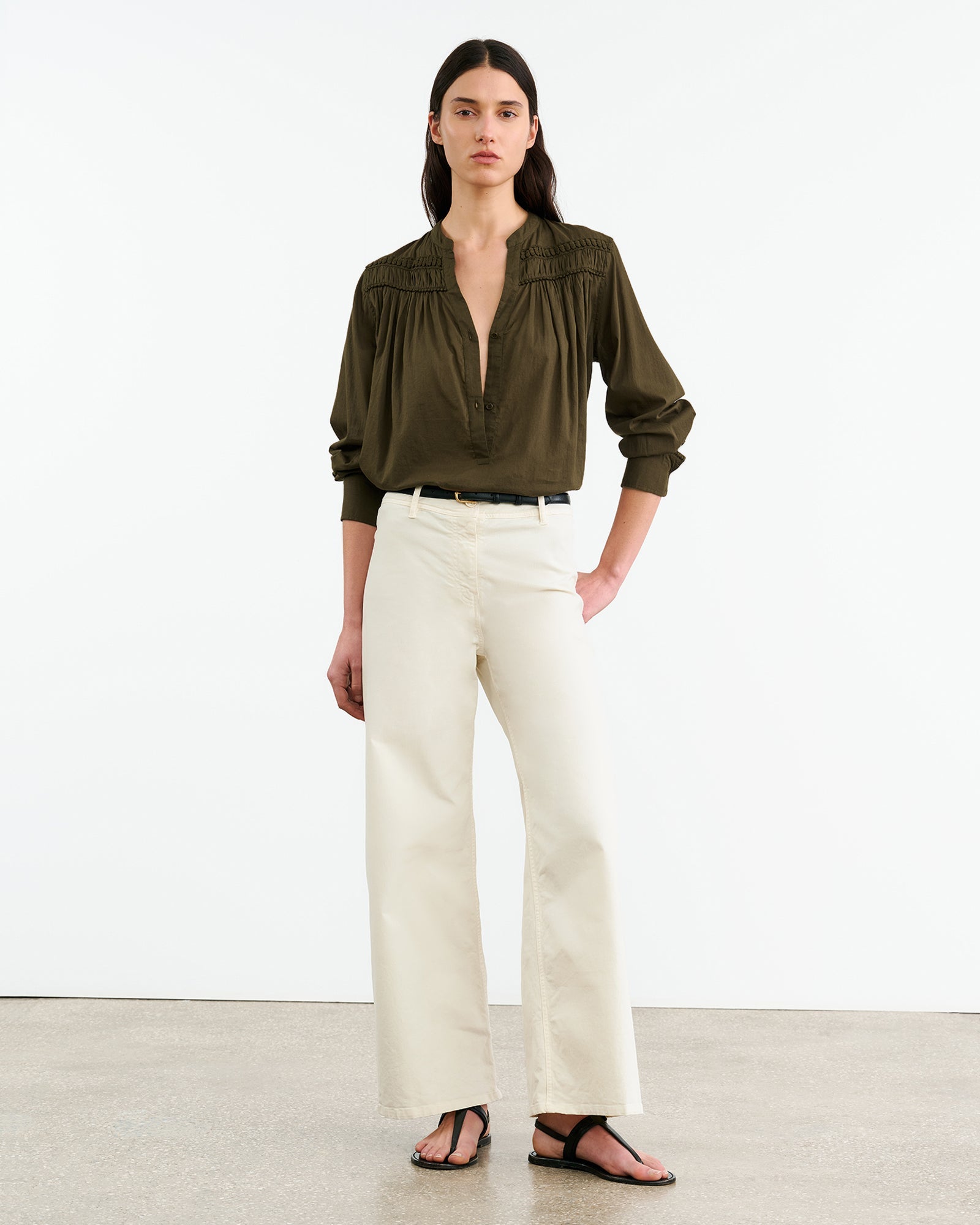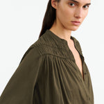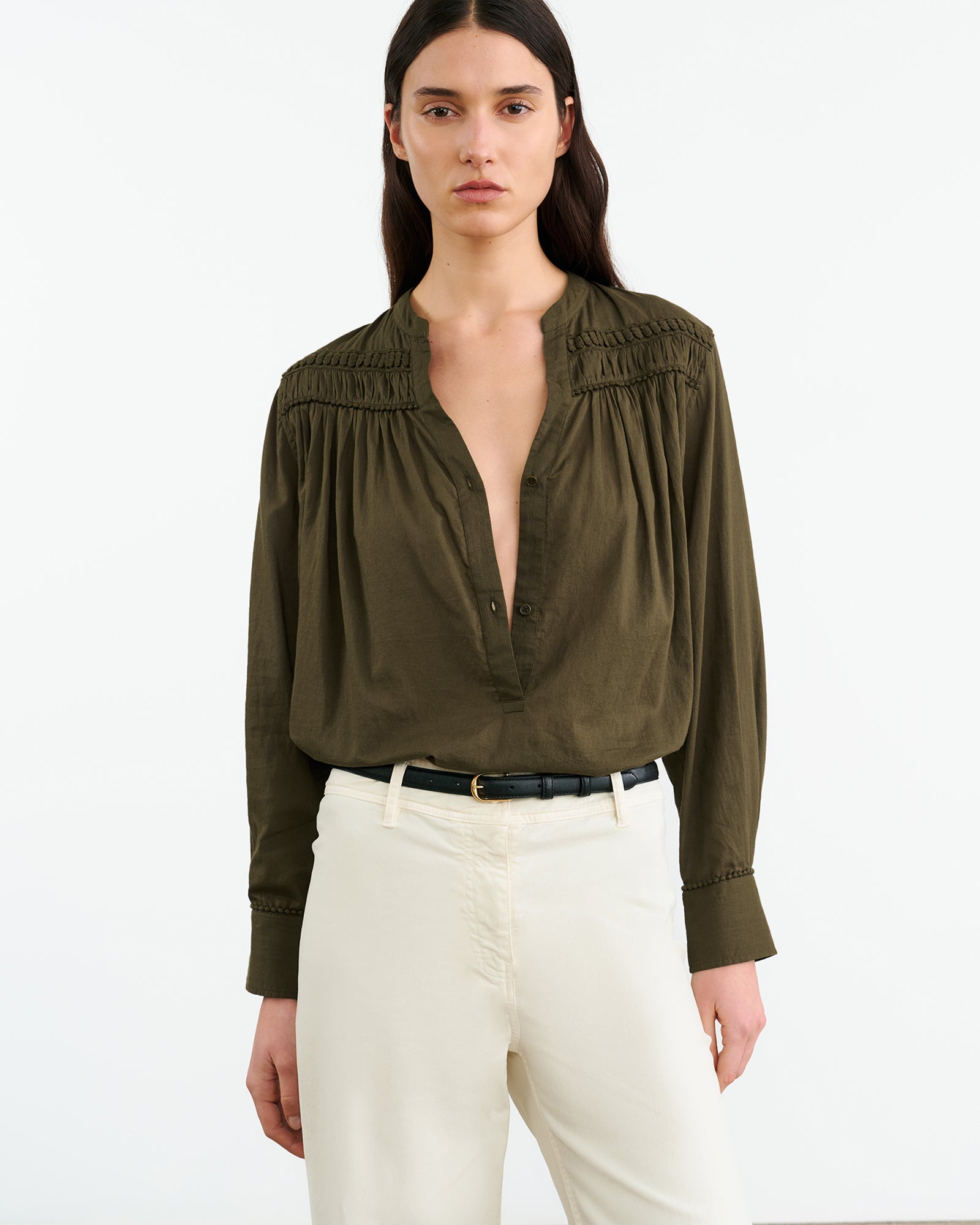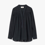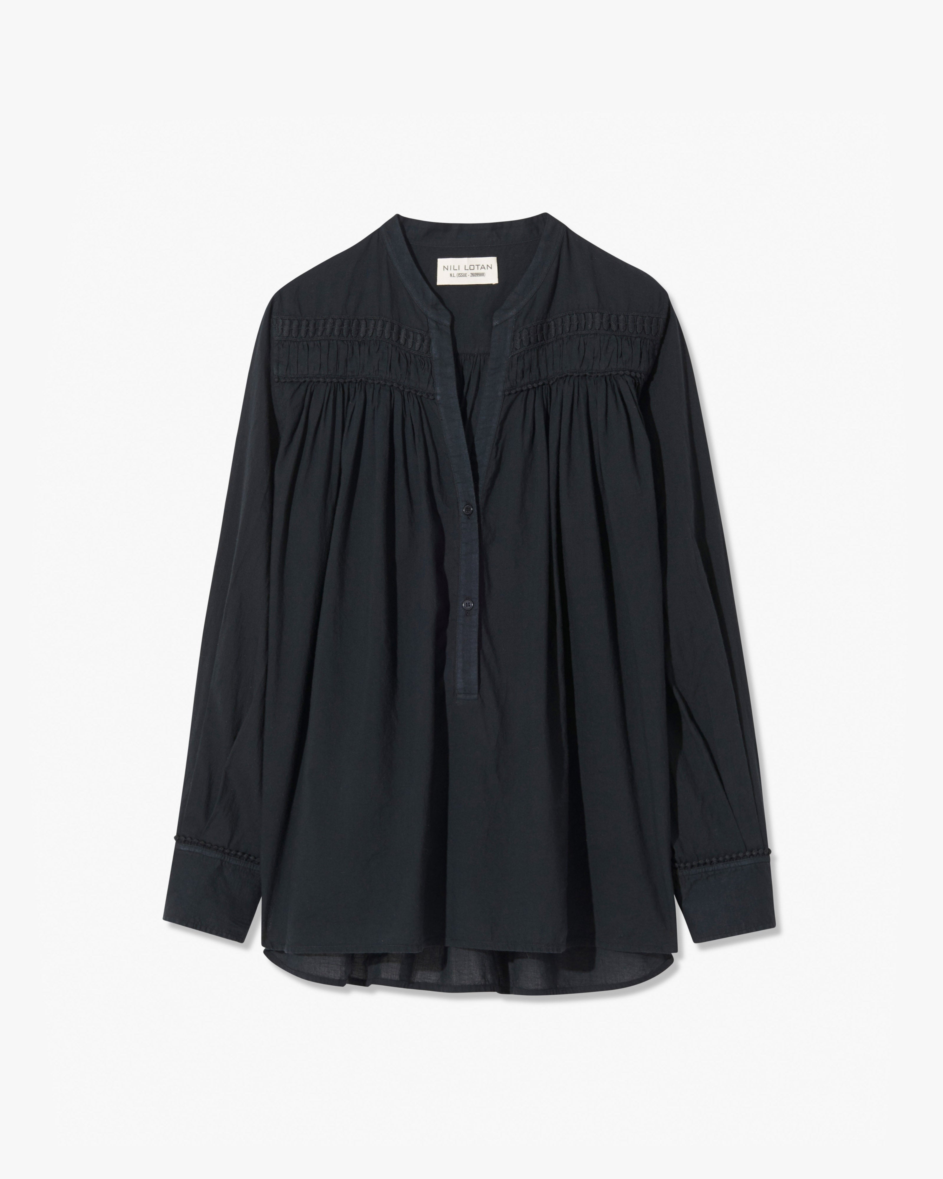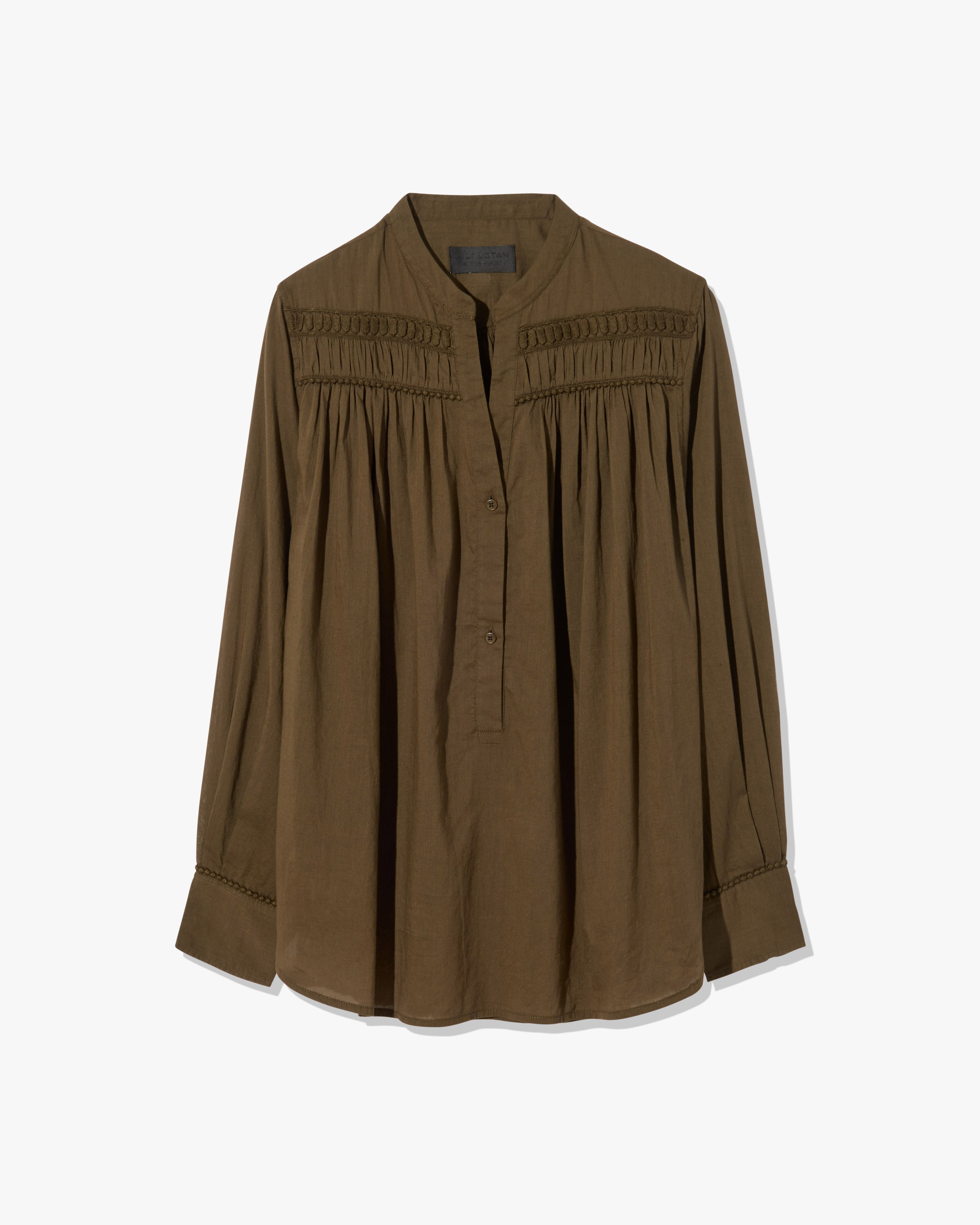 Relaxed pullover blouse in Indian cotton voile. Dot trim detail at front and back yoke. Light shirring at front and back yoke. Center front placket. Dyed to match logo buttons. Buttons at cuff. Shirttail hem.