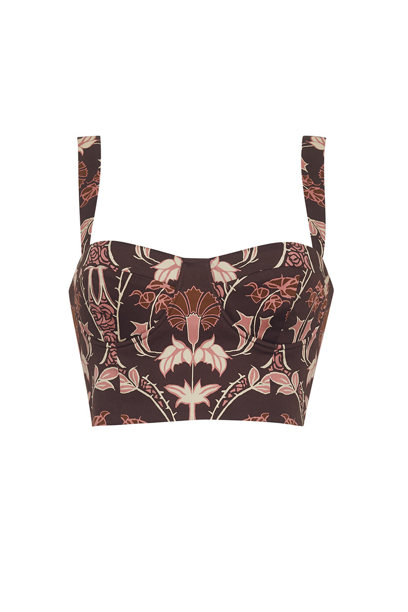 The Claudine Top was designed as an easy compliment to denim and matching printed looks. An extremely flattering and feminine corset crop top, the Claudine is designed in cotton and pairs effortlessly with the matching Blaze Skirt. The elastic at the back of the straps and fitted bodice allow for a comfortable fit and no-fuss pretty detail.