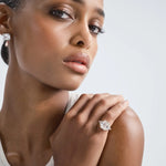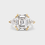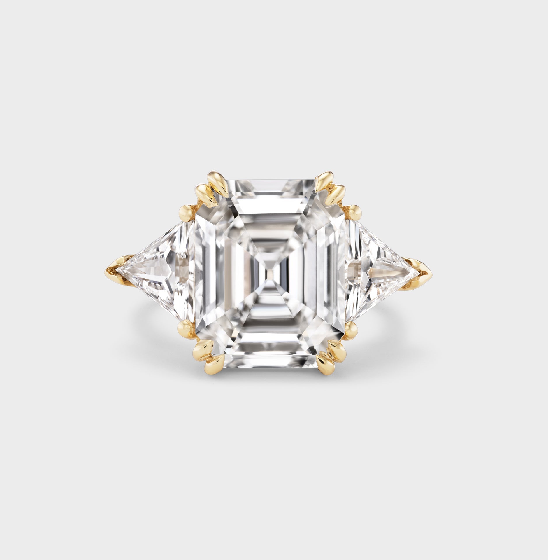 Centered on a 5.2 carat antique emerald-cut lab-grown diamond and flanked by 1.8 carats worth of trillion side stones, this ring is designed to be worn on the pinky finger while holding a tea cup to your mouth, then subtly dropping it to the floor. Set in 14k yellow gold with fine double prongs that echo the geometry of the cut, the ring is best worn with a boxy cotton shirt and drawstring pants.