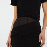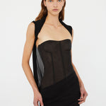 A jersey tee is explored, draped and anchored into sheer corsets, echoing the effortless gesture of skaters pulling tees behind their necks. Inbuilt boning creates structured rigidity.