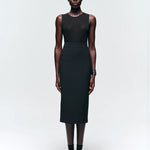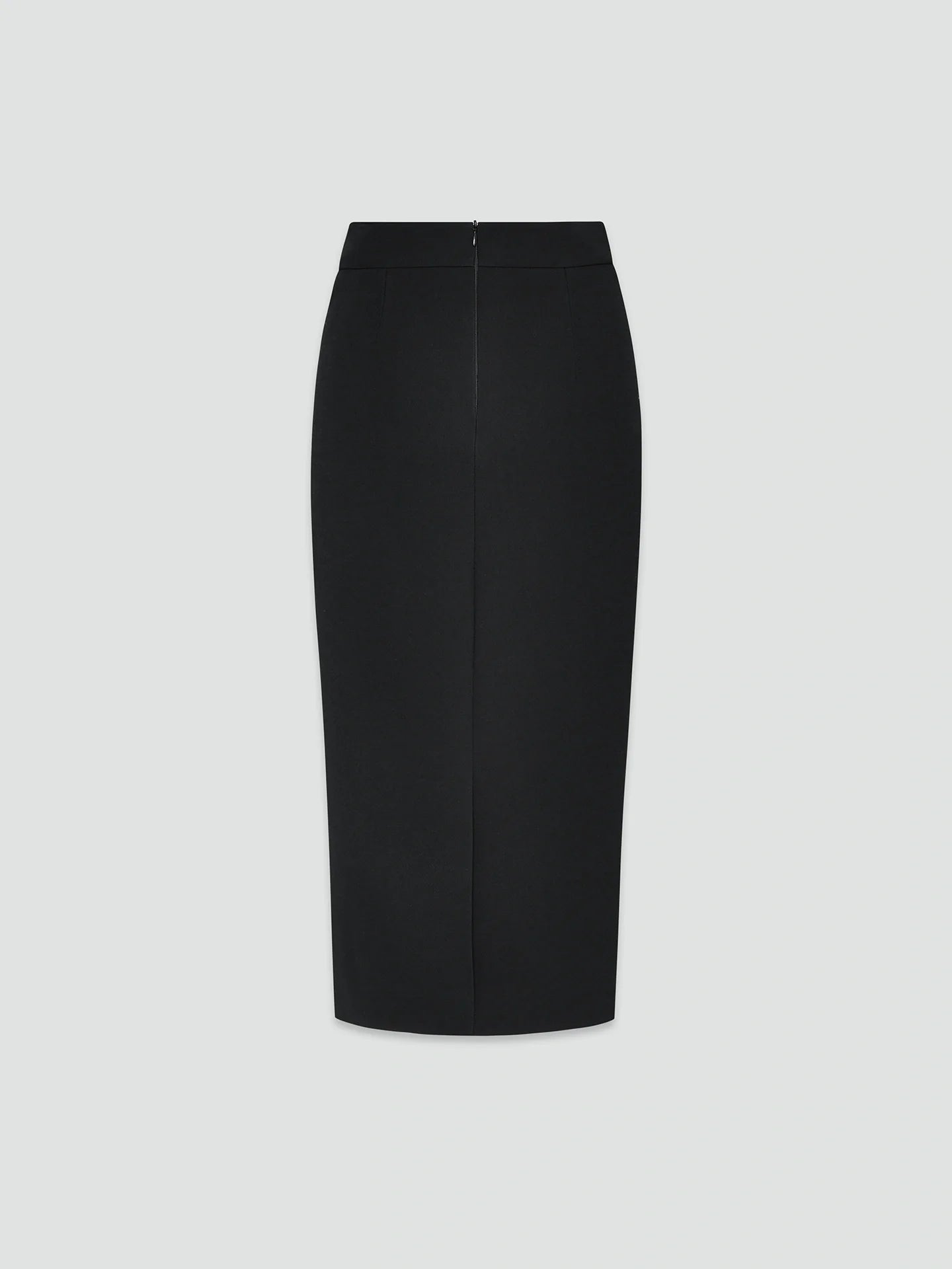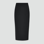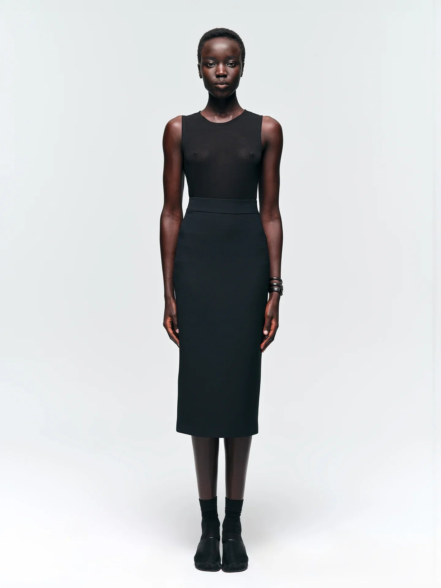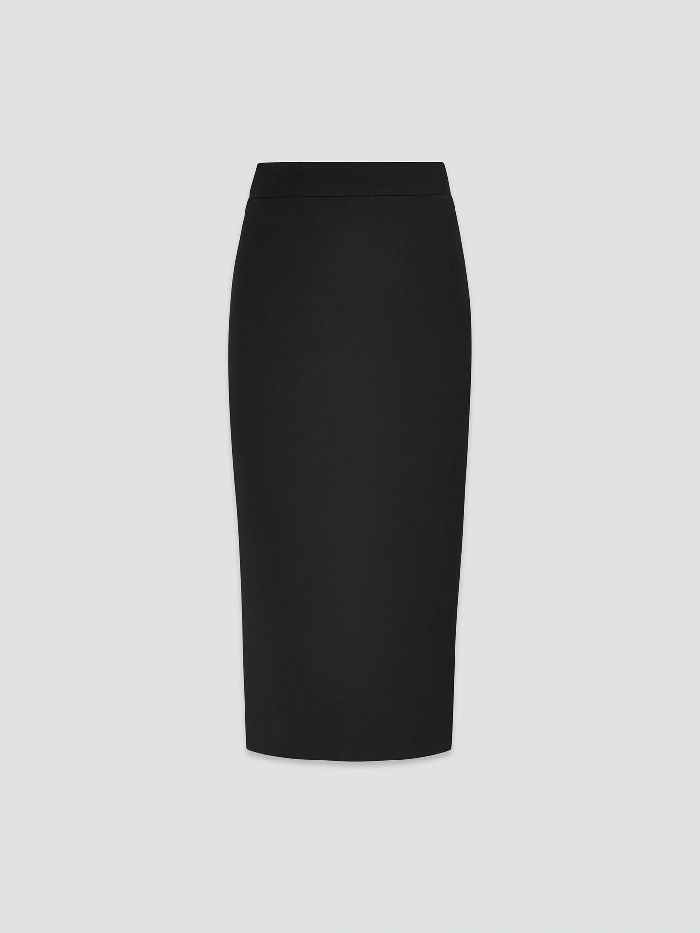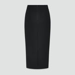 This is a mid-length column skirt with a high waist, tapered silhouette, and center back slit. Crafted in a thick wool & silk cady that lends subtle texture and a smooth, dry handfeel.