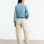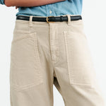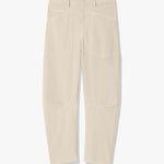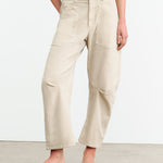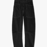 Mid-rise, relaxed fit barrel leg pant. Uniquely curved silhouette. Seam detail at knees. Gusset at inseam. Zip fly. Hidden hook-and-bar closure. Hidden stay button closure. Top-stitched front and back patch pockets. Belt loops.