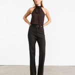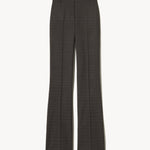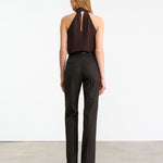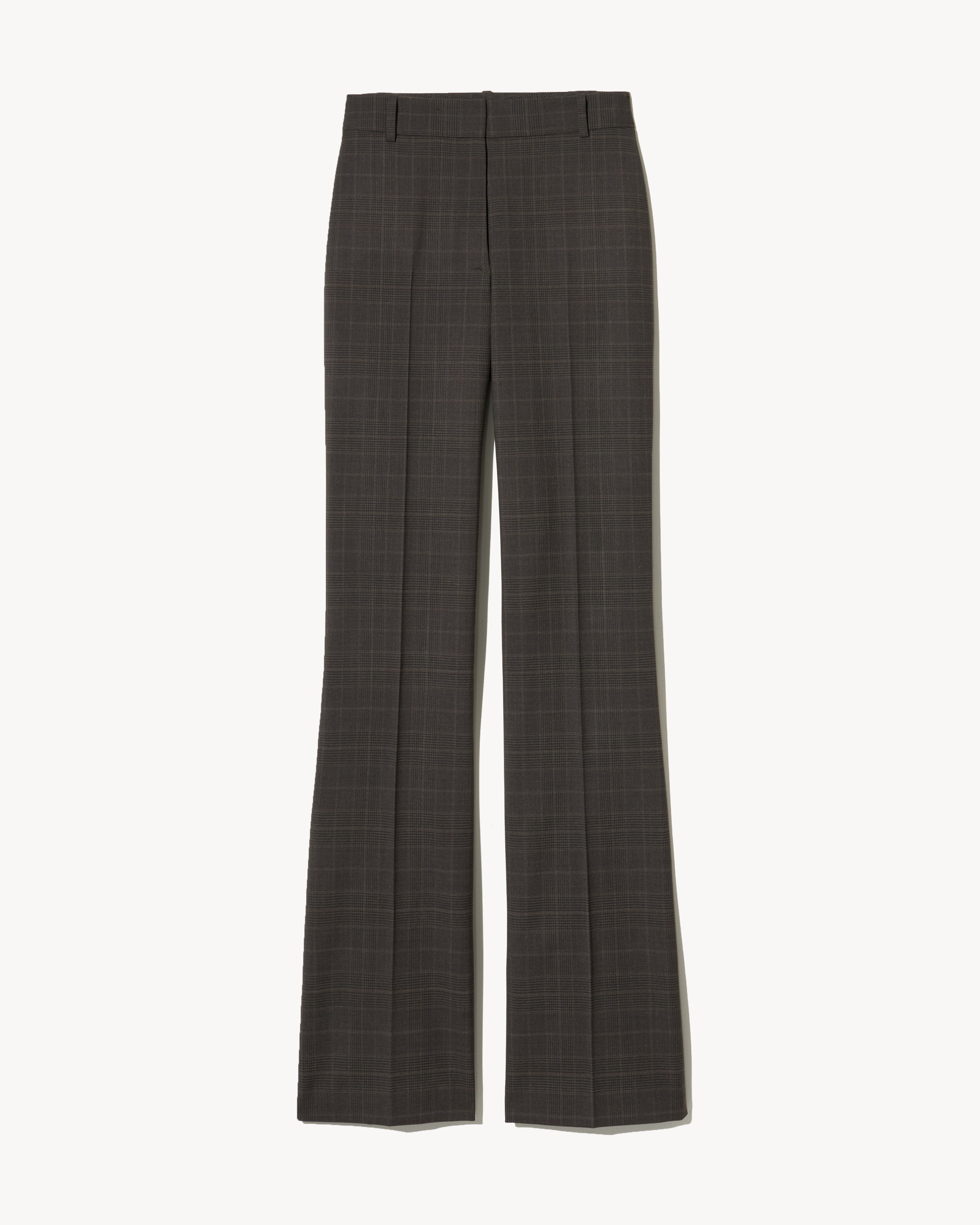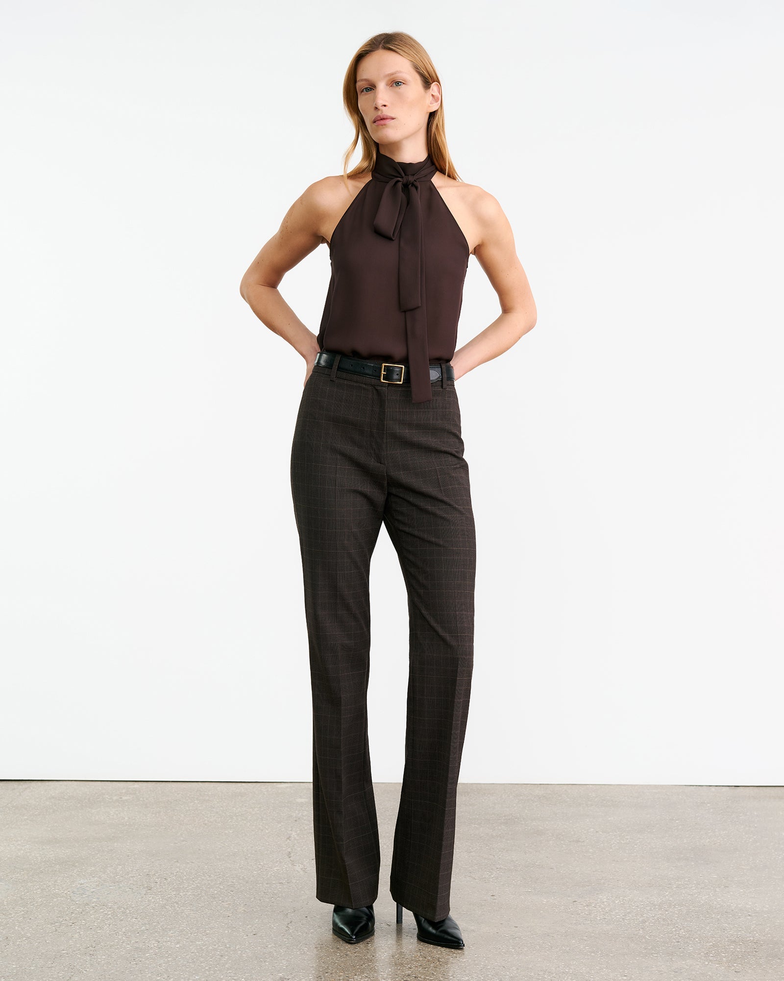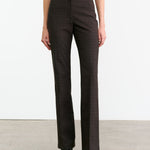 Flat front, high-rise straight leg trouser. Fitted through hips. Zip fly. Hidden hook-and-bar closure. Hidden stay button closure. Belt loops. Back welt pockets.