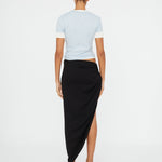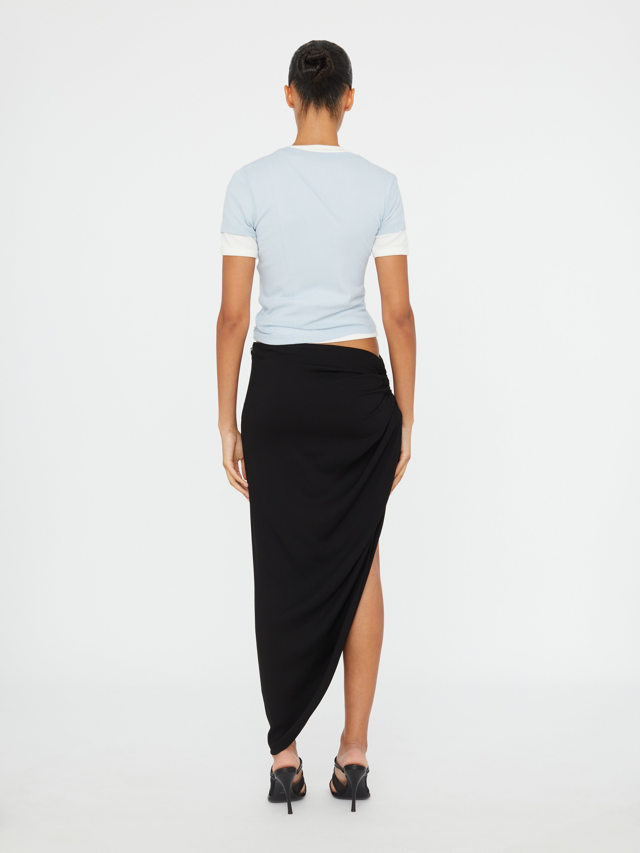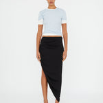 This asymmetrical tuck midi skirt effortlessly slices across the leg with draped detailing that trace the frame.