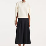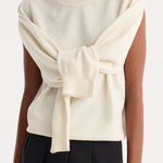 A modern twist on the classic crewneck, this piece features a playful, deconstructed open design with long sleeves that can be tied at the front for versatile styling. Crafted from a luxurious blend of merino wool and cashmere made by Italian mill Linsieme Filati, the double-layered construction offers both depth and effortless wearability.