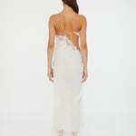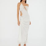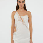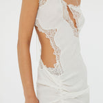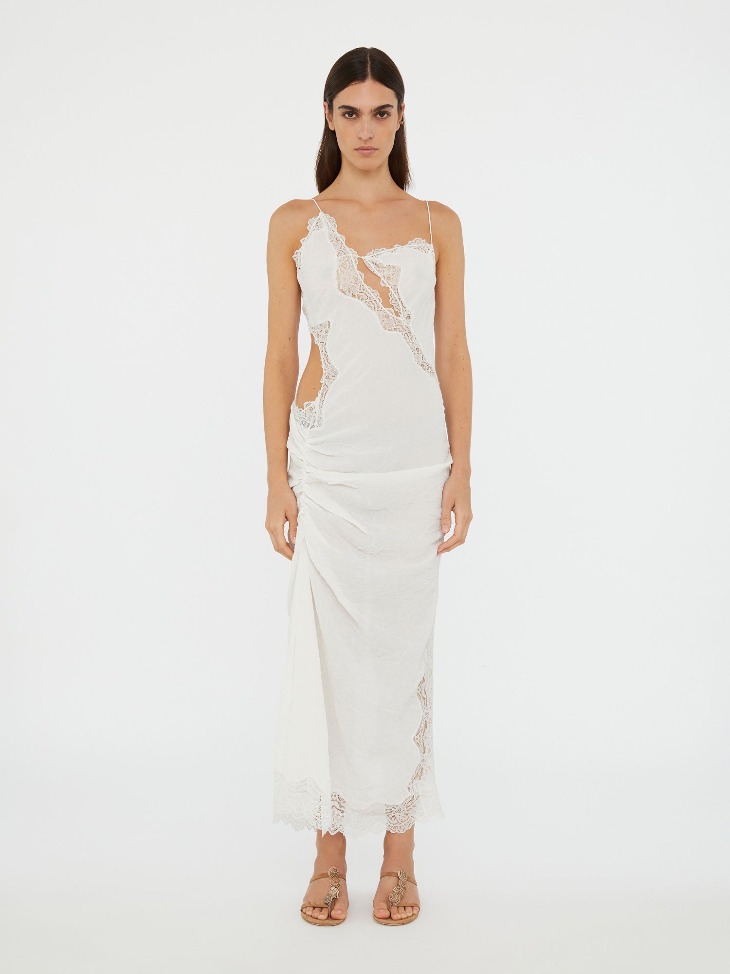 A dialogue between textures unfolds in crinkled crepe and sheer lace. Signature cut-out apertures are carved through the body, traced by lace panel inserts that reveal and conceal in measured balance. Finished with a gathered front detail.