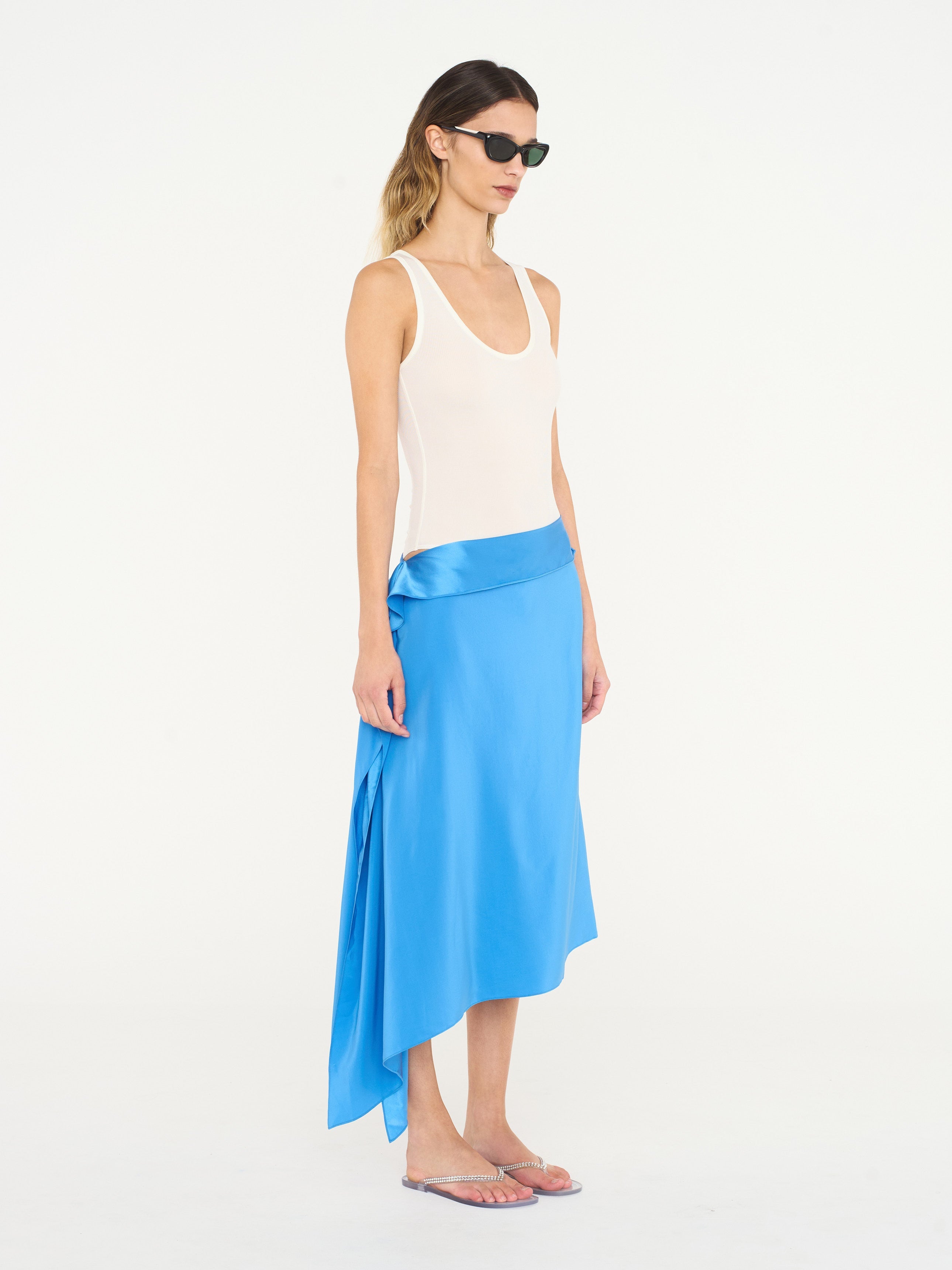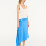Stimulating movement and pace. This asymmetrical silk panel midi skirt effortlessly slices across the waist with its panelled open edges that trace the frame.
