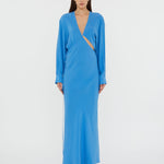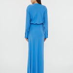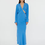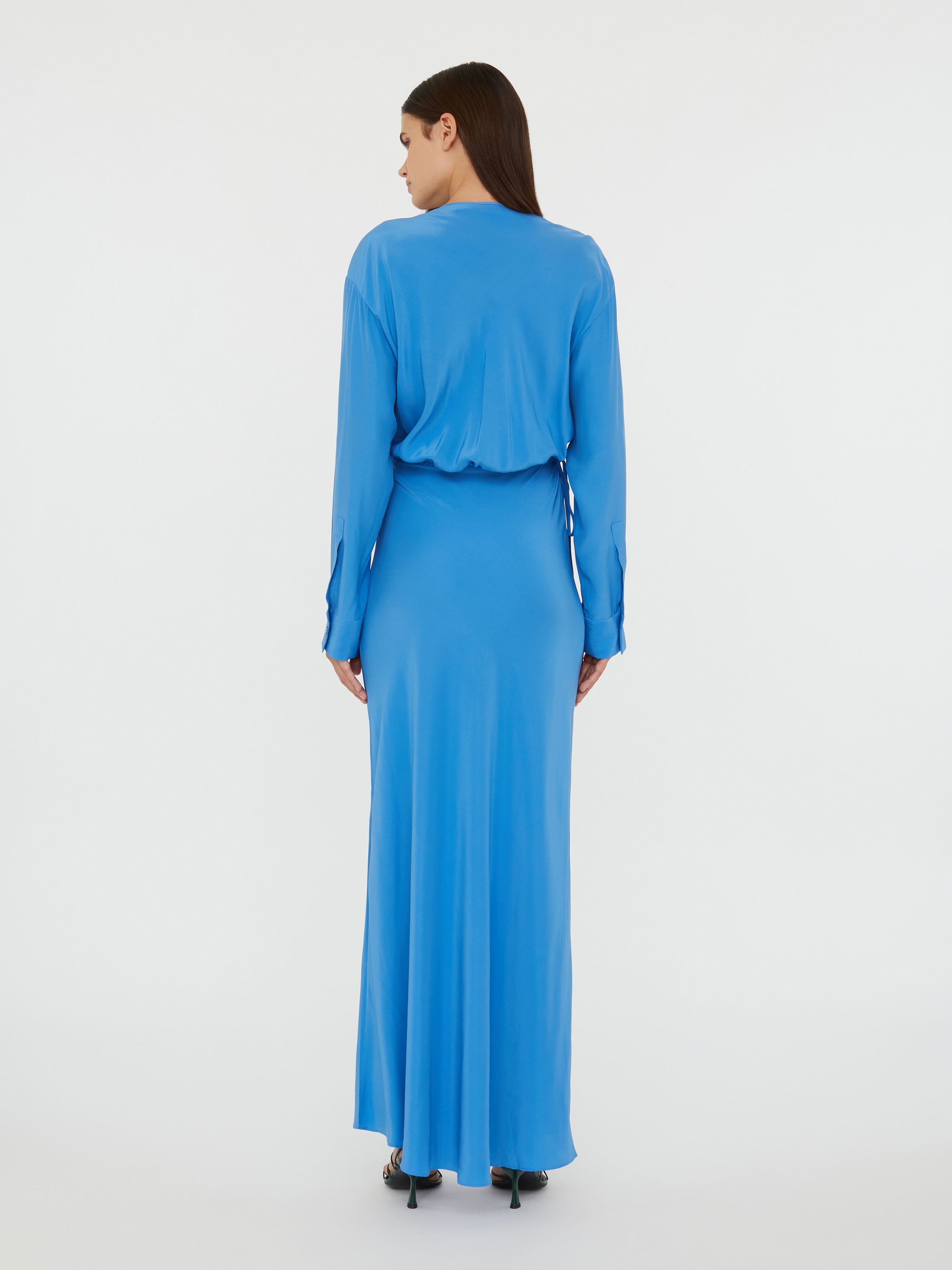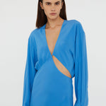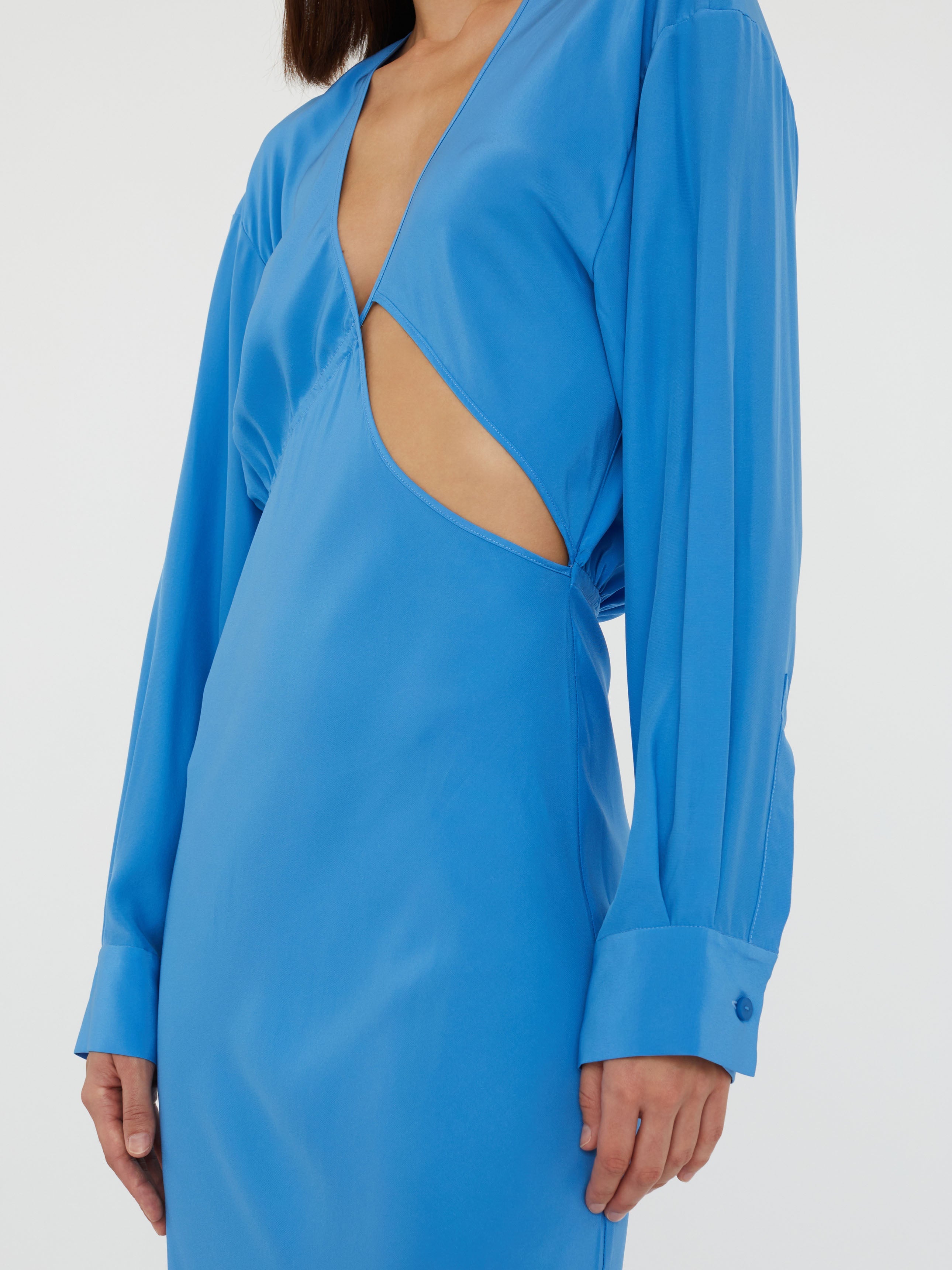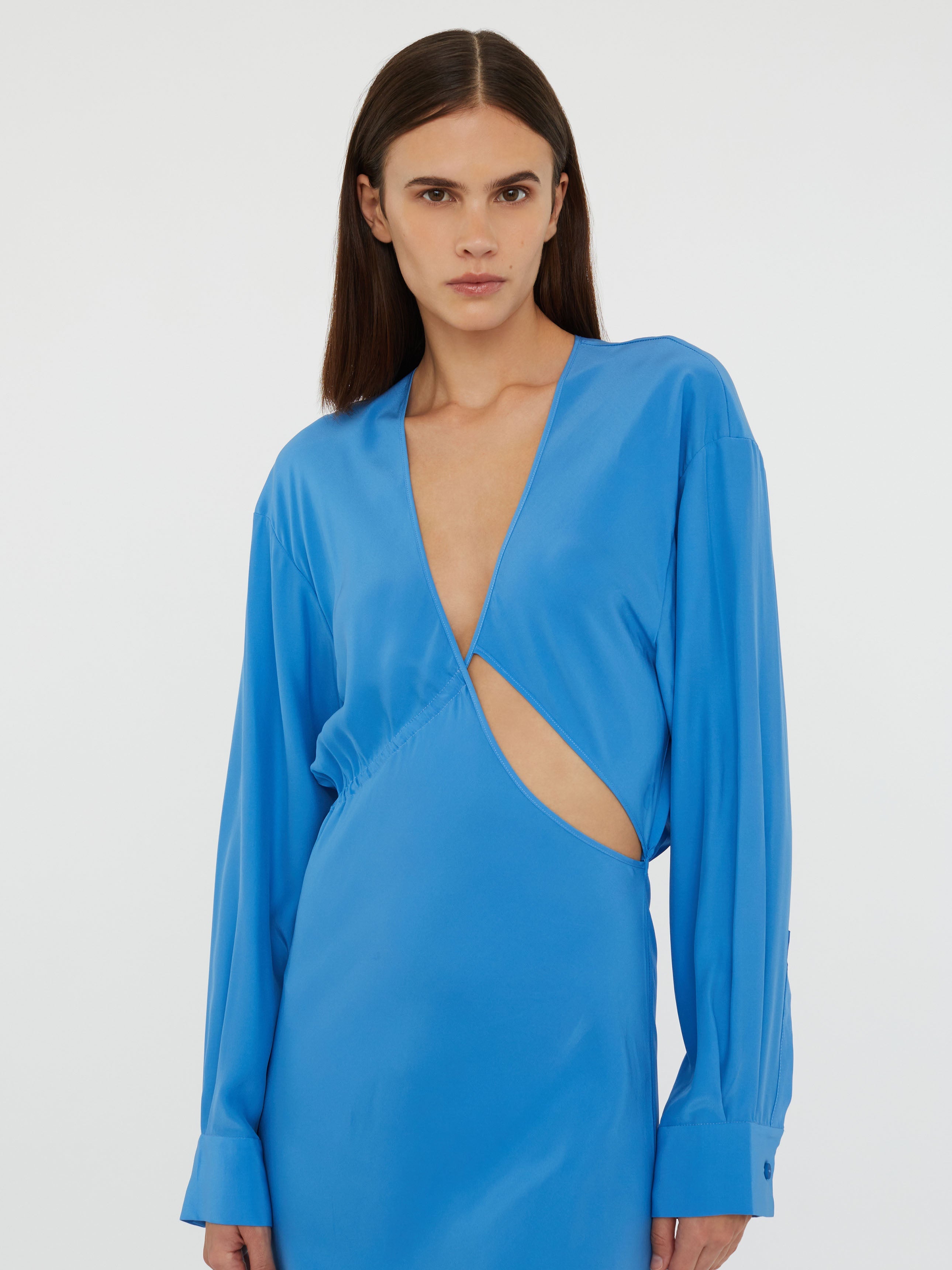 Blending structure and sensuality, this silky long sleeve silhouette reveals an intentional cut out that slices across the bodice. Gently ruched with adjustable ties that shape the waist.