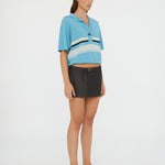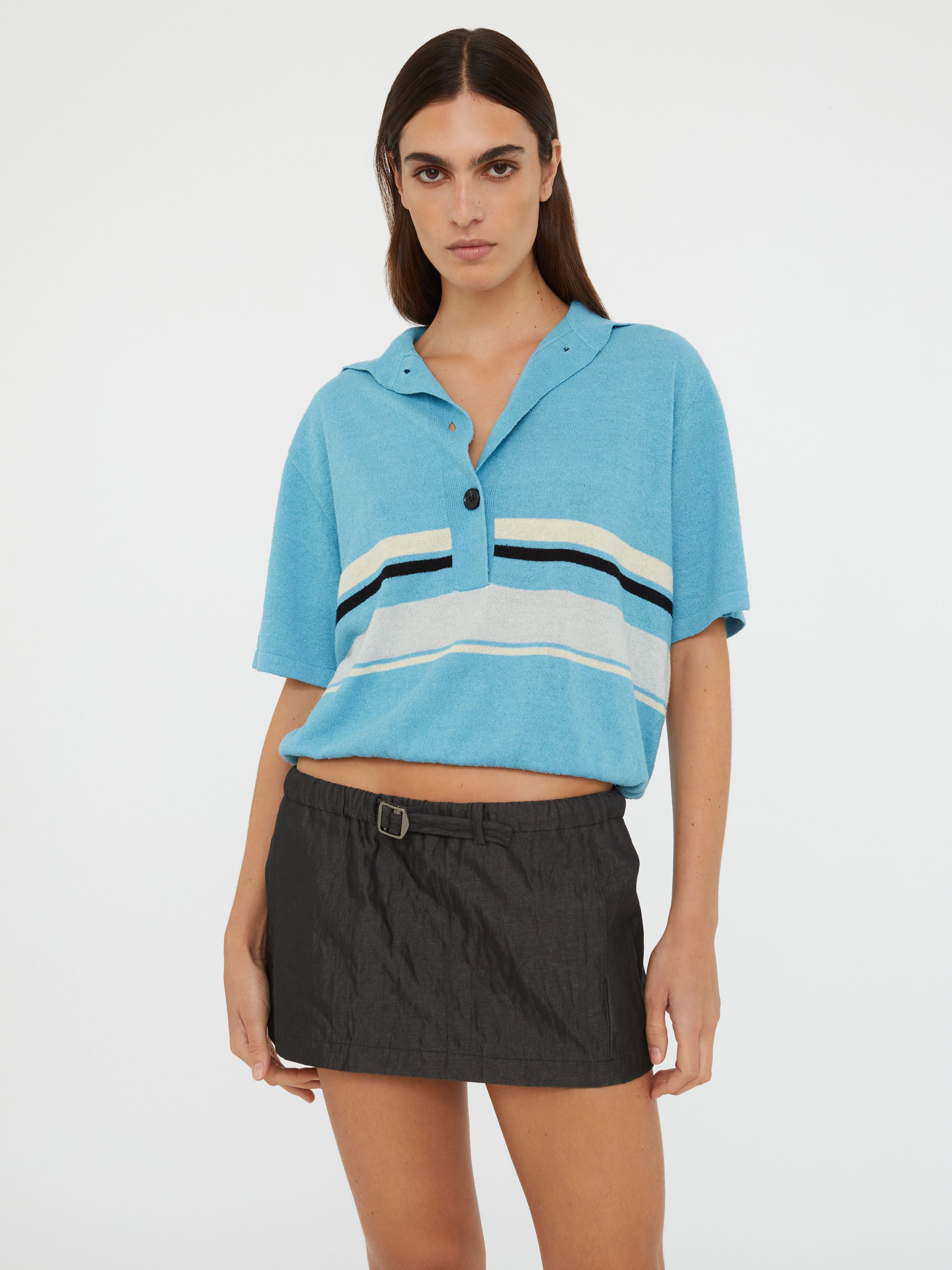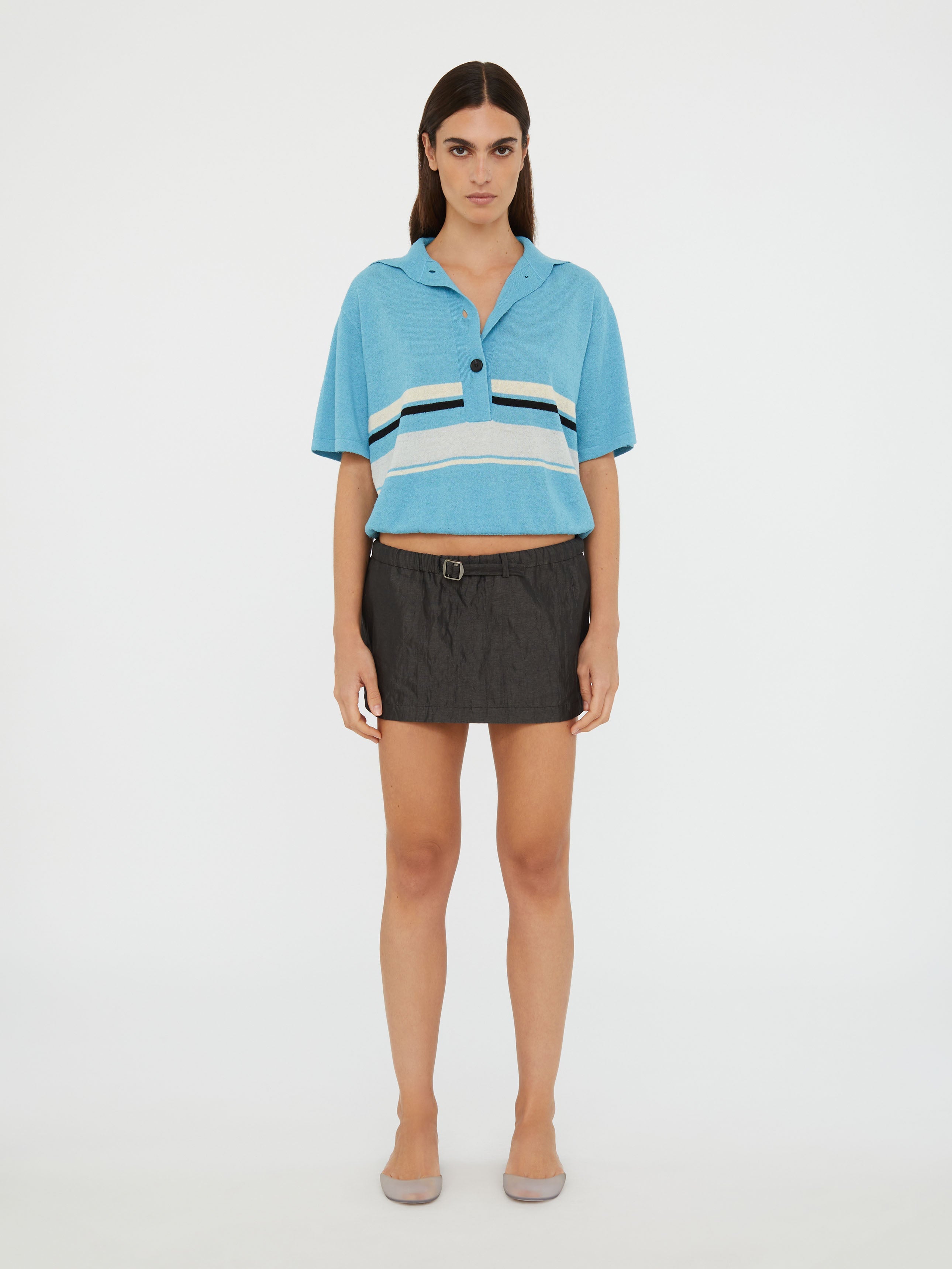A canvas of crushed cotton is refined by belt detailing and small buckle fastenings that punctuate the waist. This micro mini skirt sits low at the waist, infused with fine metal yarns that hold its crushed form.