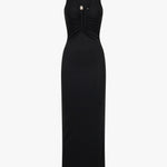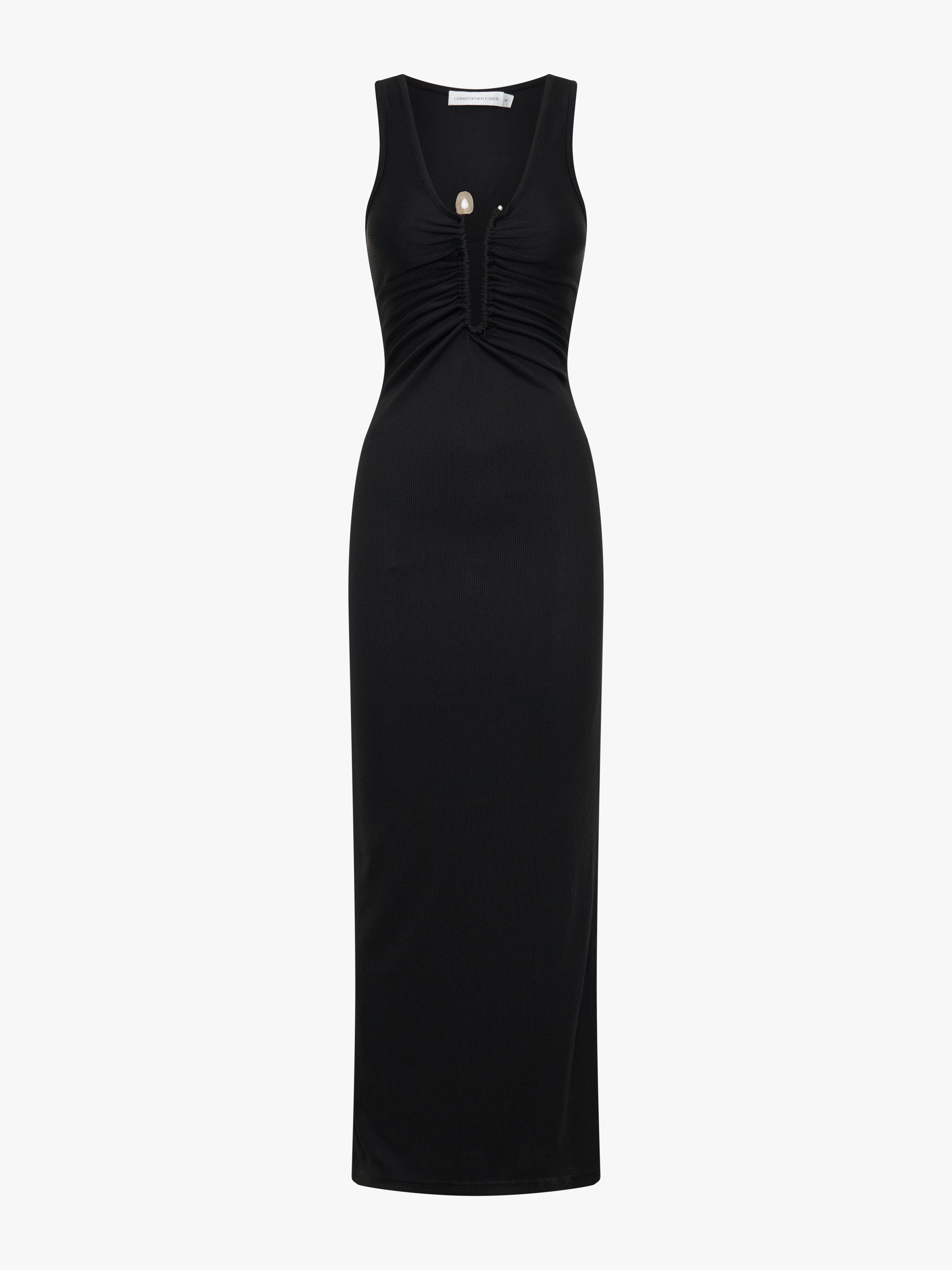 Crafted in compact rib jersey, the Crystal Pin Tank Dress skims the body with a form-fitting, maxi silhouette. A deep V-neckline and gathered bust detail frame the centre front cut-out, anchored by a bespoke natural stone pendant set in copper hardware.