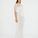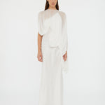 Layers of silk satin and georgette are composed and create a voluminous blouson bodice in this floor-length draped silhouette. Featuring the signature organic line, the Cumulus draped sleeve dress is carved through the waistline.