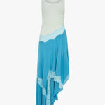 A panelled dress combining sheer rib jersey with fluid silk georgette and contrast lace insertions. Fitted through the body with gathered contouring at the waist, the silhouette flares into an asymmetric hemline trimmed in delicate lace - balancing softness with structure.