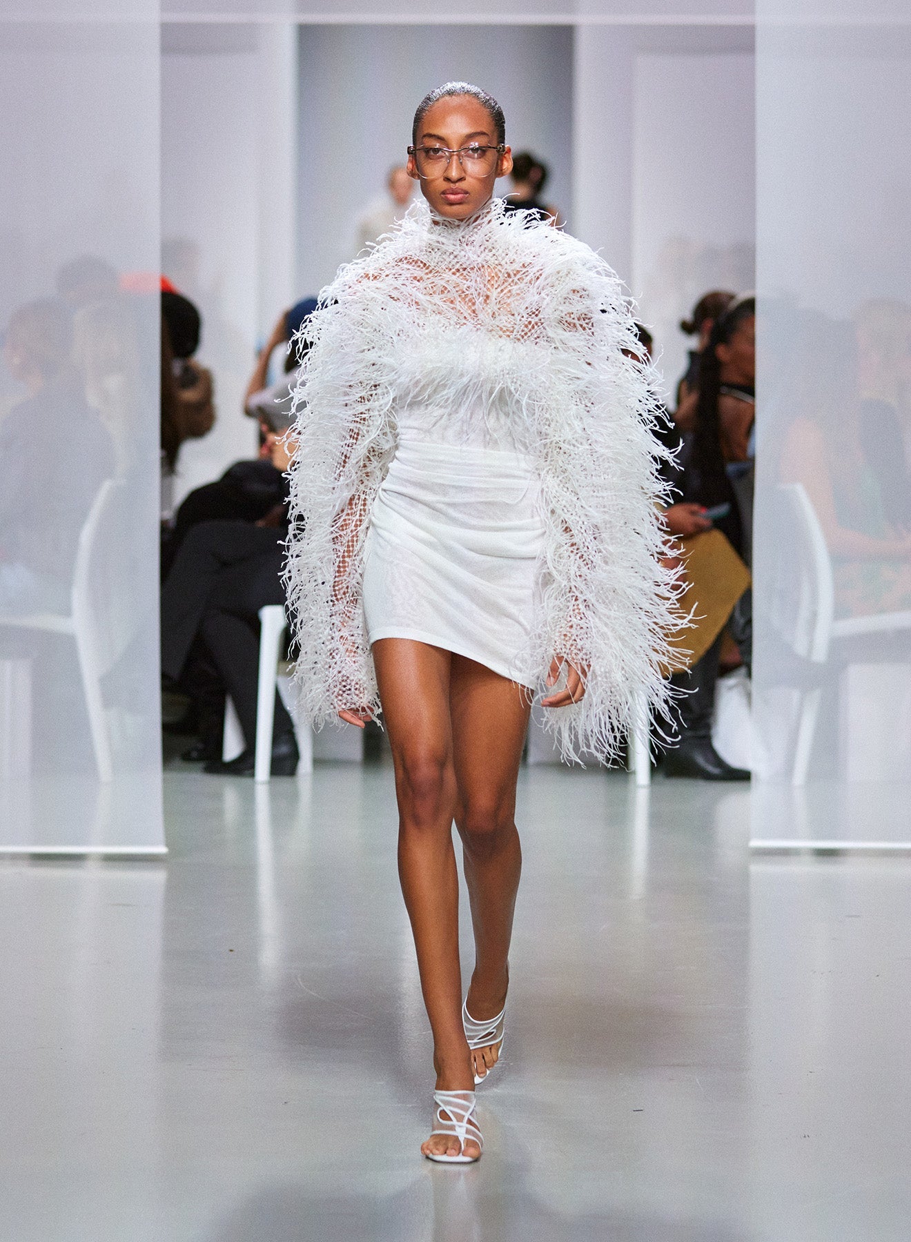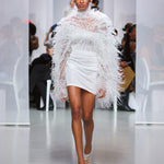 Lace netting is hand embroidered with single strands of Osterich feathers, anchored by seed beads. 28 artisans spent 9 days to complete the embroidery that makes up these spectacular pieces - evoking lightness and nostalgia.