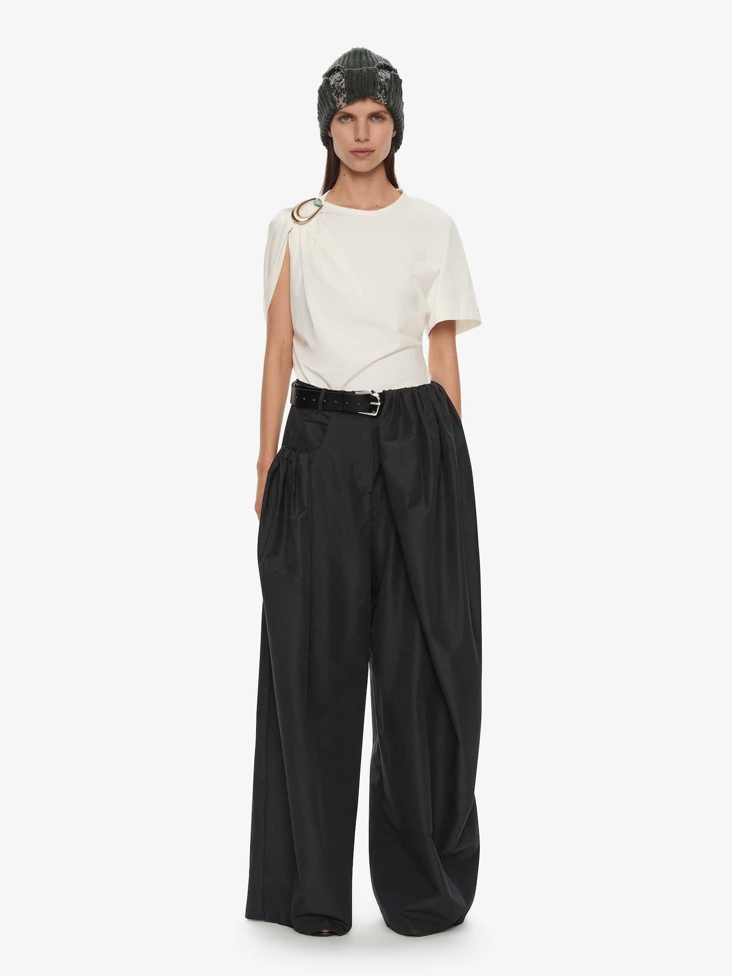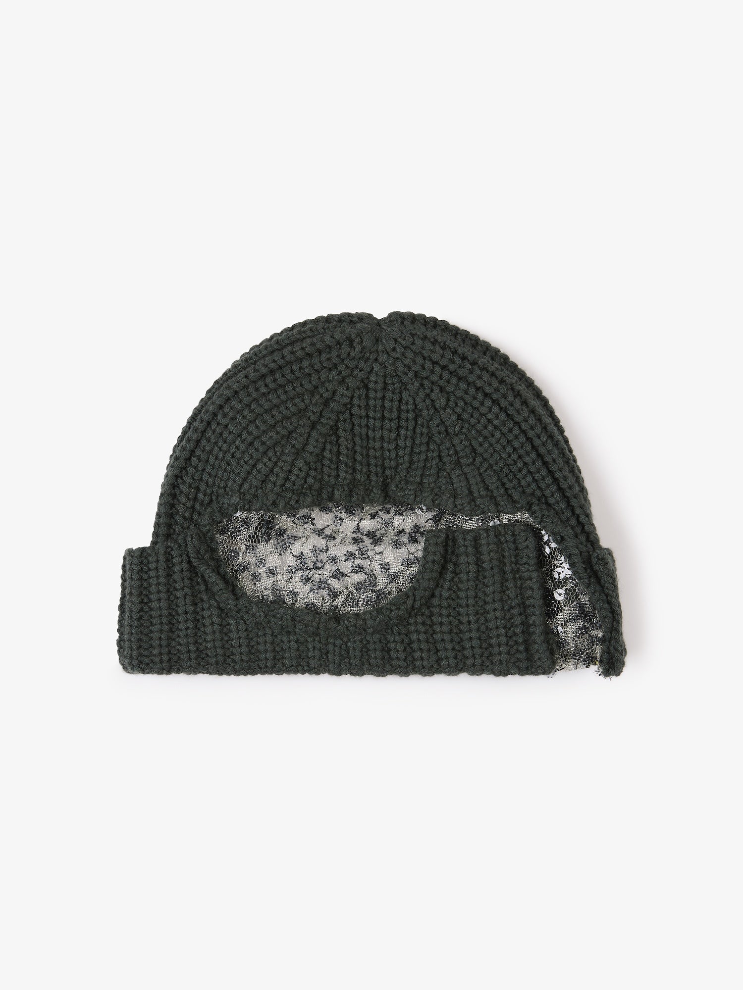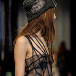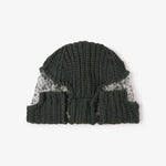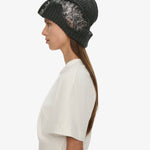 The Deconstruct Sequin Beanie is knitted in a cashmere–silk blend, interrupted by a sequinned lace insert that cuts through the crown in layered contrast. A study in texture, the silhouette offsets soft knit with reflective embellishment.